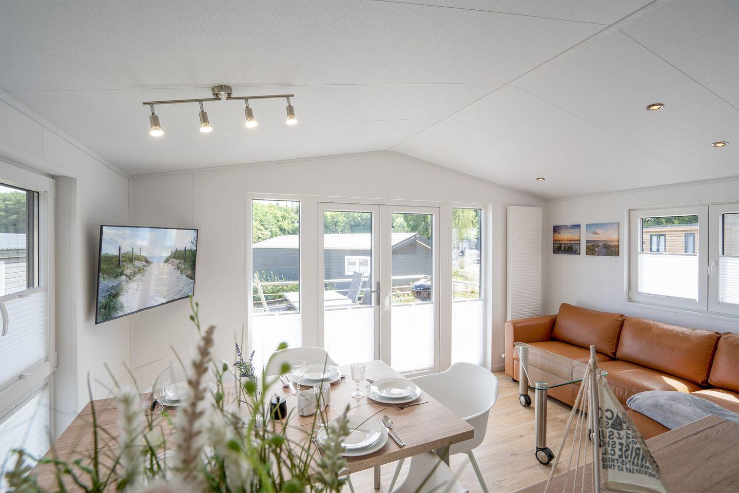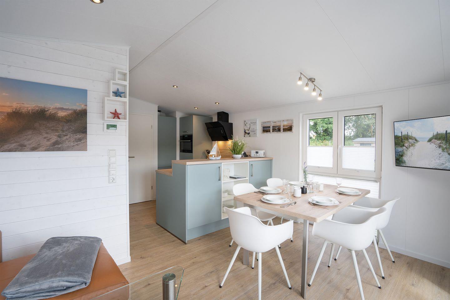 Sowohl im Wohn- und Essbereich als auch im Hauptschlafzimmer befindet sich ein Flachbild-TV. Das Ferienhaus bietet ein Hauptschlafzimmer mit Doppelbett (160x200cm, offenes Fußende), das zweite Schlafzimmer ein Etagenbett (Liegefläche oben 80x200cm, Liegefläche unten 140x200cm). Ein modernes Duschbad mit bodengleicher Dusche sorgt für morgendliche Erfrischung.