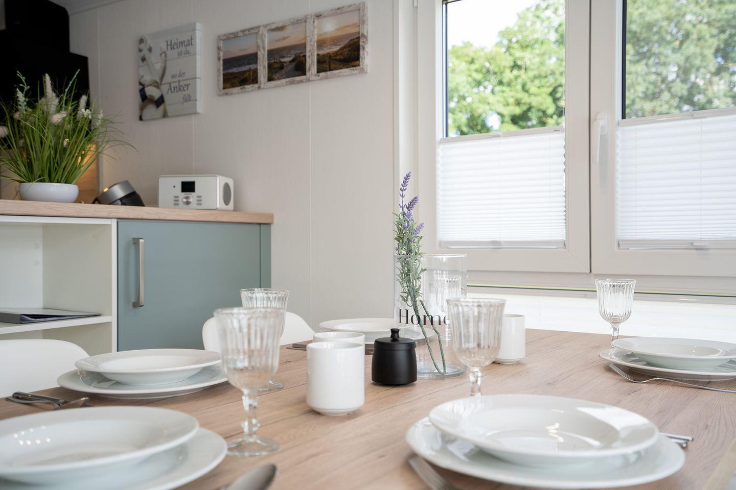 Die Küche bietet eine sehr umfangreiche Ausstattung. Hier können Sie auch aufwendigere Gerichte zaubern. Neben einem Cerankochfeld mit 4 Herdplatten, einem Kombigerät mit Backofen- und Mikrowellenfunktion, einem großen Kühlschrank samt Eisfach über eine Senseo-Kaffeemaschine, Toaster und Wasserkocher, bis hin zum Mixer und Kuchenform ist alles vorhanden. Geschirr, Besteck und Küchenhelfer gibt es im Überfluss.