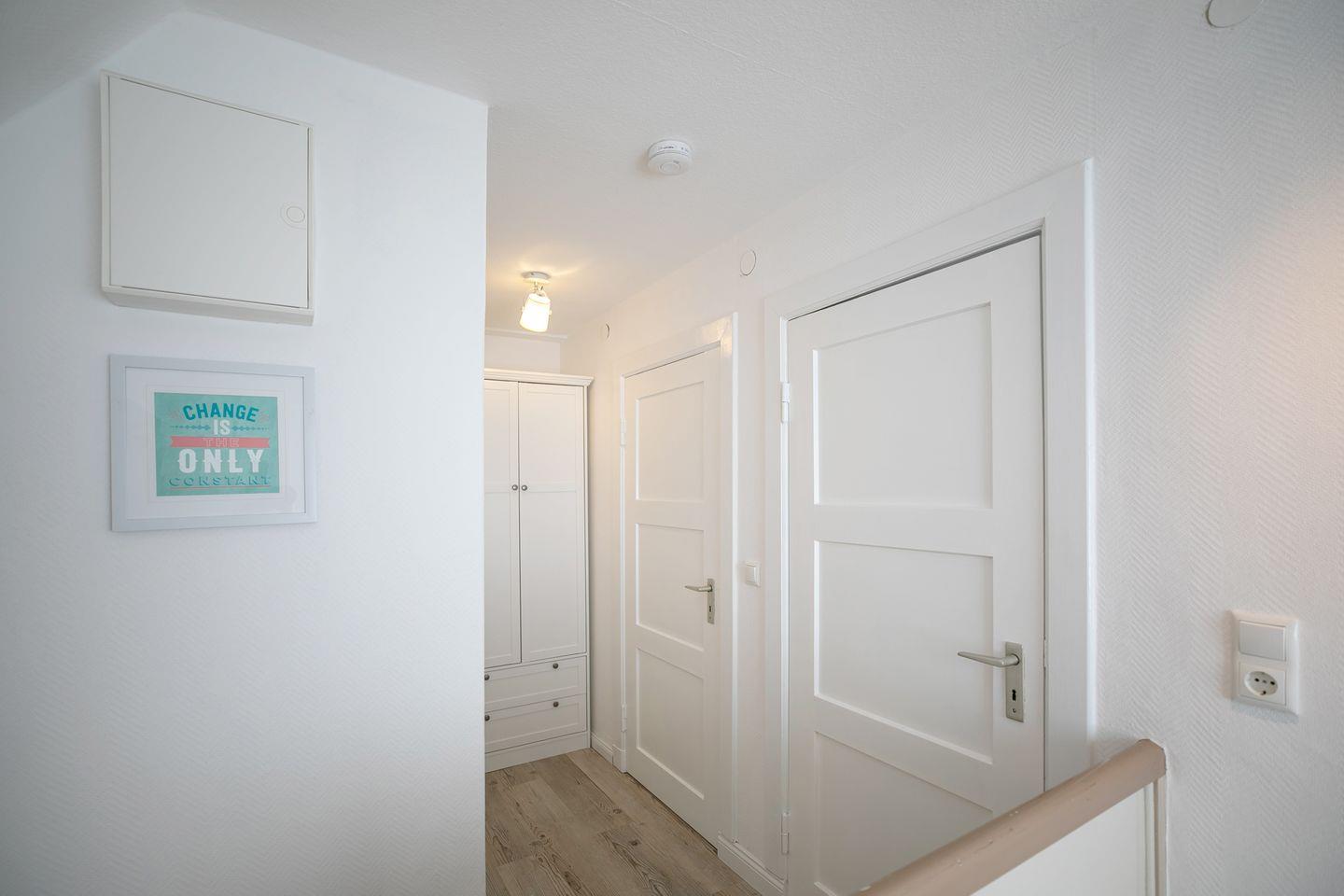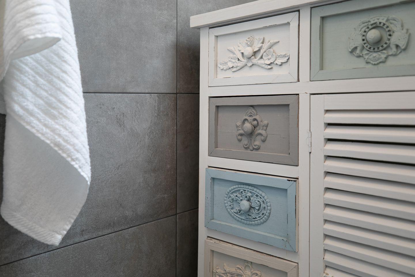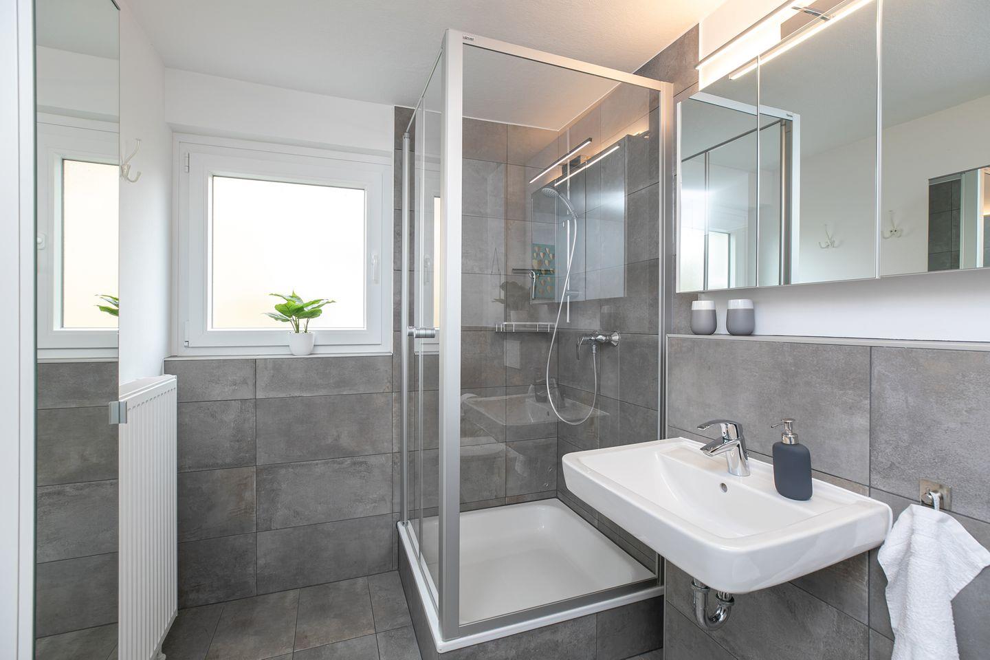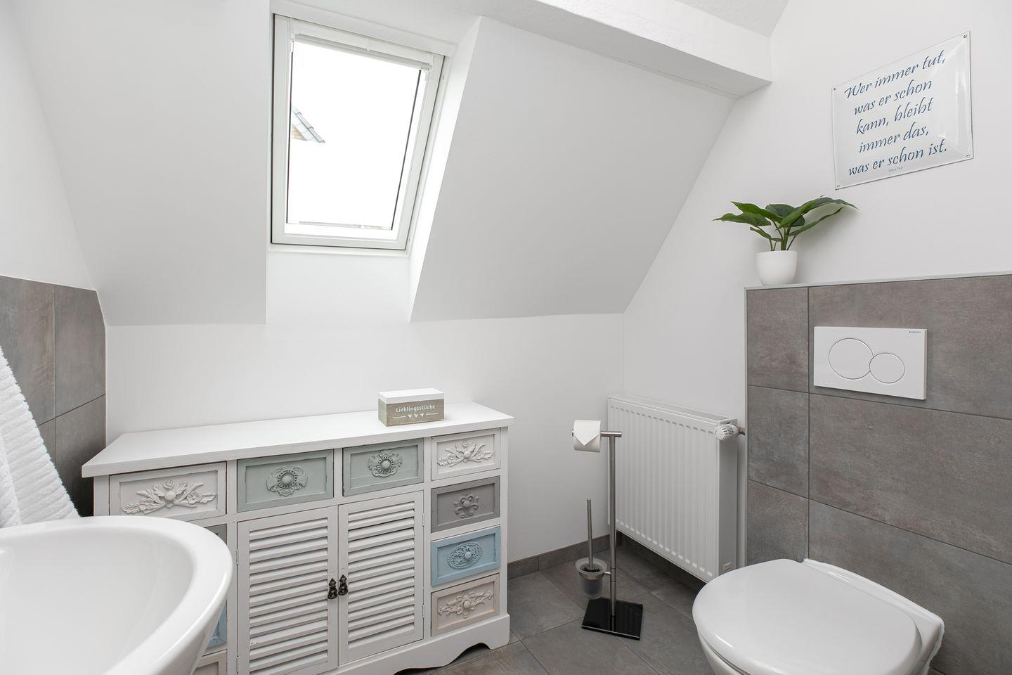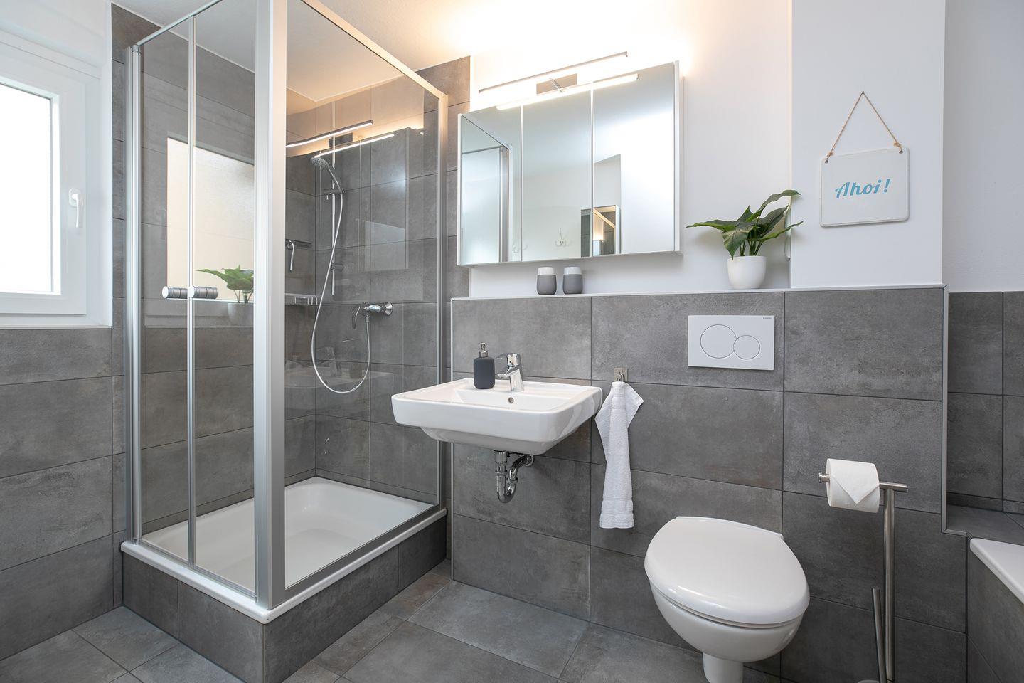 Auf der ersten Etage befinden sich zwei separate Schlafzimmer, jeweils mit gemütlichen Doppelbetten (je 2x 90x200 cm), perfekt für ruhige Nächte. Ein zusätzliches Gäste-WC befindet sich ebenfalls auf dieser Etage. Die Badezimmer im Erdgeschoss sowie das Gäste-WC im ersten Stock sind stilvoll mit grauen Schieferfliesen und weißen Badezimmermöbeln gestaltet, was Luxus und Komfort ausstrahlt.