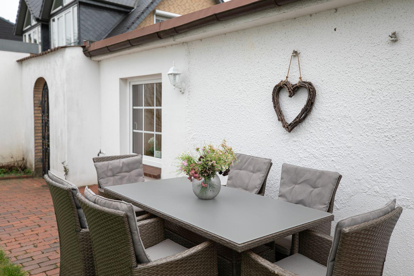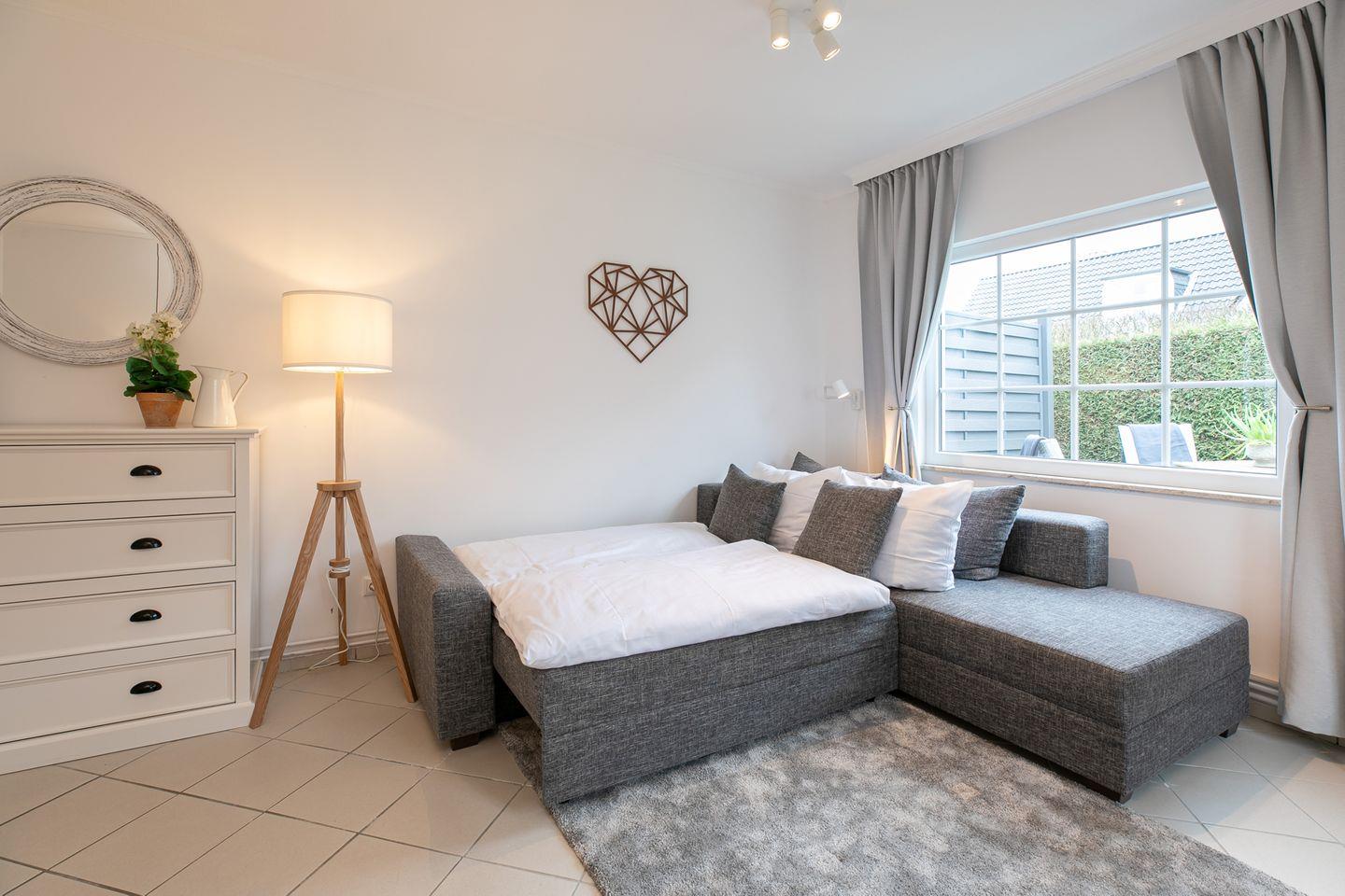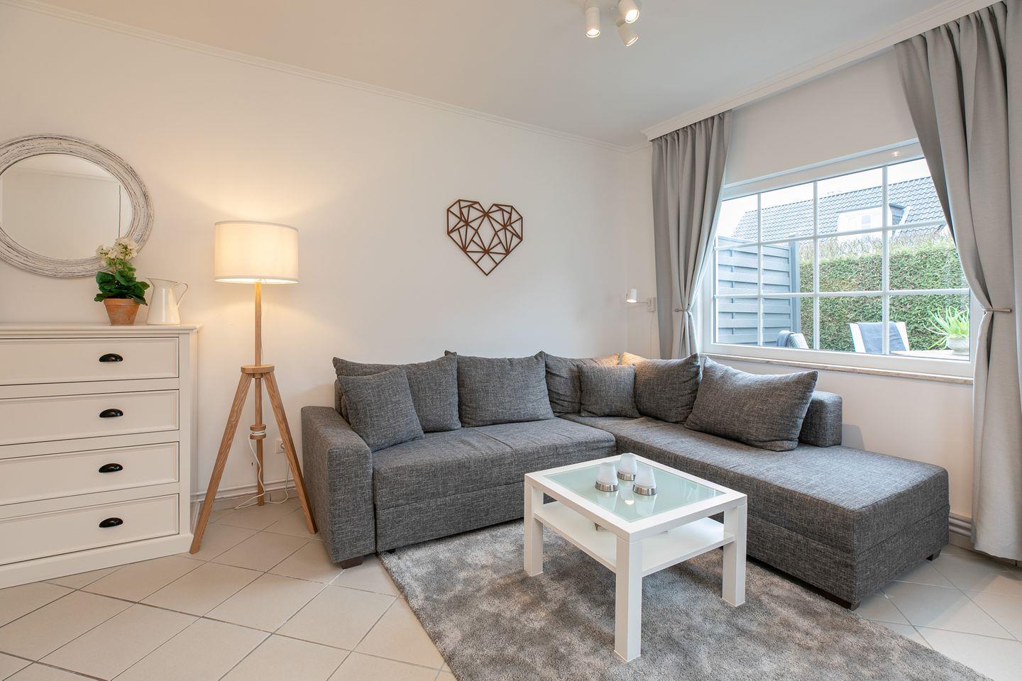Die Erdgeschossebene beherbergt eine komplett ausgestattete Küche sowie ein Badezimmer mit Dusche, WC und Waschbereich. Die moderne Küche punktet mit Annehmlichkeiten wie einer Spülmaschine, einem Kühlschrank mit Gefrierfach und einem Backofen. Der großzügige und hochwertige Ecksofa-Bereich mit Schlaffunktion (140x180 cm) lädt zum Entspannen ein und verspricht dank kostenfreiem WLAN-Anschluss, Flachbild-TV und DVD-Player erstklassige Unterhaltung. Der Essbereich im Wohnzimmer lädt zu geselligen Mahlzeiten ein, während die möblierte Terrasse im Sommer perfekt für Grillabende oder entspannte Sonnenuntergänge nach einem Tag am Strand geeignet ist. Das gesamte Interieur besticht durch helle, moderne Gestaltung und geschmackvolle Details, die eine behagliche Atmosphäre schaffen.