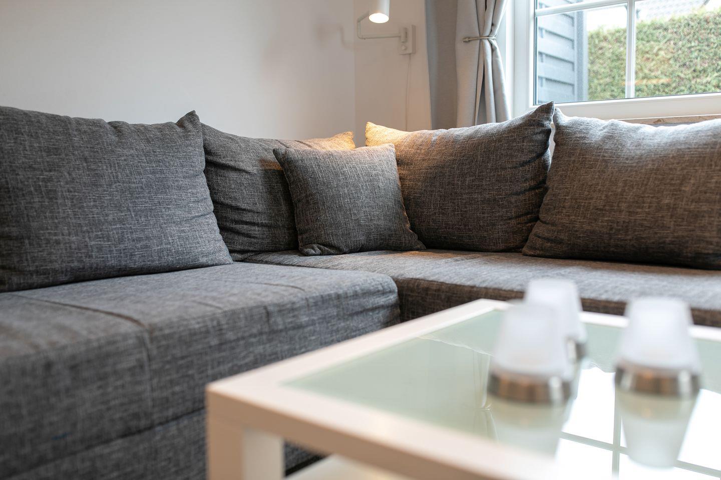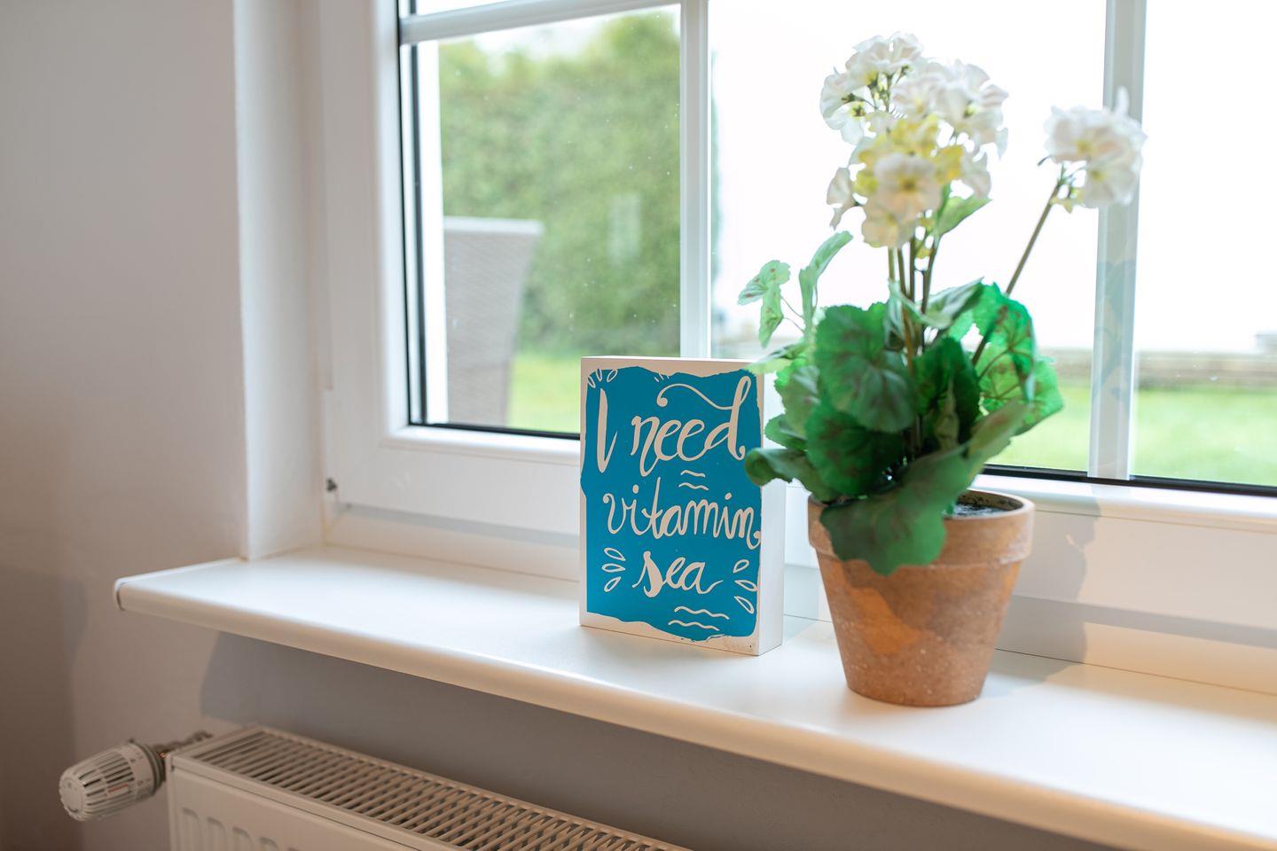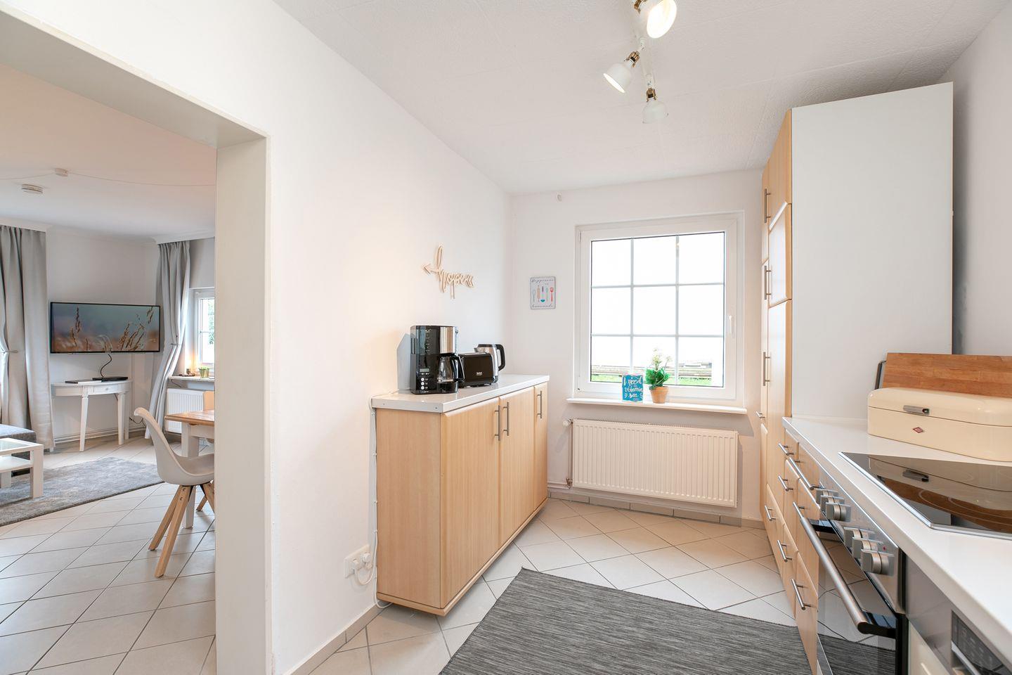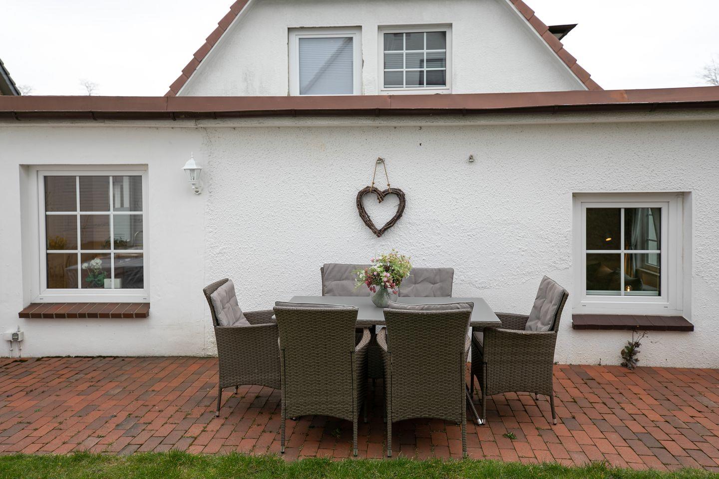 Die Erdgeschossebene beherbergt eine komplett ausgestattete Küche sowie ein Badezimmer mit Dusche, WC und Waschbereich. Die moderne Küche punktet mit Annehmlichkeiten wie einer Spülmaschine, einem Kühlschrank mit Gefrierfach und einem Backofen. Der großzügige und hochwertige Ecksofa-Bereich mit Schlaffunktion (140x180 cm) lädt zum Entspannen ein und verspricht dank kostenfreiem WLAN-Anschluss, Flachbild-TV und DVD-Player erstklassige Unterhaltung. Der Essbereich im Wohnzimmer lädt zu geselligen Mahlzeiten ein, während die möblierte Terrasse im Sommer perfekt für Grillabende oder entspannte Sonnenuntergänge nach einem Tag am Strand geeignet ist. Das gesamte Interieur besticht durch helle, moderne Gestaltung und geschmackvolle Details, die eine behagliche Atmosphäre schaffen.