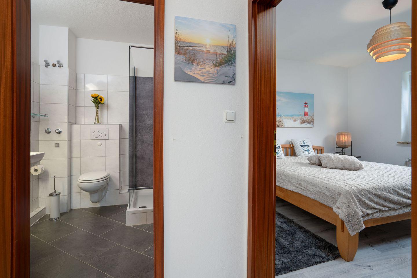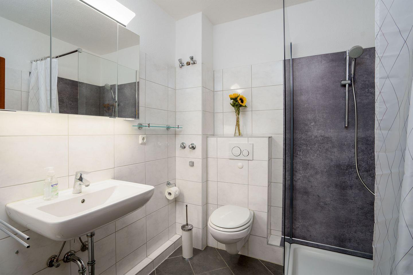 - Badezimmer: Bad mit Dusche, WC und Waschbecken, ein Fön ist ebenfalls vorhanden.