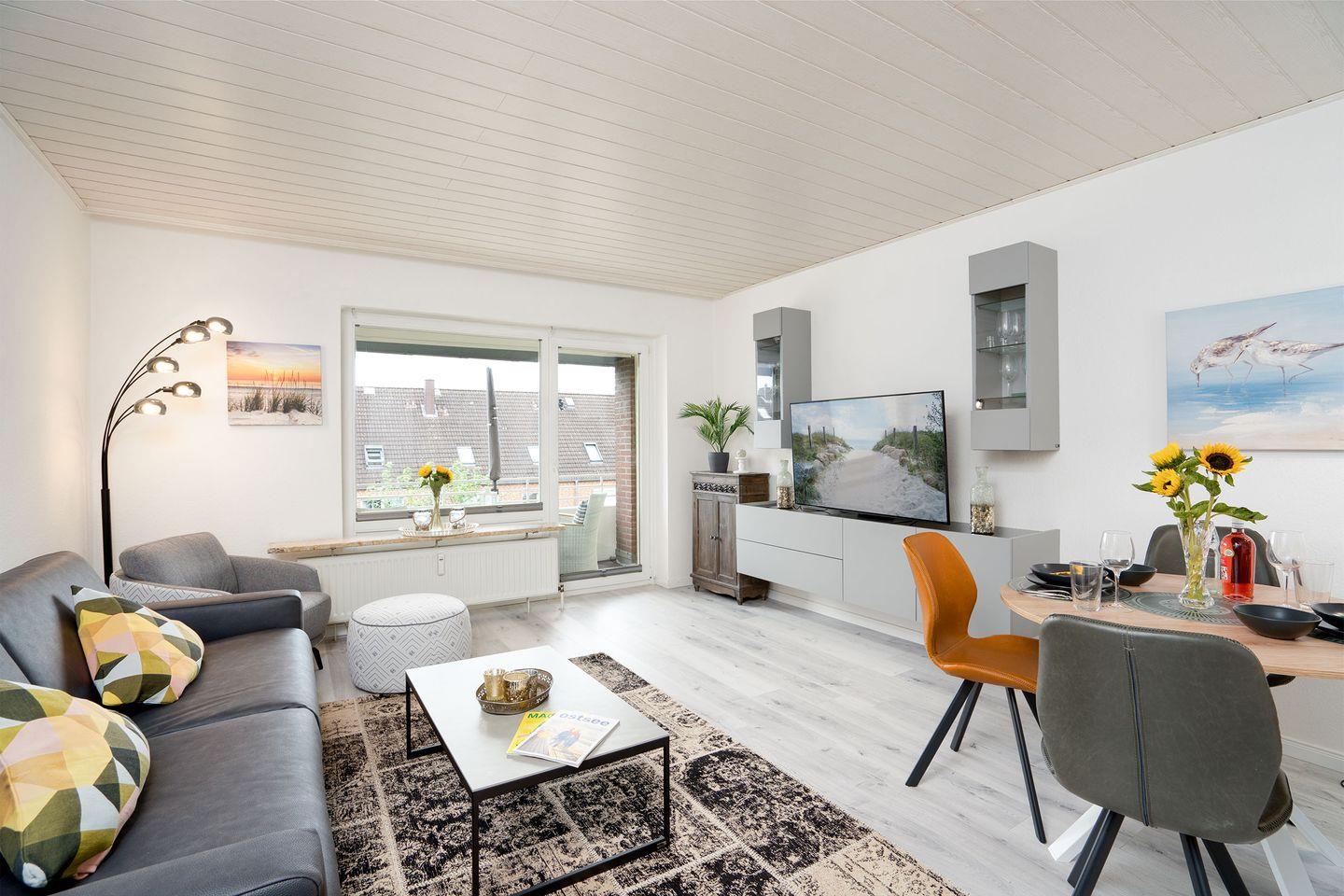 - Wohnbereich: Ein behagliches Wohnzimmer mit einem Ledersofa, Fernseher und Zugang zu einem kleinen Balkon.