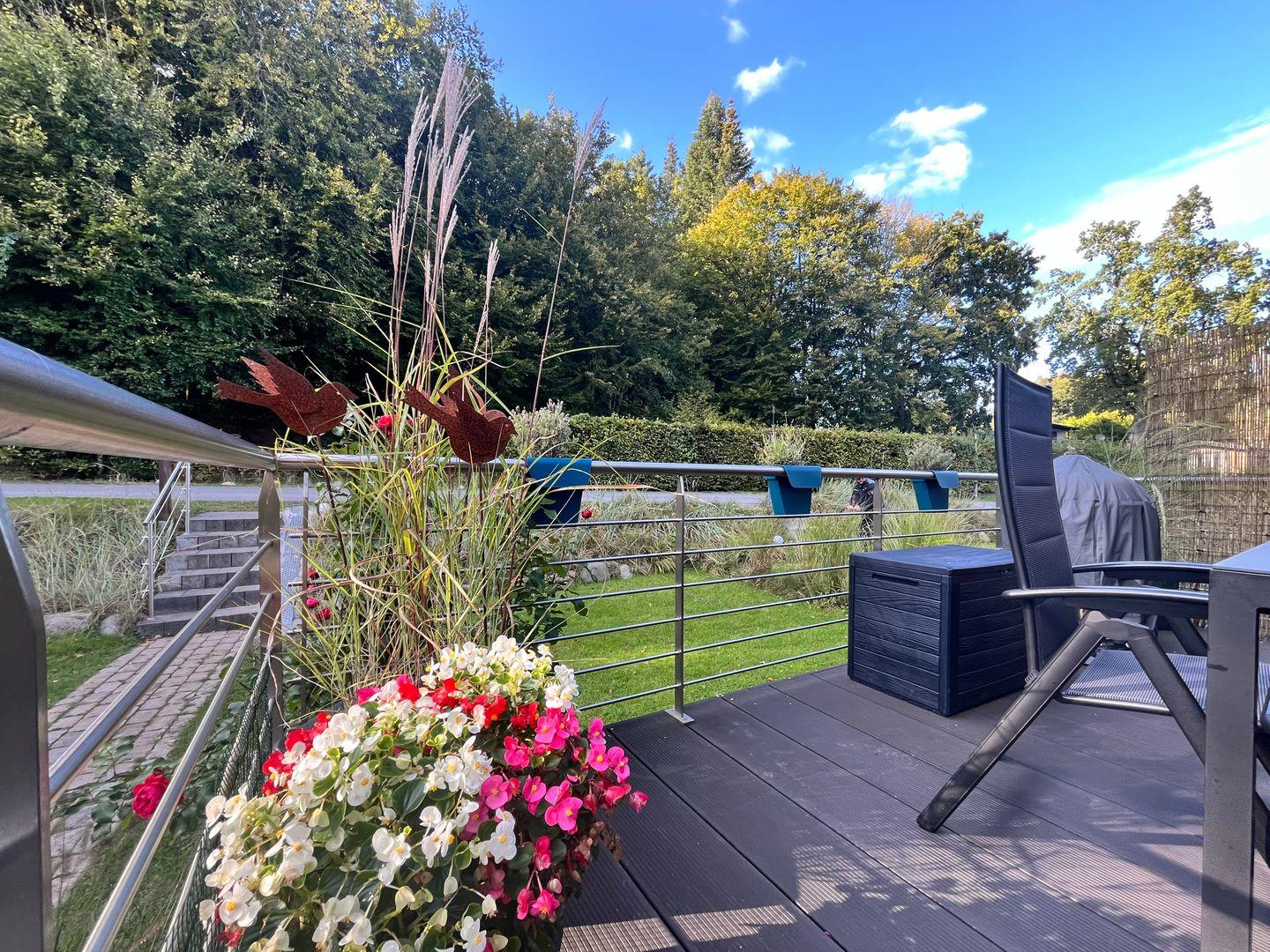 Vom Wohnbereich betreten Sie die große Terrasse mit überdachter Veranda und großzügigem Essplatz. Von dort gelangen Sie in den Garten mit Tisch und Sitzbänken. Dort besteht auch die Möglichkeit zu grillen.