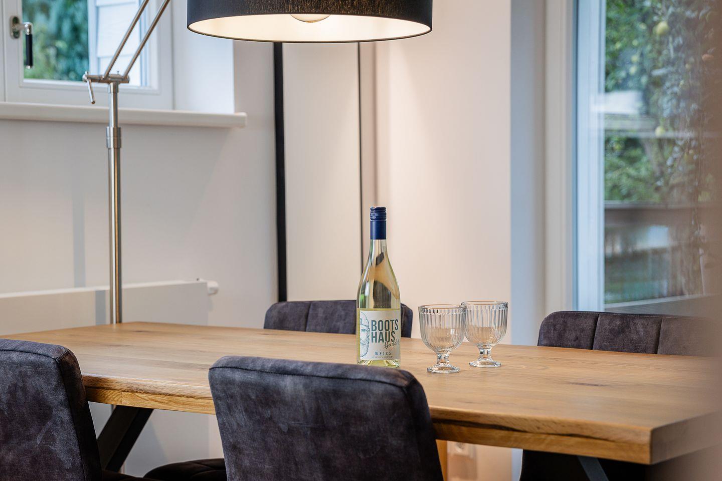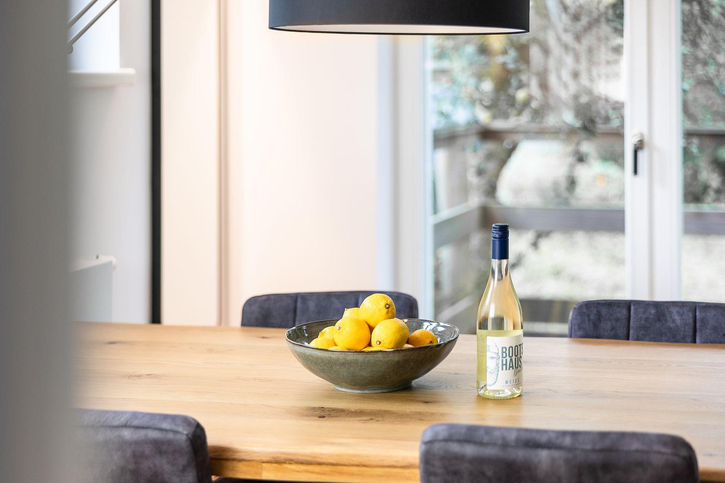 Das Strandgold befindet sich im Hochparterre eines modernen und stilvollen Hauses. Die Wohnung ist in hellen, freundlichen Farben und mit skandinavisch inspiriertem Design eingerichtet, was eine einladende und entspannte Atmosphäre schafft. Hochwertige Parkettböden verleihen den Räumen eine warme und behagliche Note.