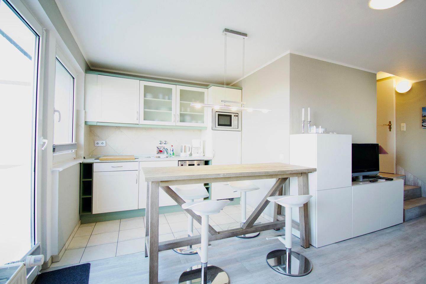 Im offenen Wohn- und Essbereich im Erdgeschoss finden Sie eine moderne Einrichtung, die zu gemütlichen Abenden einlädt. Die gut ausgestattete Küche bietet Ihnen alles, was Sie brauchen, um leckere Mahlzeiten zu zaubern – ob Frühstück, Mittagessen oder ein entspannter Abend mit Freunden. Der Wohnbereich ist zudem mit einer bequemen Schlafcouch ausgestattet (140x200 cm), die sich bei Bedarf in ein zusätzliches Bett für zwei Personen verwandeln lässt.
