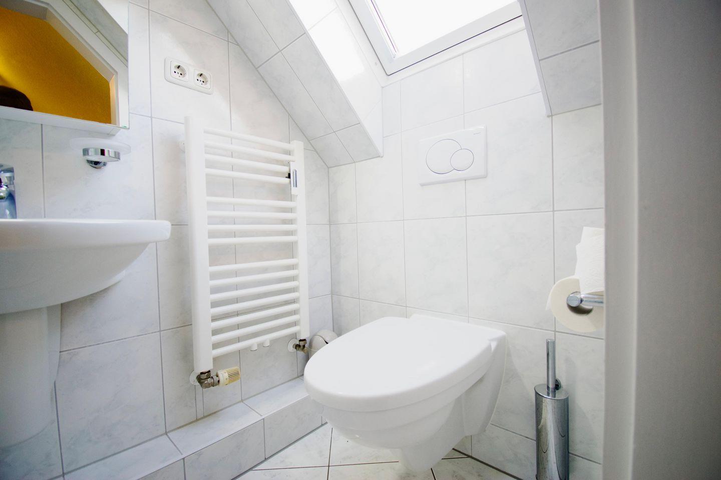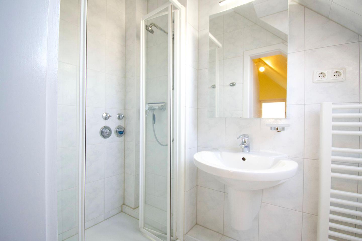 Das moderne Badezimmer ist mit einer komfortablen Dusche ausgestattet und rundet das durchdachte Raumkonzept der Wohnung ab. Zudem stehen Ihnen kostenfreies WLAN und ein eigener Stellplatz direkt vor dem Haus zur Verfügung.