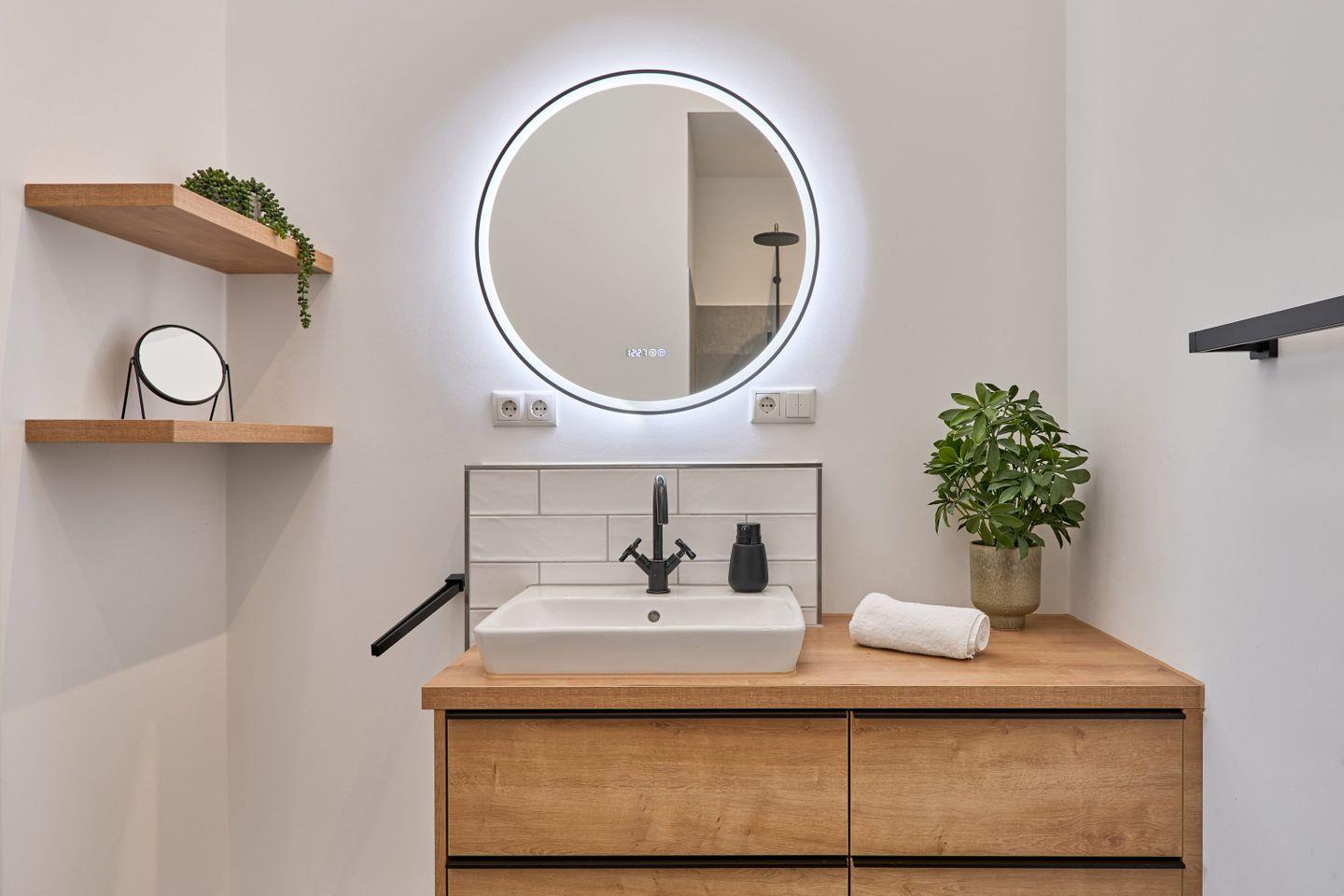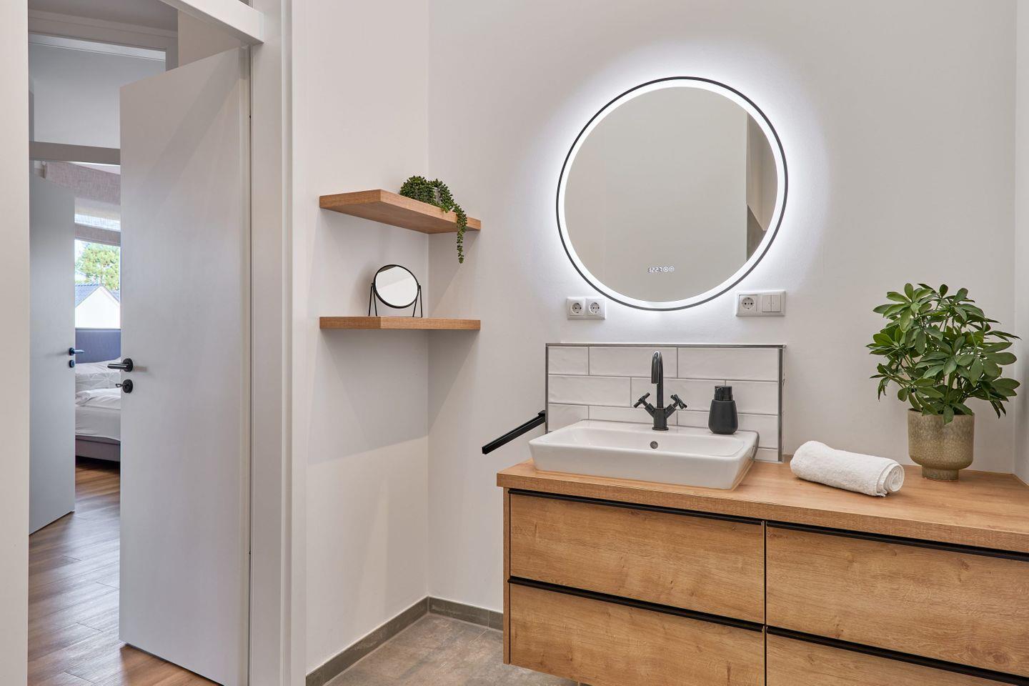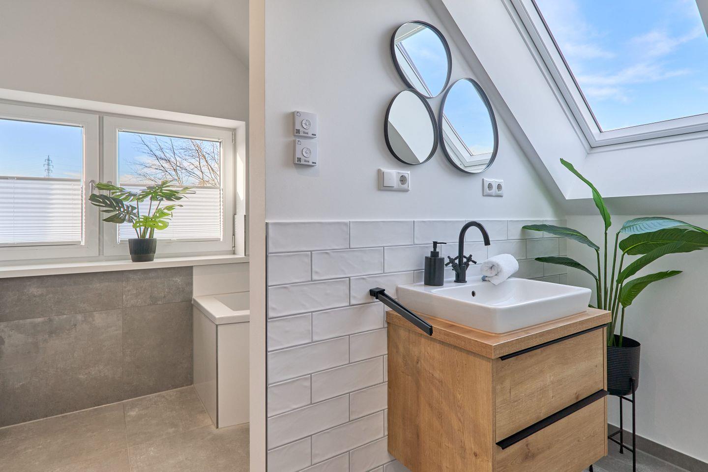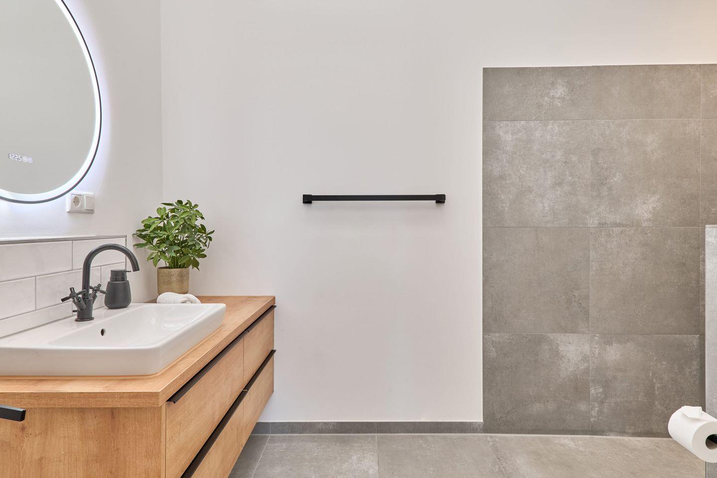 Zwei stilvolle Badezimmer in neutralen Naturtönen machen die Wohnung zu einer kleinen Wohlfühloase: Das größere Bad bietet eine Badewanne und eine separate Dusche, das zweite Bad ist mit einer geräumigen Dusche ausgestattet. In beiden Badezimmern stehen Pflanzen, die für eine beruhigende Atmosphäre sorgen.