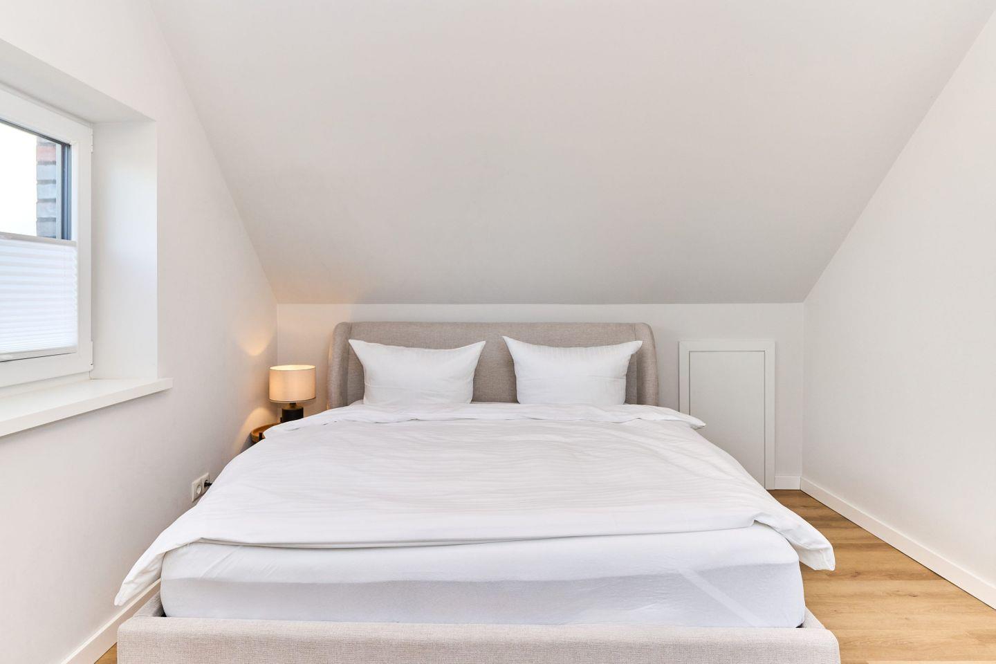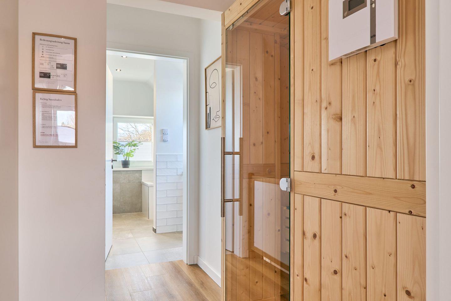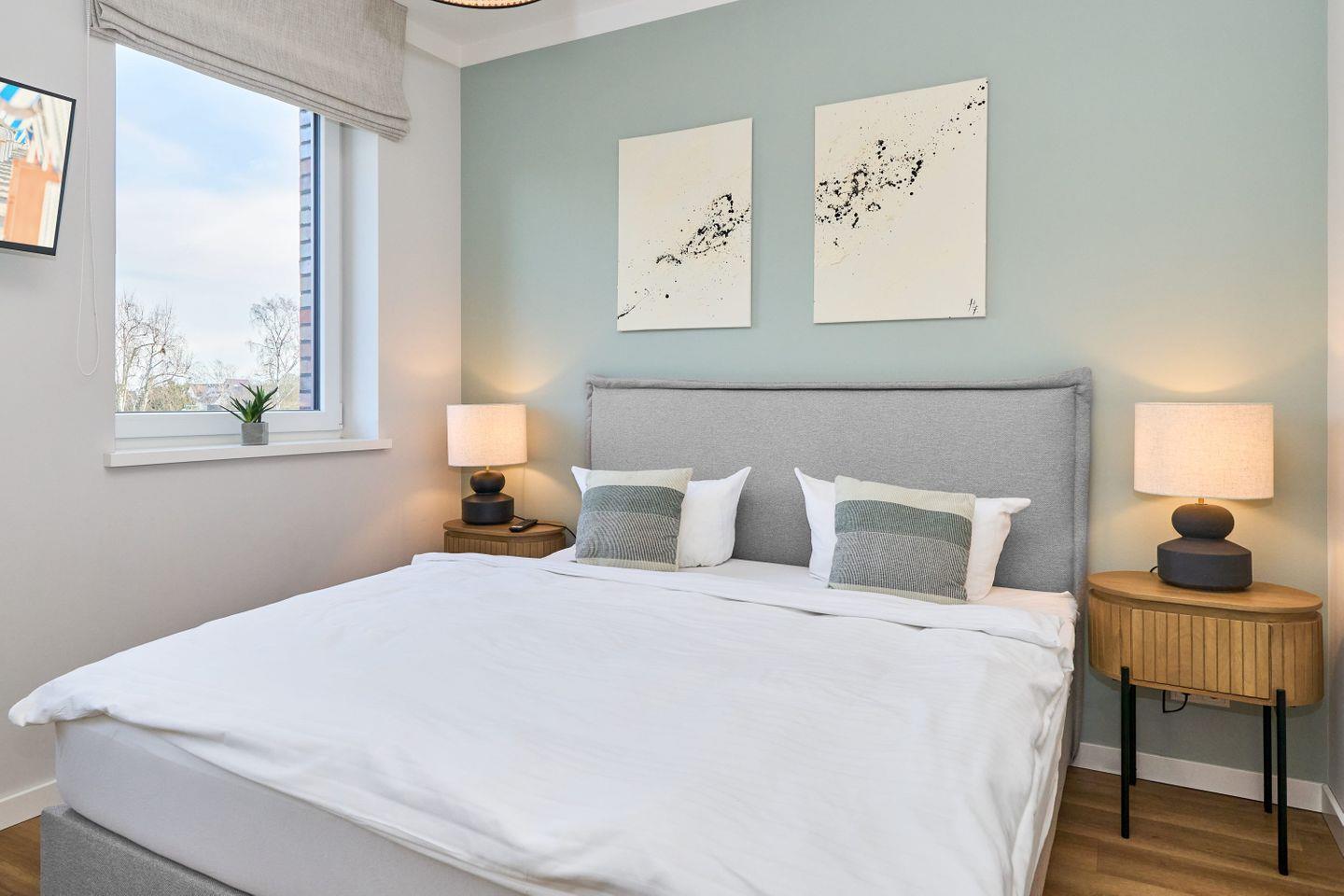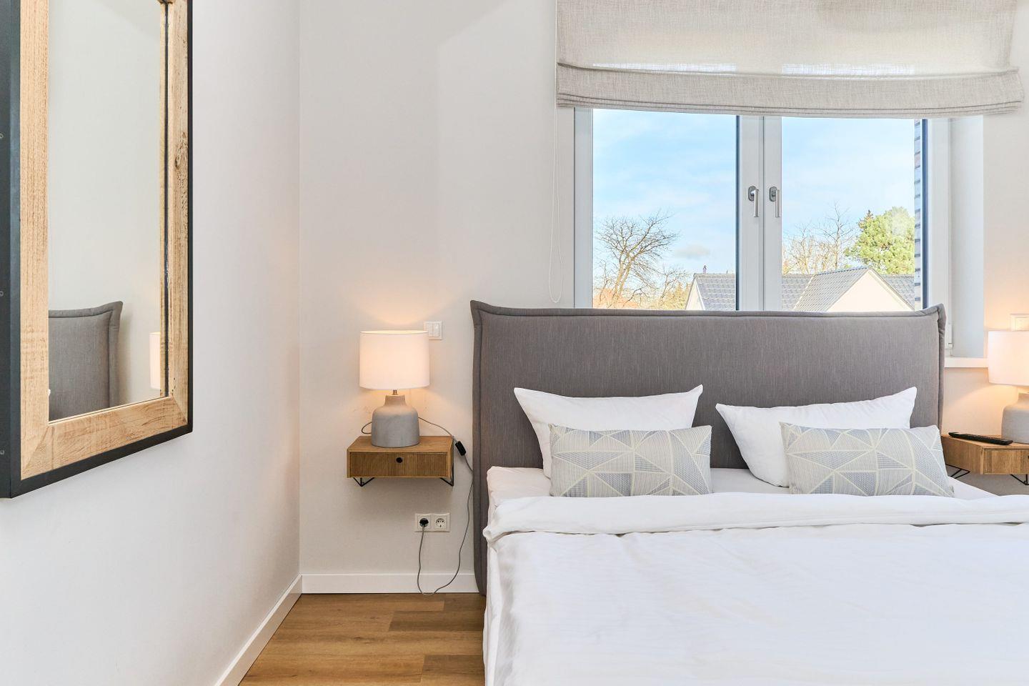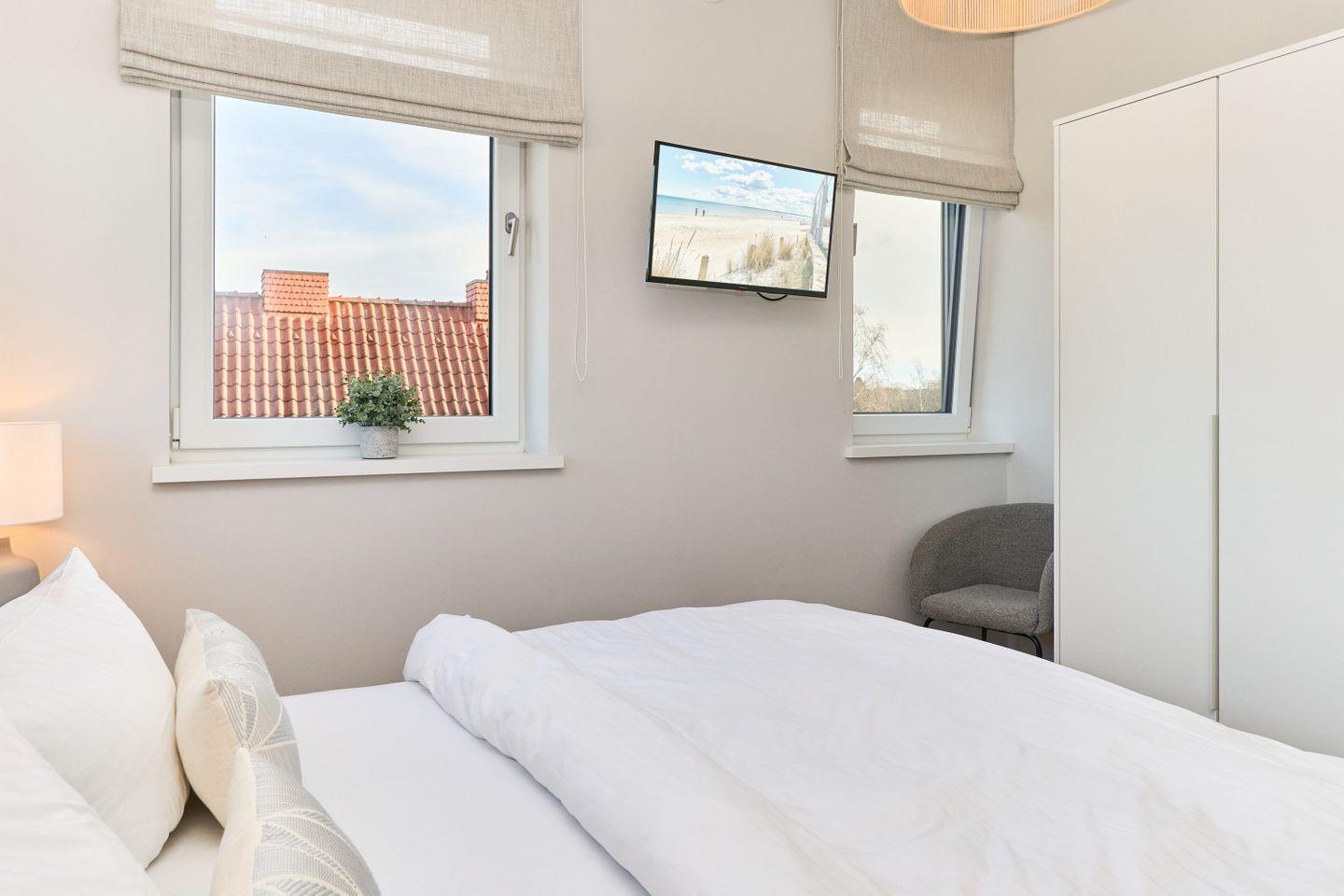 In den drei Schlafzimmern finden die Gäste erholsame Nächte. Zwei Zimmer sind mit luxuriösen Boxspringbetten (180x200 cm), 32-Zoll-Smart-TVs und großen Kleiderschränken ausgestattet, während das dritte Schlafzimmer über ein Boxspringbett (160x200 cm) und ebenfalls viel Stauraum verfügt.