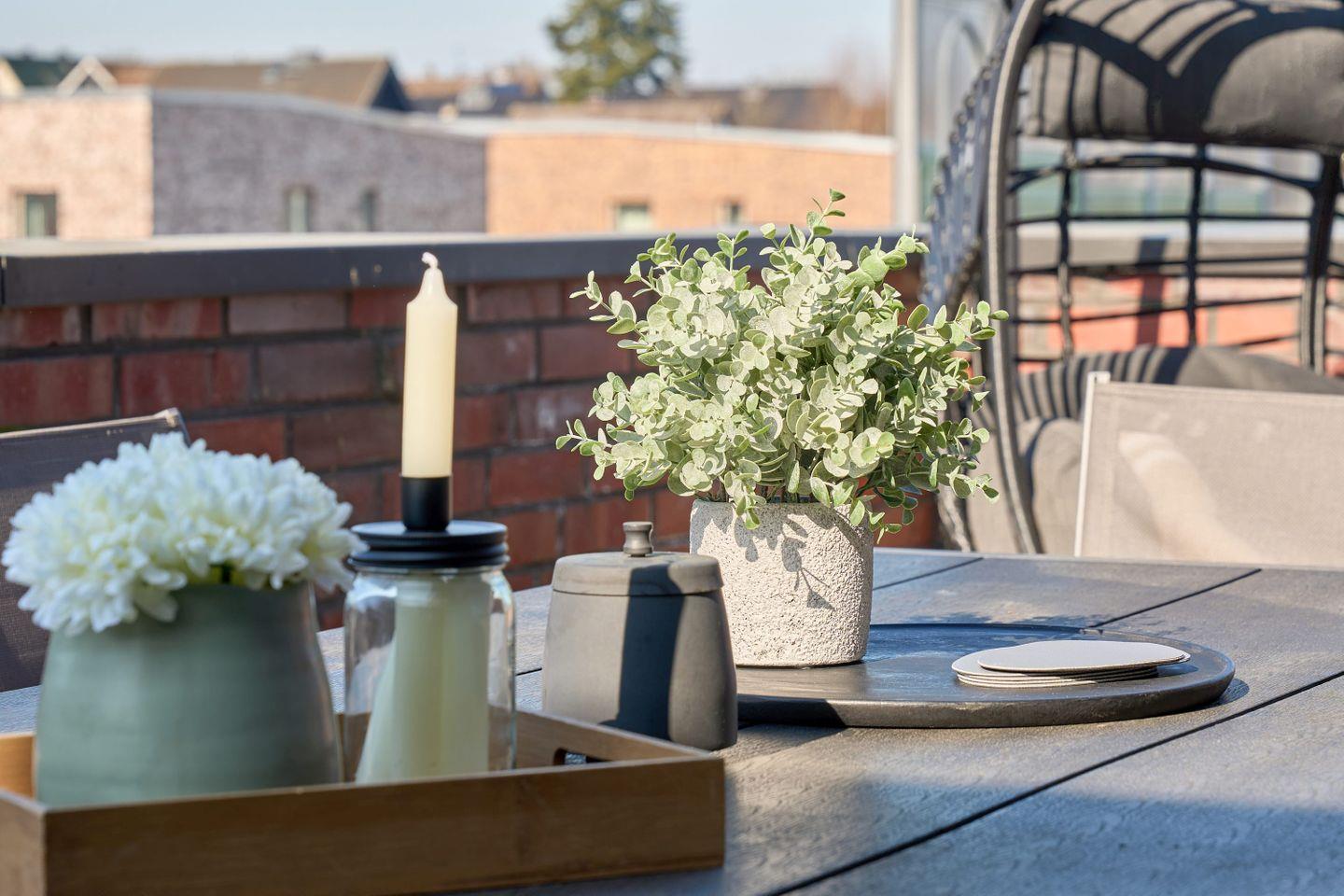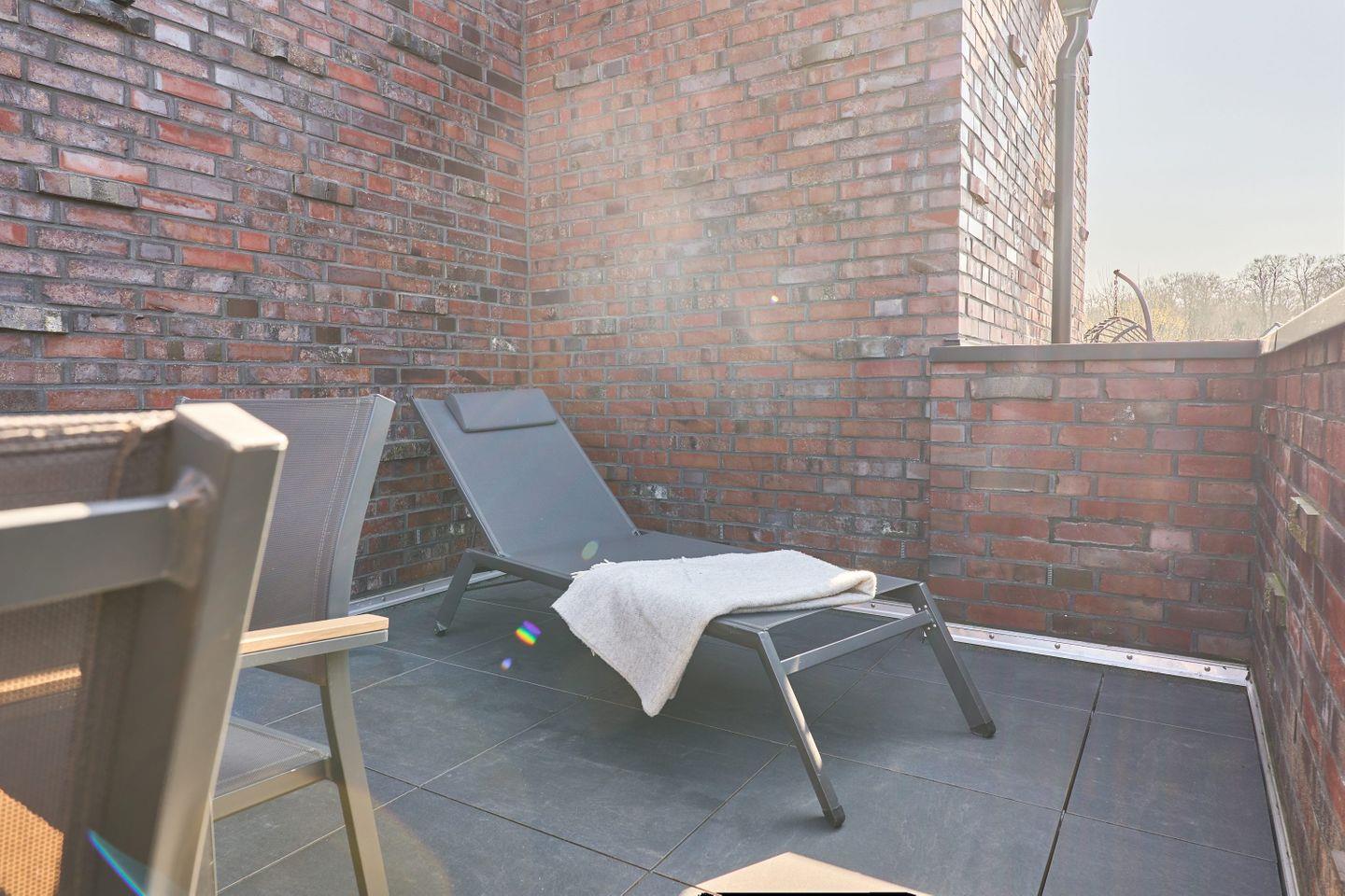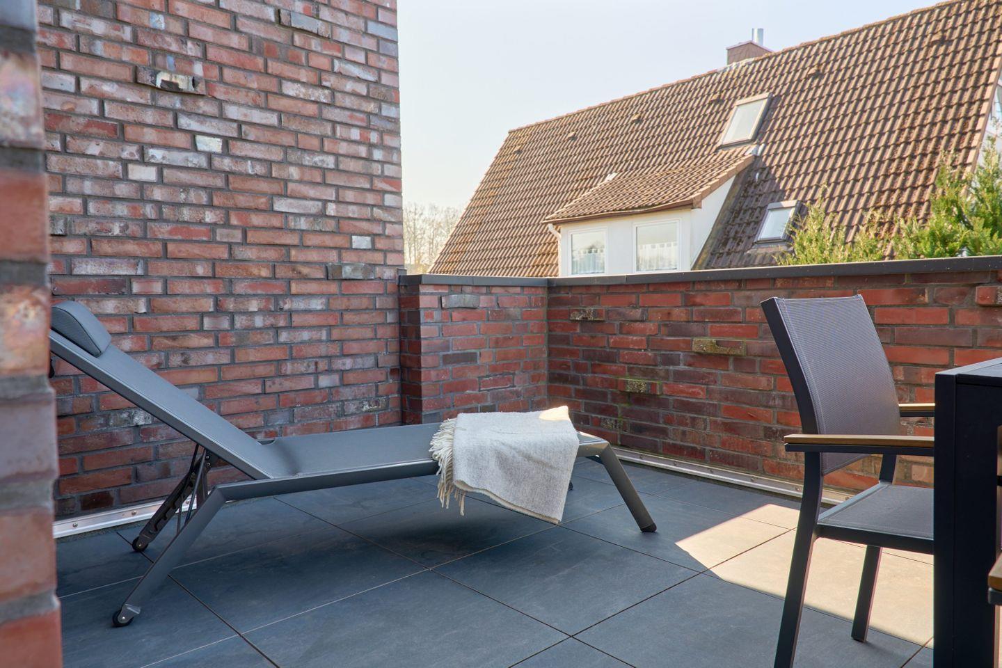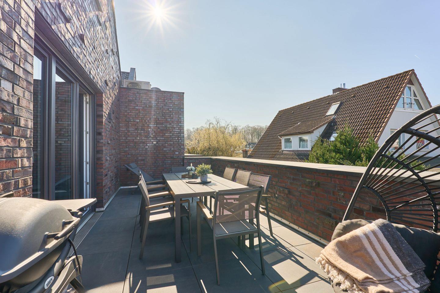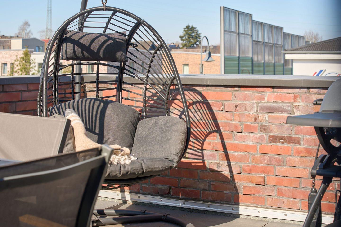 Die Dachterrasse ist ein weiteres Highlight der Wohnung: Hier könnt Ihr in der Abendsonne entspannen und bei einem geselligen Grillabend den hochwertigen Weber-Elektrogrill nutzen. Bequeme Sitzgelegenheiten und ein gemütlicher Hängestuhl bieten reichlich Platz zum Entspannen.