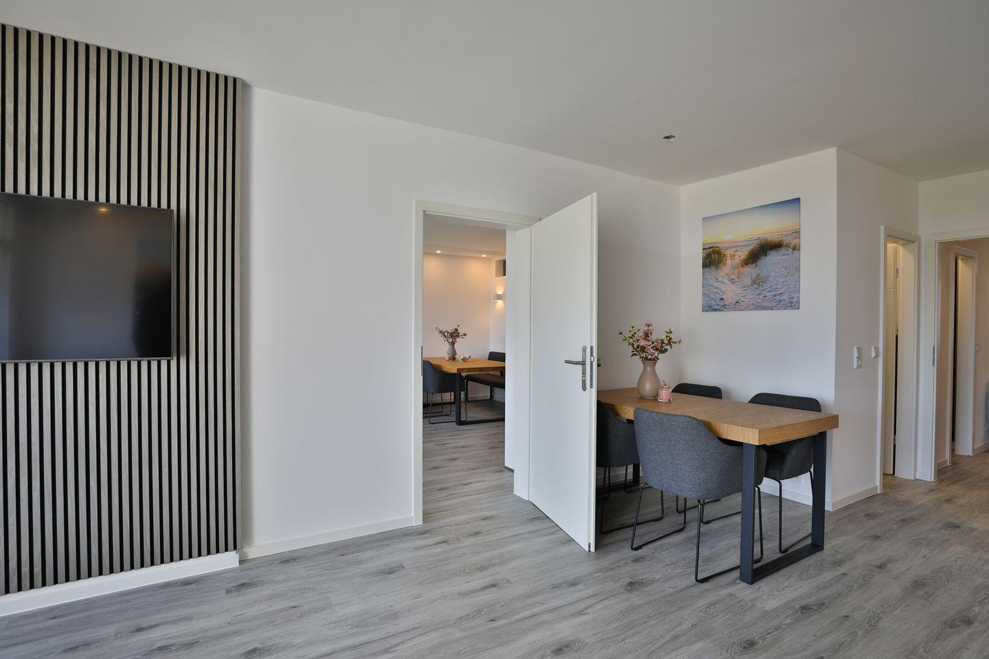 Ein besonderes Highlight: Die Strandkoje Nr. 106 setzt sich aus den Wohnungen Nr. 104 und Nr. 105 zusammen und kann in der Hauptsaison vom 05.07. bis zum 31.08. als eine große, zusammenhängende Einheit gemietet werden – dank der praktischen Verbindungstür. In der Nebensaison stehen beide Wohnungen auch getrennt zur Verfügung, was flexible Buchungsmöglichkeiten für Paare, Familien oder Einzelreisende bietet.