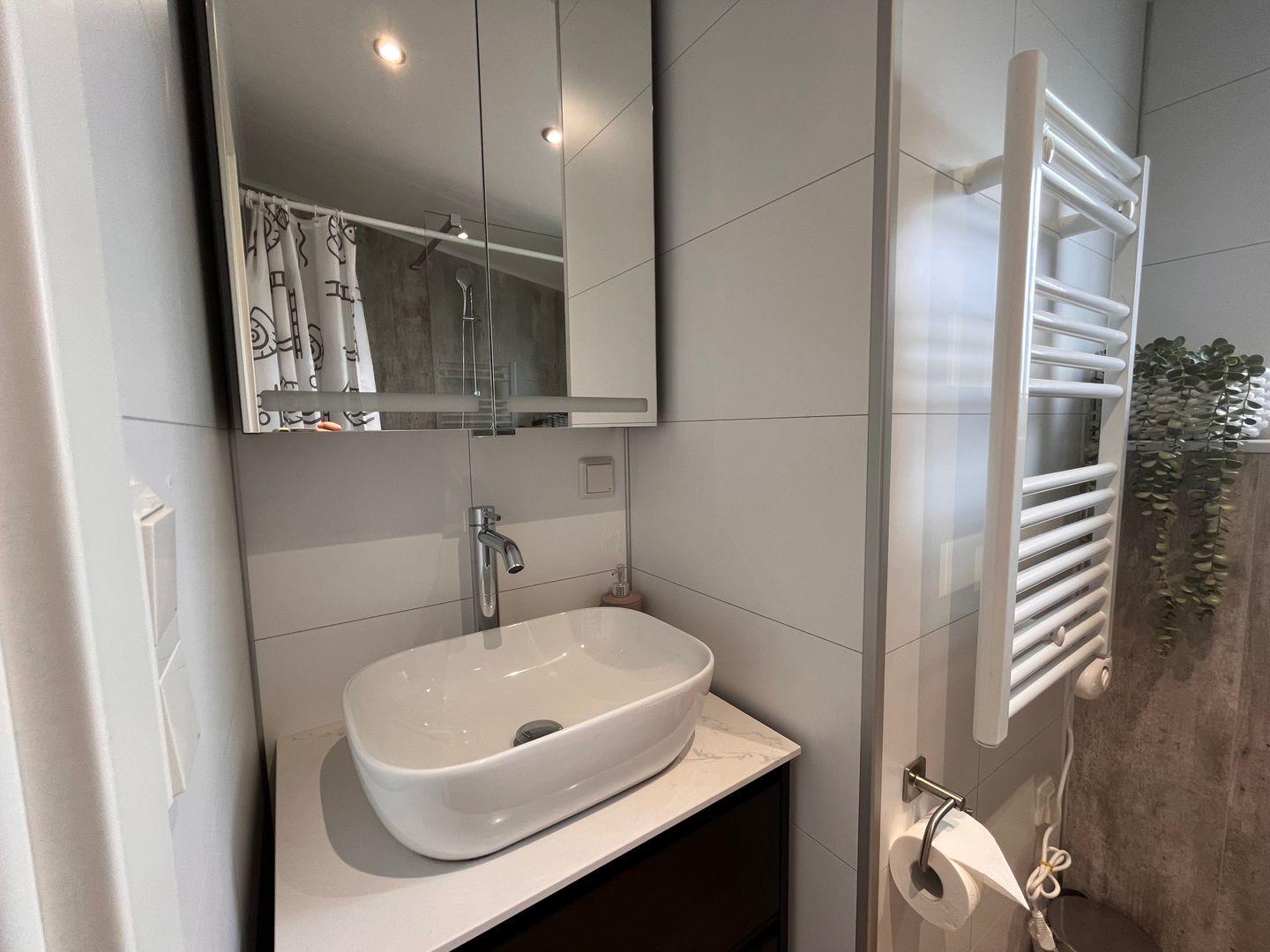 Im Badezimmer steht Ihnen eine moderne, bodengleiche Dusche zur Verfügung. Ein Fenster, WC, Waschbecken, Spiegel, Haartrockner und warmes Wasser komplettieren den Komfort.
