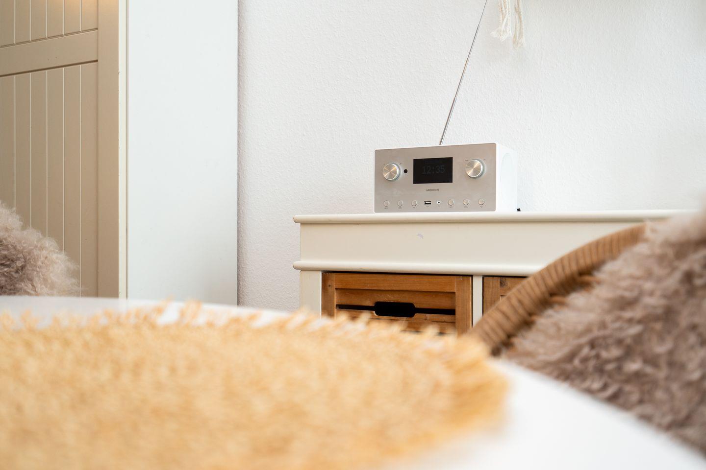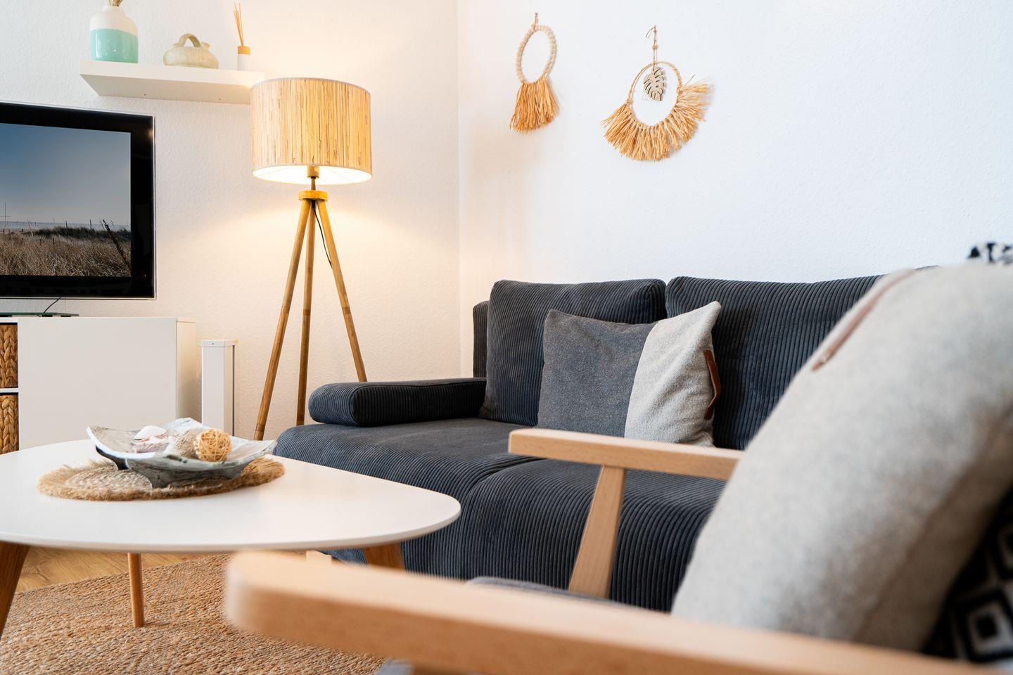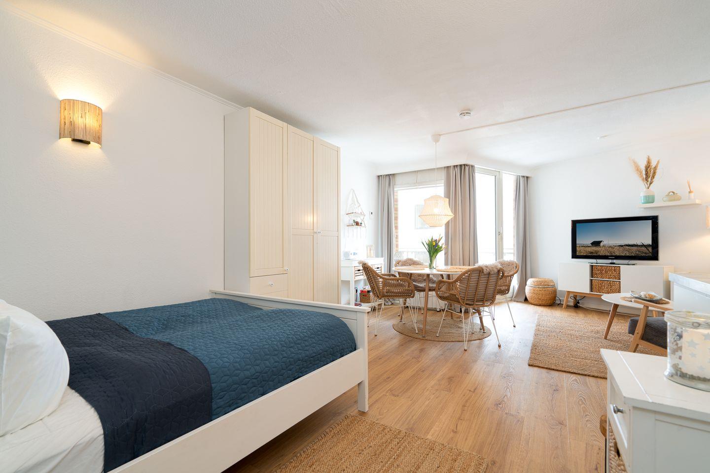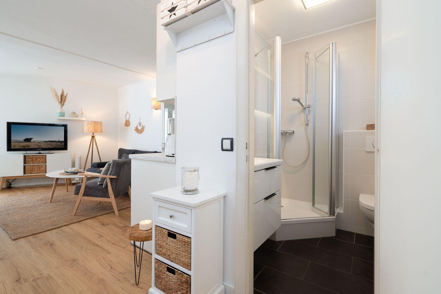 Erholsame Nächte sind durch die vier Schlafmöglichkeiten garantiert. Im vorderen Bereich der Wohnung befindet sich das bequeme Doppelbett (160 cm x 200 cm) und ein Kleiderschrank, das Schlafsofa (Liegefläche 140 cm x 200 cm) im Wohnbereich bietet Platz für zwei weitere Personen. Das moderne und neu gestaltete Tageslicht-Bad verfügt über eine Dusche, Waschbecken und Toilette.