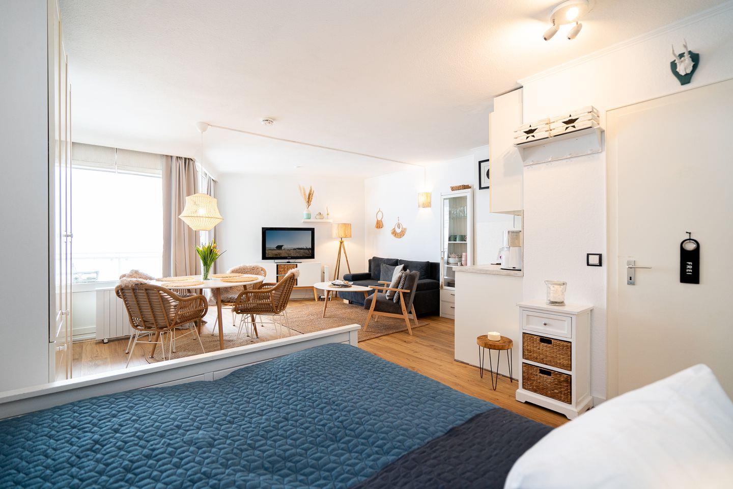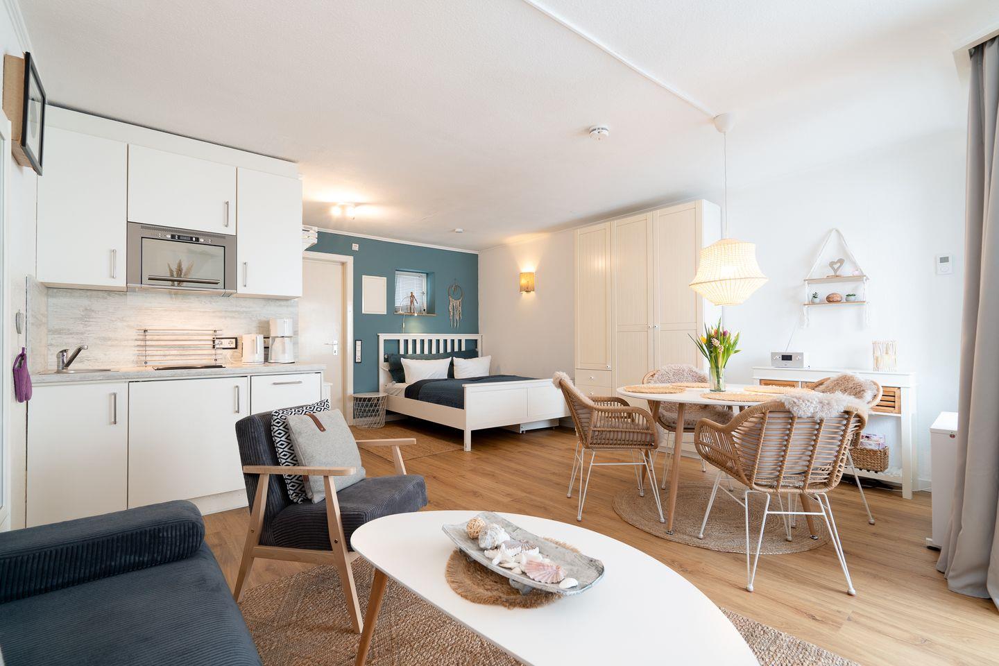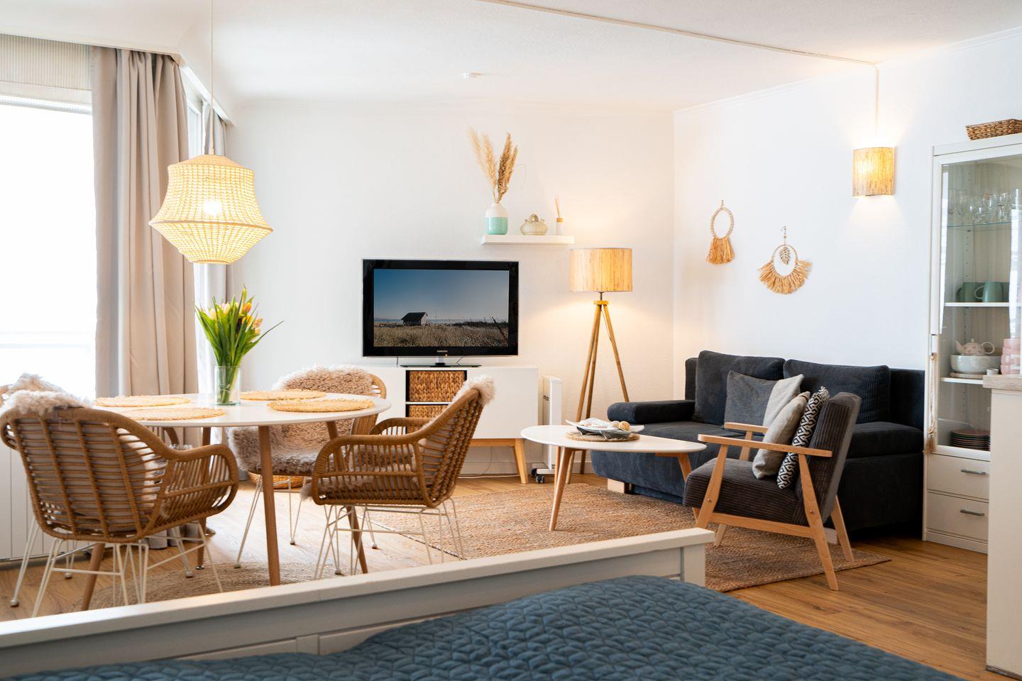 Die hochwertige Ausstattung der 1-Zimmer-Wohnung lässt keine Wünsche offen. Der offene Grundriss verbindet das Wohnzimmer mit der Küche, wodurch eine moderne und wohnliche Atmosphäre entsteht. Die Küche ist mit Annehmlichkeiten wie einem 2-Platten-Ceranherd, Geschirrspüler, Kühlschrank mit integriertem Gefrierfach und Mikrowelle ausgestattet. Im Essbereich finden bis zu vier Personen Platz am Esstisch. Die Sofaecke lädt zum Entspannen ein, während ein modernes TV-Gerät, Radio und kostenfreies WLAN für Unterhaltung sorgen.