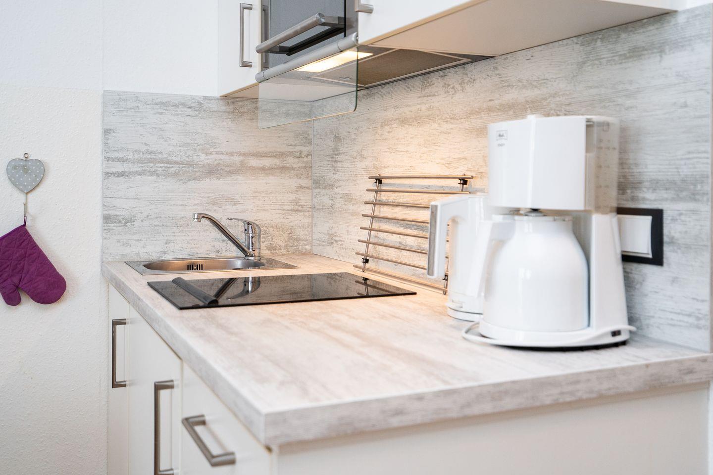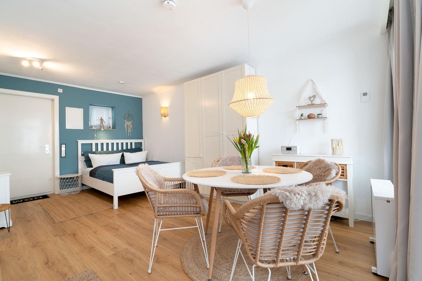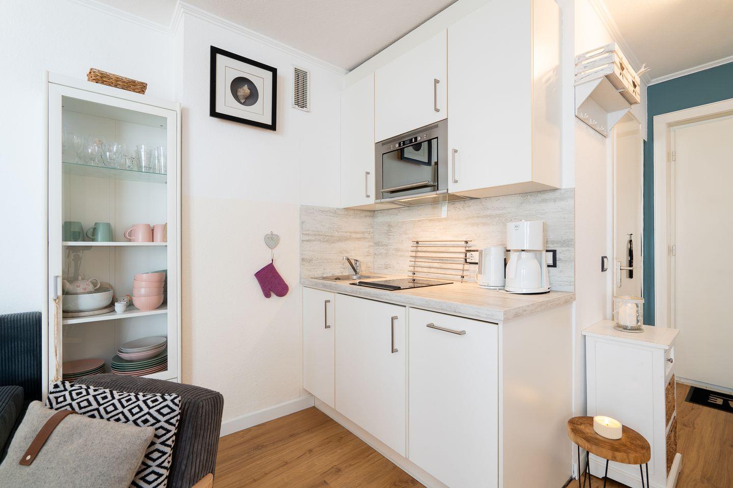 Die hochwertige Ausstattung der 1-Zimmer-Wohnung lässt keine Wünsche offen. Der offene Grundriss verbindet das Wohnzimmer mit der Küche, wodurch eine moderne und wohnliche Atmosphäre entsteht. Die Küche ist mit Annehmlichkeiten wie einem 2-Platten-Ceranherd, Geschirrspüler, Kühlschrank mit integriertem Gefrierfach und Mikrowelle ausgestattet. Im Essbereich finden bis zu vier Personen Platz am Esstisch. Die Sofaecke lädt zum Entspannen ein, während ein modernes TV-Gerät, Radio und kostenfreies WLAN für Unterhaltung sorgen.