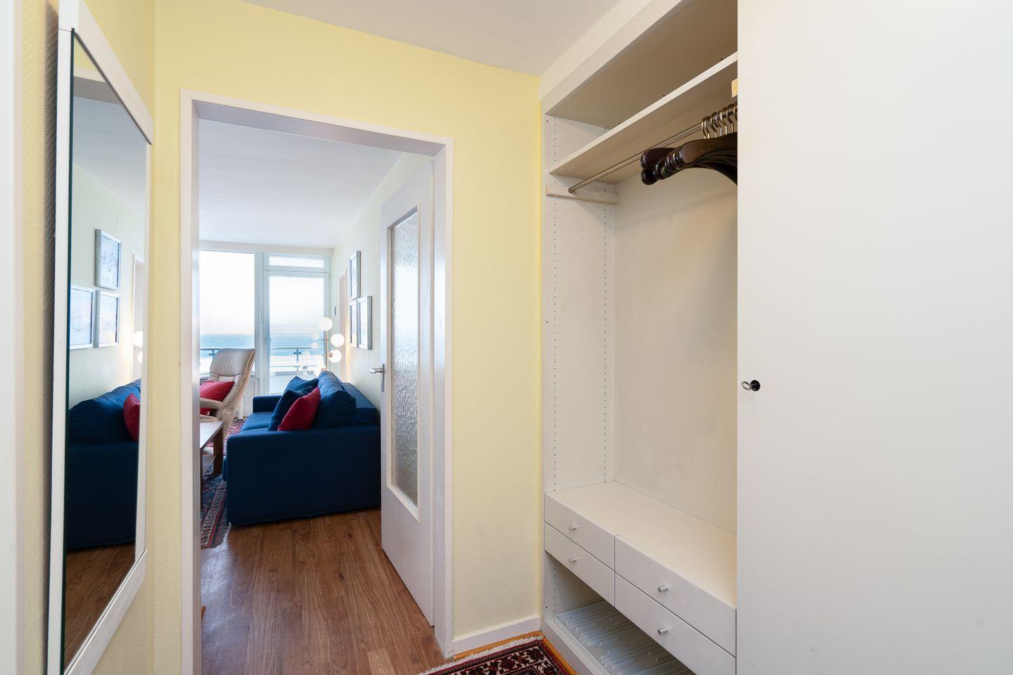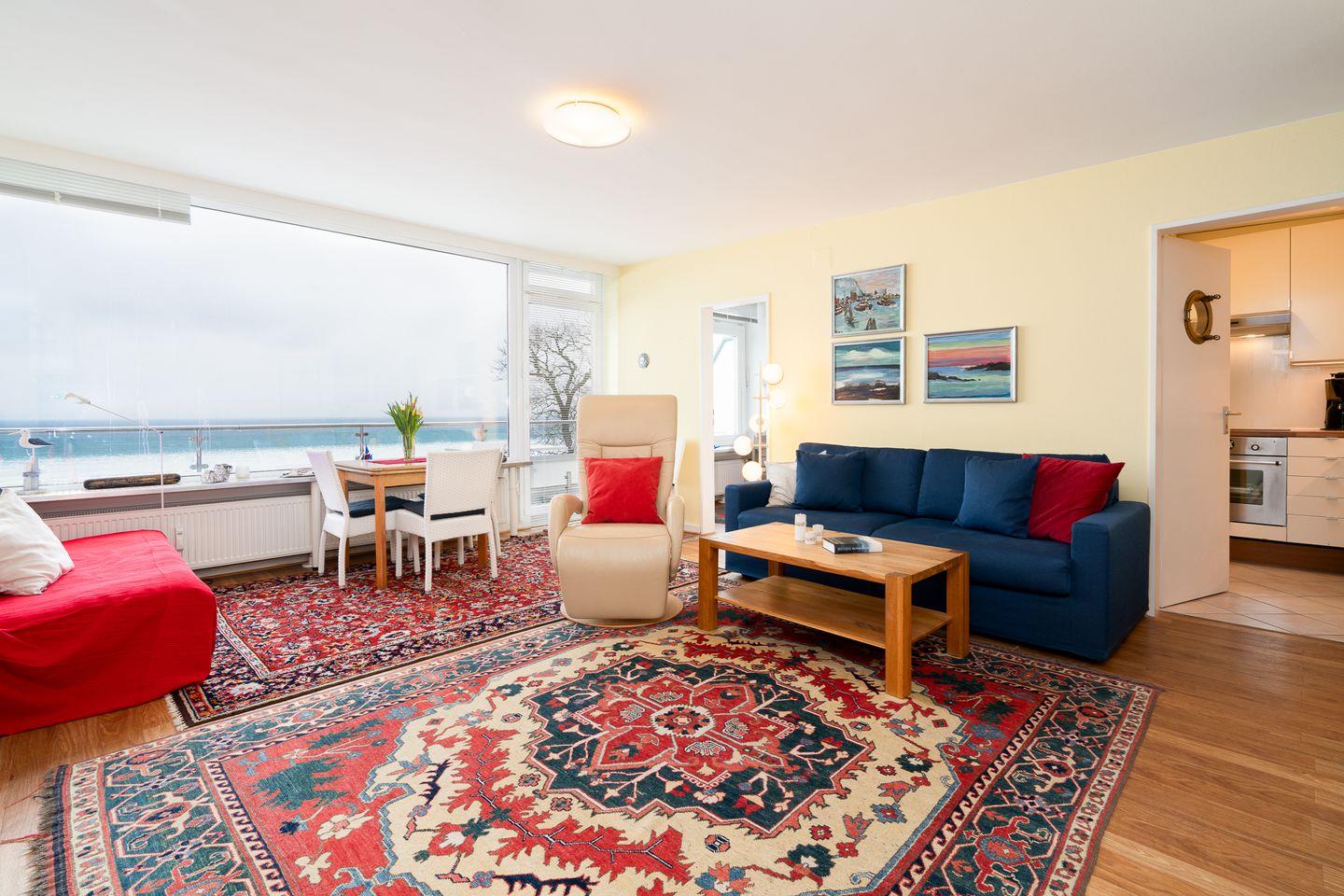 Auf einer Wohnfläche von ca. 57 m² stehen Ihnen zwei gut geschnittene Zimmer zur Verfügung. Das separate Schlafzimmer ist mit einem Doppelbett (2 x 100 x 200cm) ausgestattet und bietet erholsamen Schlafkomfort, es verfügt über einen erhöhten Einstieg, damit man direkt aus dem Bett den Meerblick genießen kann. Im Wohnzimmer befindet sich ein Schlafsofa (Liegefläche 160 x 200cm), sodass die Wohnung insgesamt bis zu vier Personen Platz bietet. Sowohl Schlaf- als auch Wohnzimmer sind mit Jalousien zu verdunkeln. Vom Wohnbereich aus gelangen Sie direkt auf den Balkon mit Meerblick, der zum Verweilen und Entspannen einlädt.