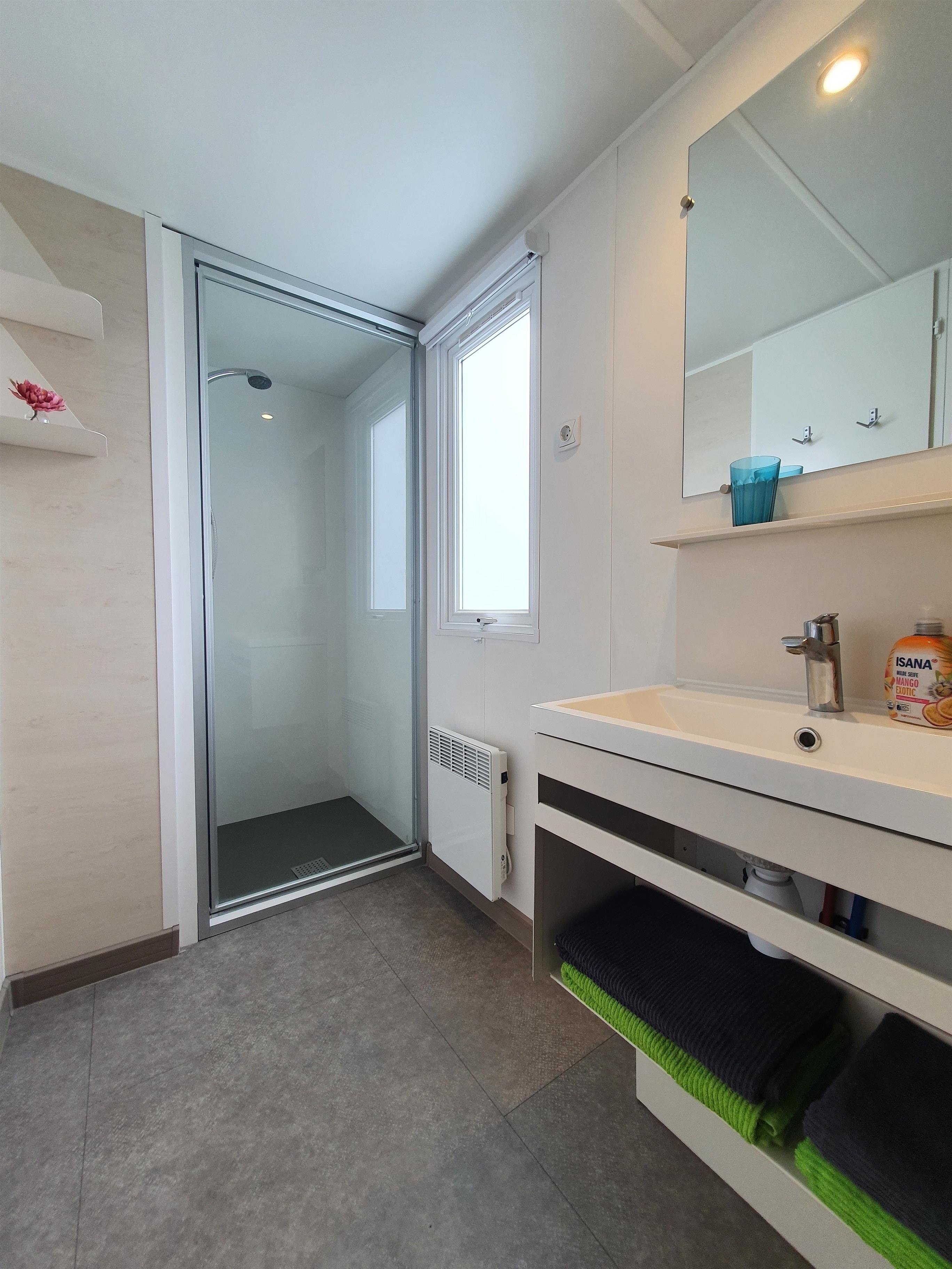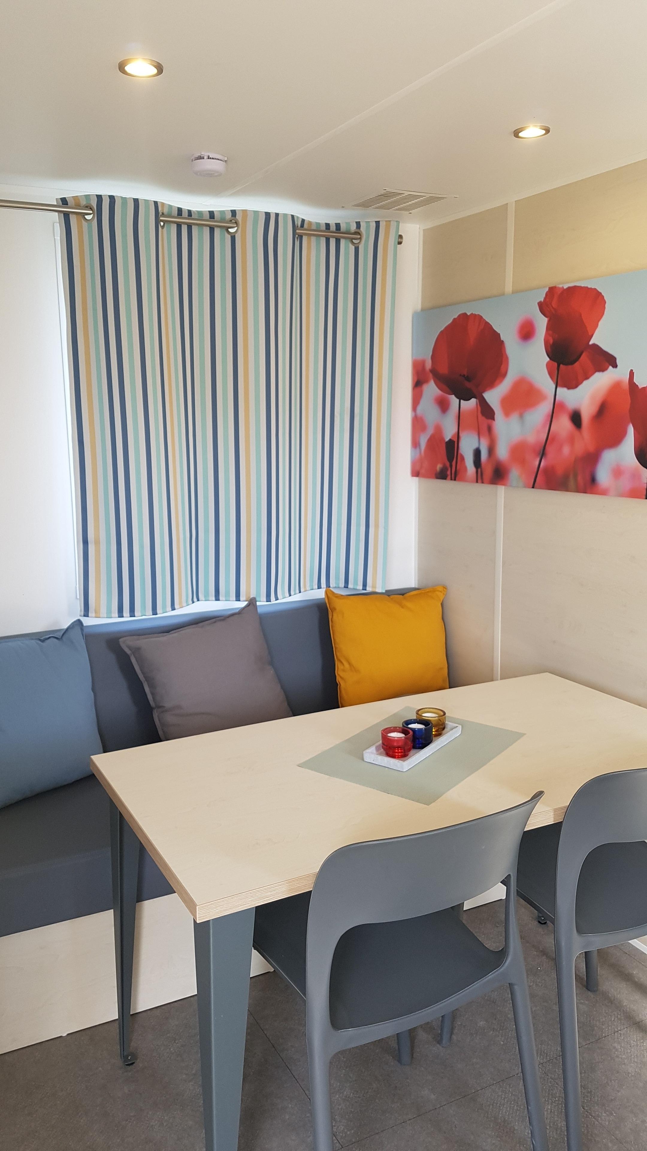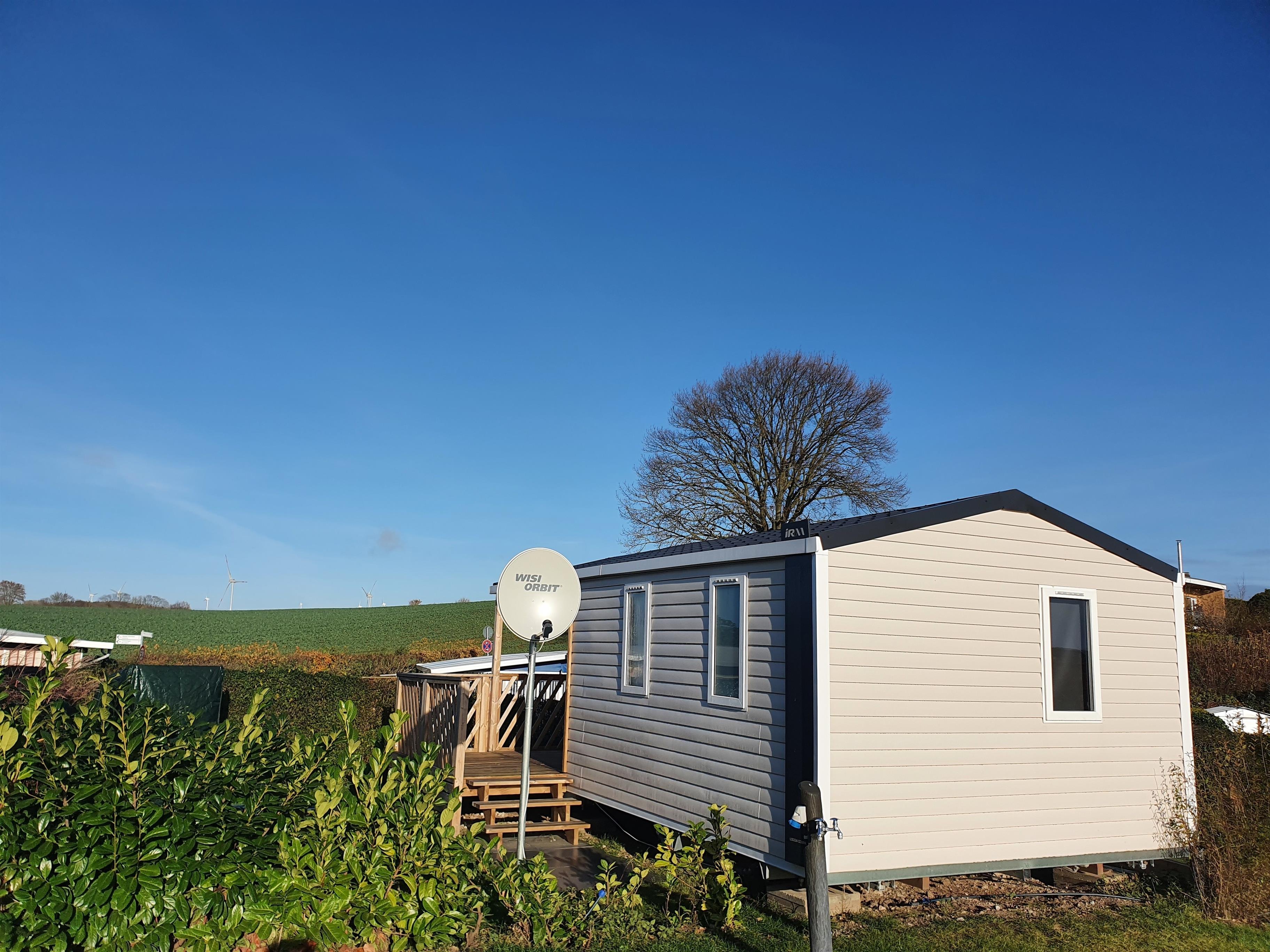 Unsere Mobilheime sind hell und modern ausgestattet und verfügen jeweils über einen kombinierten Wohn-/Essbereich mit integrierter Küchenzeile, 2-3 Schlafzimmern, 1-2 Bädern mit Dusche sowie 1-2 separaten WC. Eines der Bäder ist jeweils direkt von einem der Schlafzimmer aus zugänglich (en-suite). Auf der Terrasse stehen Ihnen ein eigener Strandkorb, ein Tisch mit Bänken und Sonnenschirm sowie ein Grill zur Verfügung. Ein kleiner Gartenbereich sorgt für weitere Entspannungsmöglichkeiten. Ihr Auto parken Sie direkt am Mobilheim.