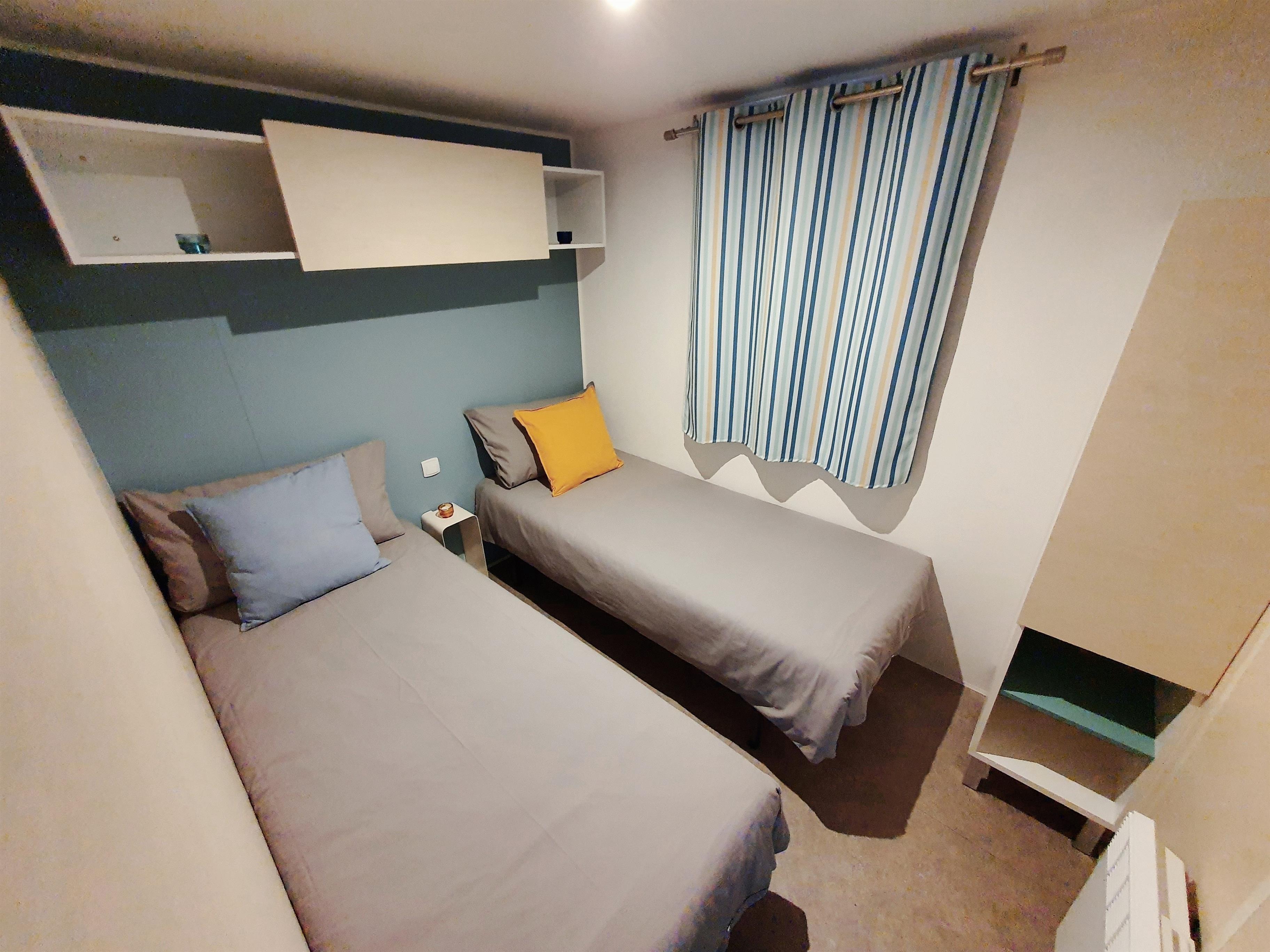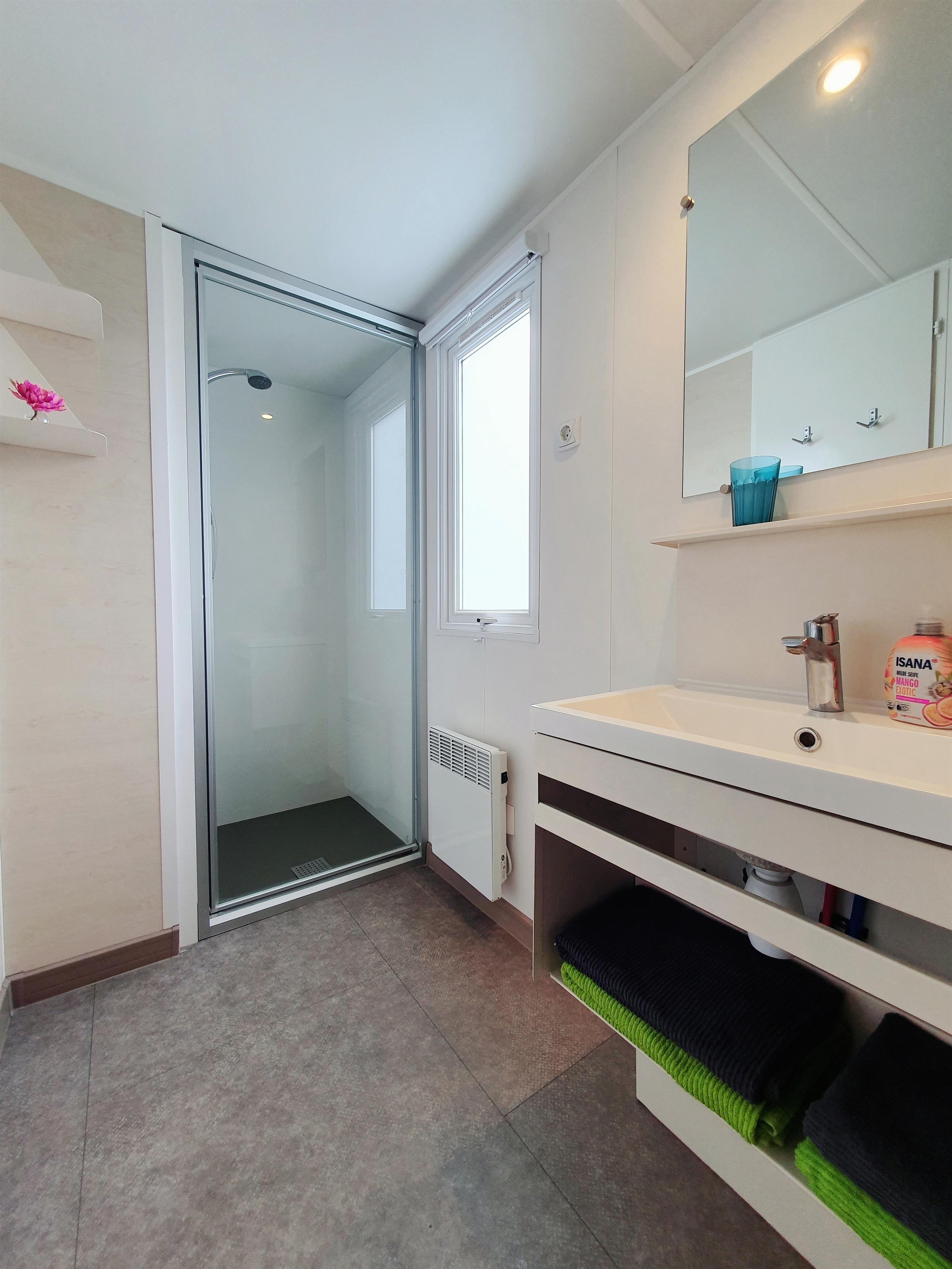 Unsere Mobilheime sind hell und modern ausgestattet und verfügen jeweils über einen kombinierten Wohn-/Essbereich mit integrierter Küchenzeile, 2-3 Schlafzimmern, 1-2 Bädern mit Dusche sowie 1-2 separaten WC. Eines der Bäder ist jeweils direkt von einem der Schlafzimmer aus zugänglich (en-suite). Auf der Terrasse stehen Ihnen ein eigener Strandkorb, ein Tisch mit Bänken und Sonnenschirm sowie ein Grill zur Verfügung. Ein kleiner Gartenbereich sorgt für weitere Entspannungsmöglichkeiten. Ihr Auto parken Sie direkt am Mobilheim.