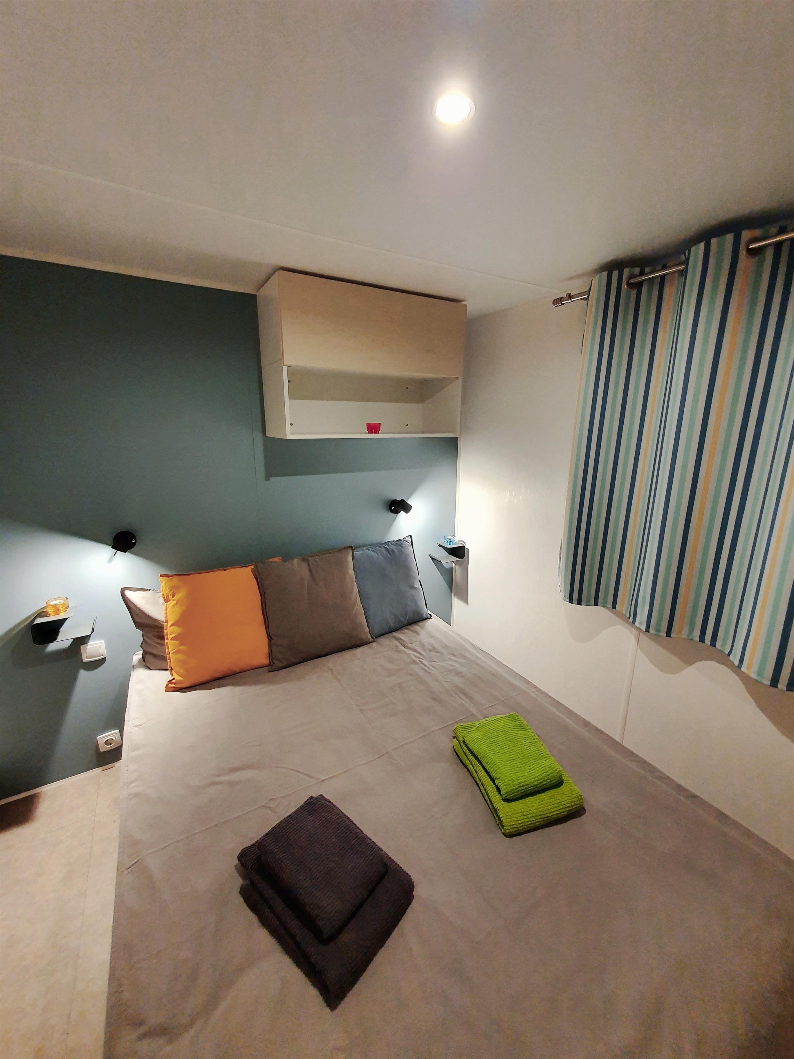 Unsere Mobilheime sind hell und modern ausgestattet und verfügen jeweils über einen kombinierten Wohn-/Essbereich mit integrierter Küchenzeile, 2-3 Schlafzimmern, 1-2 Bädern mit Dusche sowie 1-2 separaten WC. Eines der Bäder ist jeweils direkt von einem der Schlafzimmer aus zugänglich (en-suite). Auf der Terrasse stehen Ihnen ein eigener Strandkorb, ein Tisch mit Bänken und Sonnenschirm sowie ein Grill zur Verfügung. Ein kleiner Gartenbereich sorgt für weitere Entspannungsmöglichkeiten. Ihr Auto parken Sie direkt am Mobilheim.