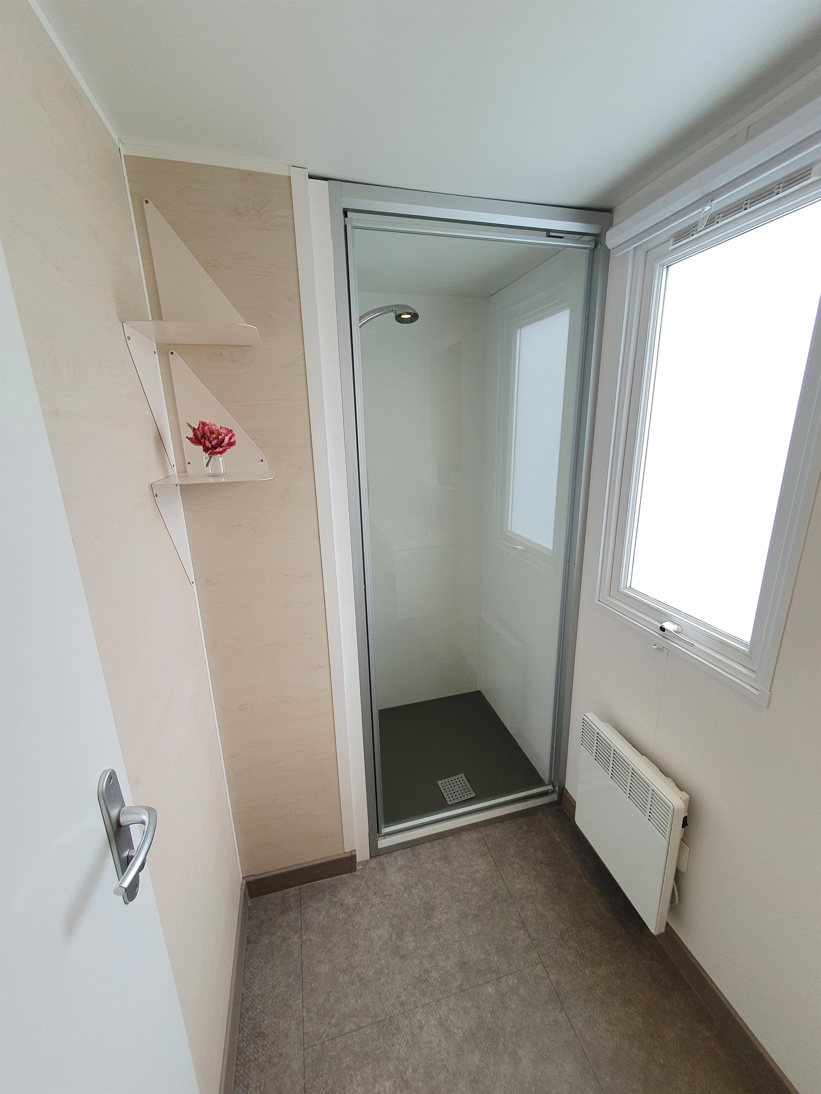Unsere Mobilheime sind hell und modern ausgestattet und verfügen jeweils über einen kombinierten Wohn-/Essbereich mit integrierter Küchenzeile, 2-3 Schlafzimmern, 1-2 Bädern mit Dusche sowie 1-2 separaten WC. Eines der Bäder ist jeweils direkt von einem der Schlafzimmer aus zugänglich (en-suite). Auf der Terrasse stehen Ihnen ein eigener Strandkorb, ein Tisch mit Bänken und Sonnenschirm sowie ein Grill zur Verfügung. Ein kleiner Gartenbereich sorgt für weitere Entspannungsmöglichkeiten. Ihr Auto parken Sie direkt am Mobilheim.