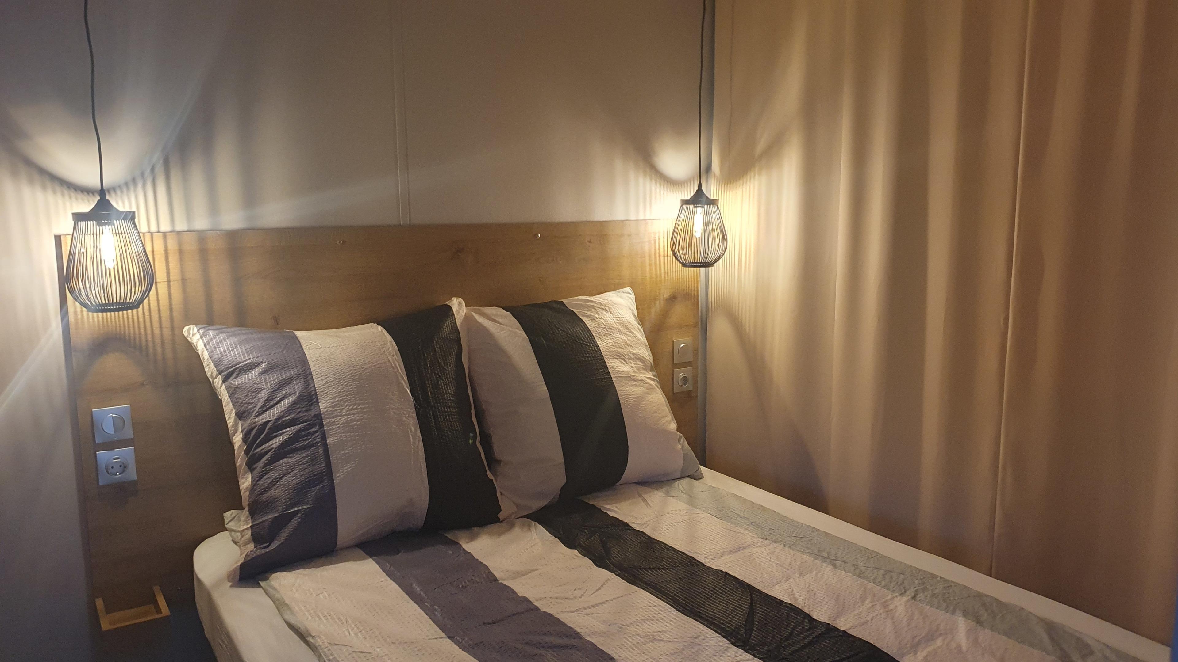 Unsere Mobilheime sind hell und modern ausgestattet und verfügen jeweils über einen kombinierten Wohn-/Essbereich mit integrierter Küchenzeile, 2-3 Schlafzimmern, 1-2 Bädern mit Dusche sowie 1-2 separaten WC. Eines der Bäder ist jeweils direkt von einem der Schlafzimmer aus zugänglich (en-suite). Auf der Terrasse stehen Ihnen ein eigener Strandkorb, ein Tisch mit Bänken und Sonnenschirm sowie ein Grill zur Verfügung. Ein kleiner Gartenbereich sorgt für weitere Entspannungsmöglichkeiten. Ihr Auto parken Sie direkt am Mobilheim.