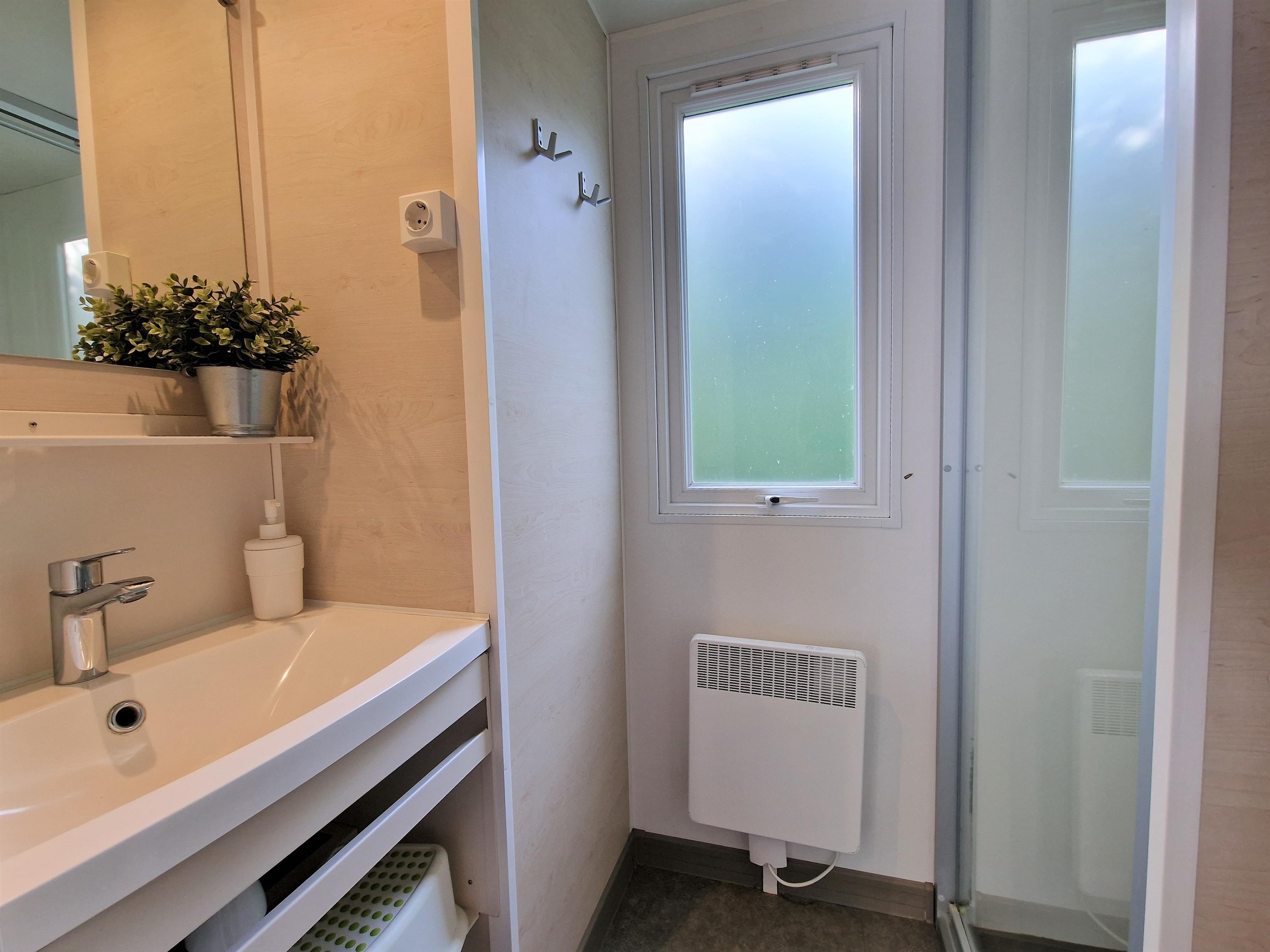 Die Dusche mit Waschtisch ist von der separaten Toilette getrennt.