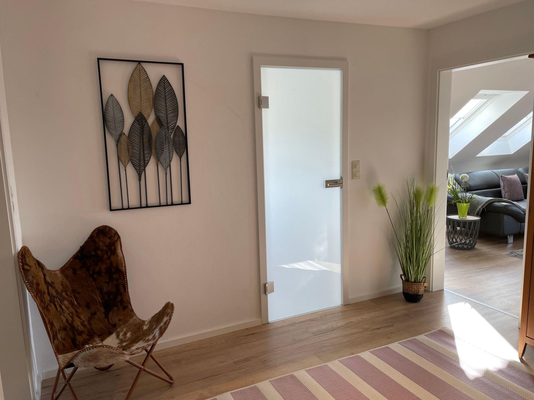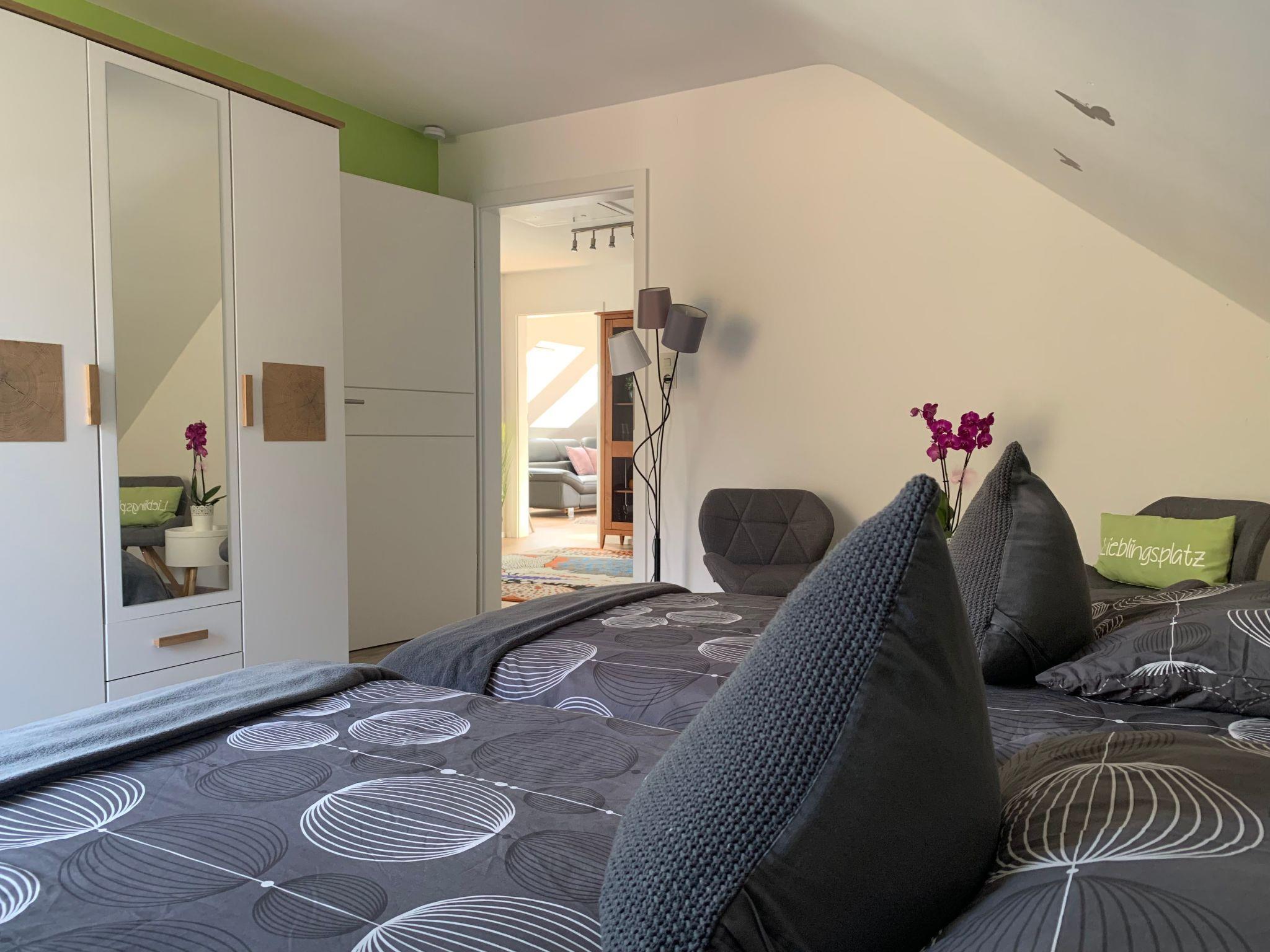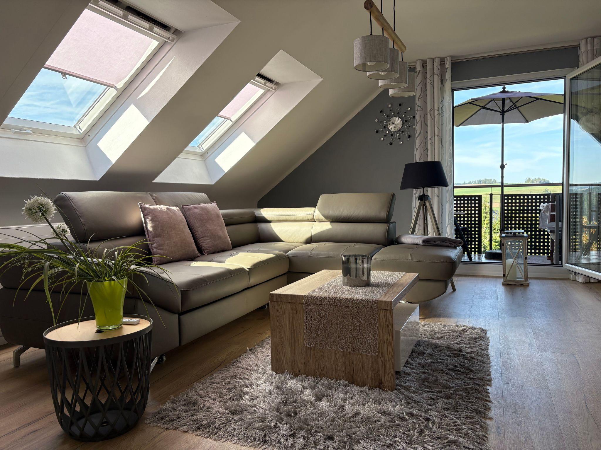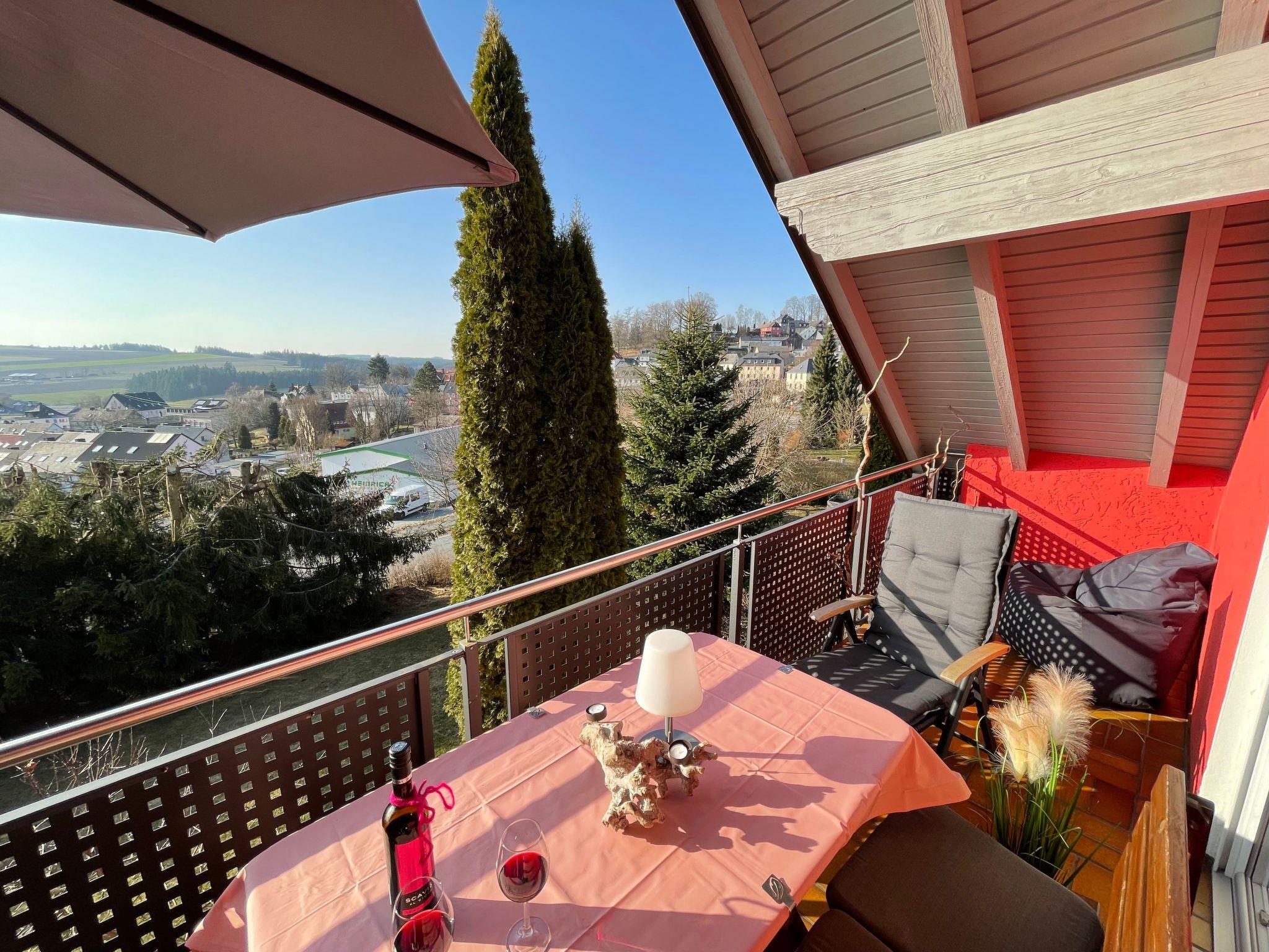 Holiday apartment**** in the Franconian Forest - FichtelgebirgeOur beautiful holiday flat, awarded with 4 stars, and a wonderful view, is located between the Franconian Forest and the Fichtelgebirge. Countless romantic hiking trails with rock labyrinths, water sources (e. g. Egerquelle) can be found here. If you want to get away from it all and are looking for peace, relaxation and wellness, then you've come to the right place. We offer a holiday flat with 2 bedrooms. 1 bedroom for 2 adults in a double bed (180x200cm). 2nd bedroom with a single bed (90x200cm). Further sleeping possibilities on request. This holiday flat is on the 1st floor with cosy sloping ceilings. Furthermore we can offer a new leather couch in the living room. minimum stay from high season: April-October 7 nightsNovember to March 4 nights minimum stay Whether you want to have breakfast on the balcony to the east side, or rather on the covered loggia (south-west), that is your decision. Since there is no terrace available in this holiday flat, you can use our 1200 square metre garden. 2 beautiful wooden deckchairs are available. Furthermore, a barbecue can be provided on request. A playground for children is about 100 metres away and 2 mountain bikes can be rented.