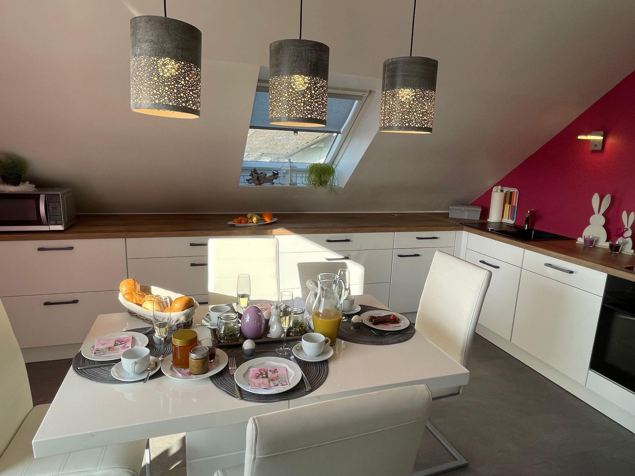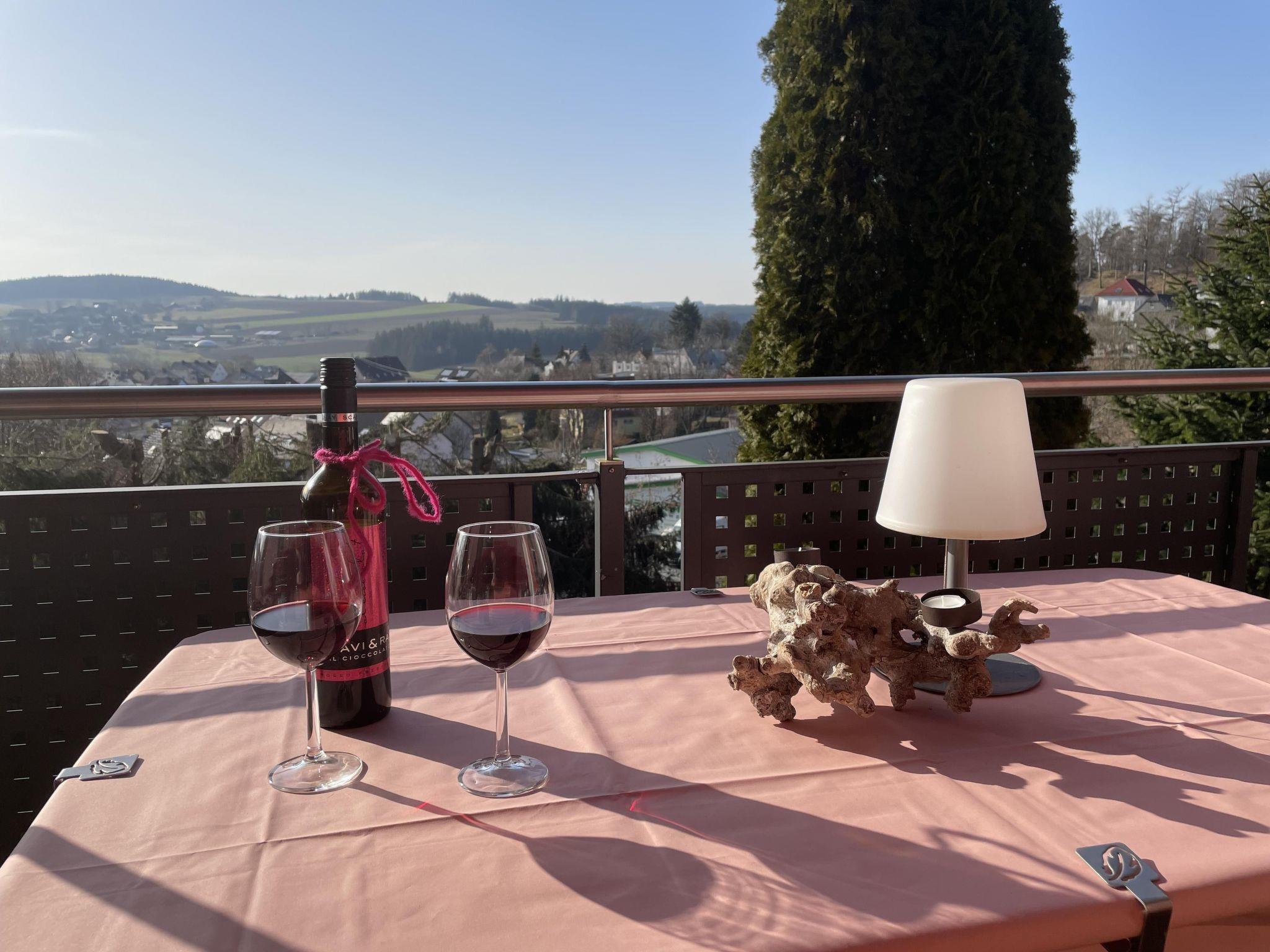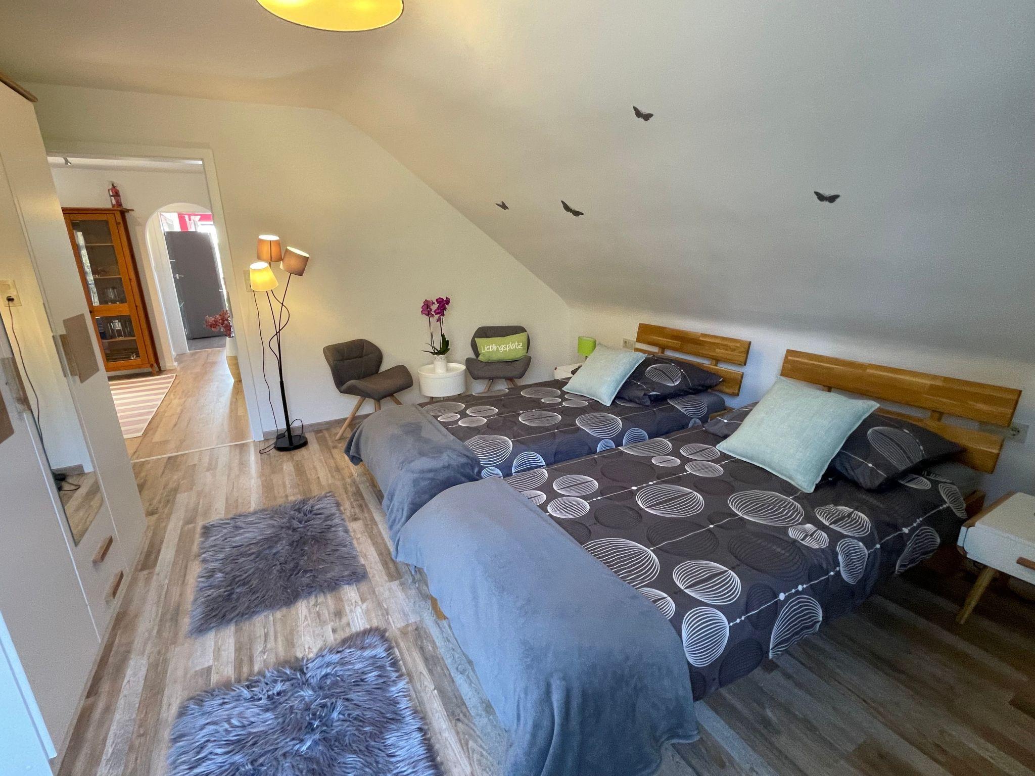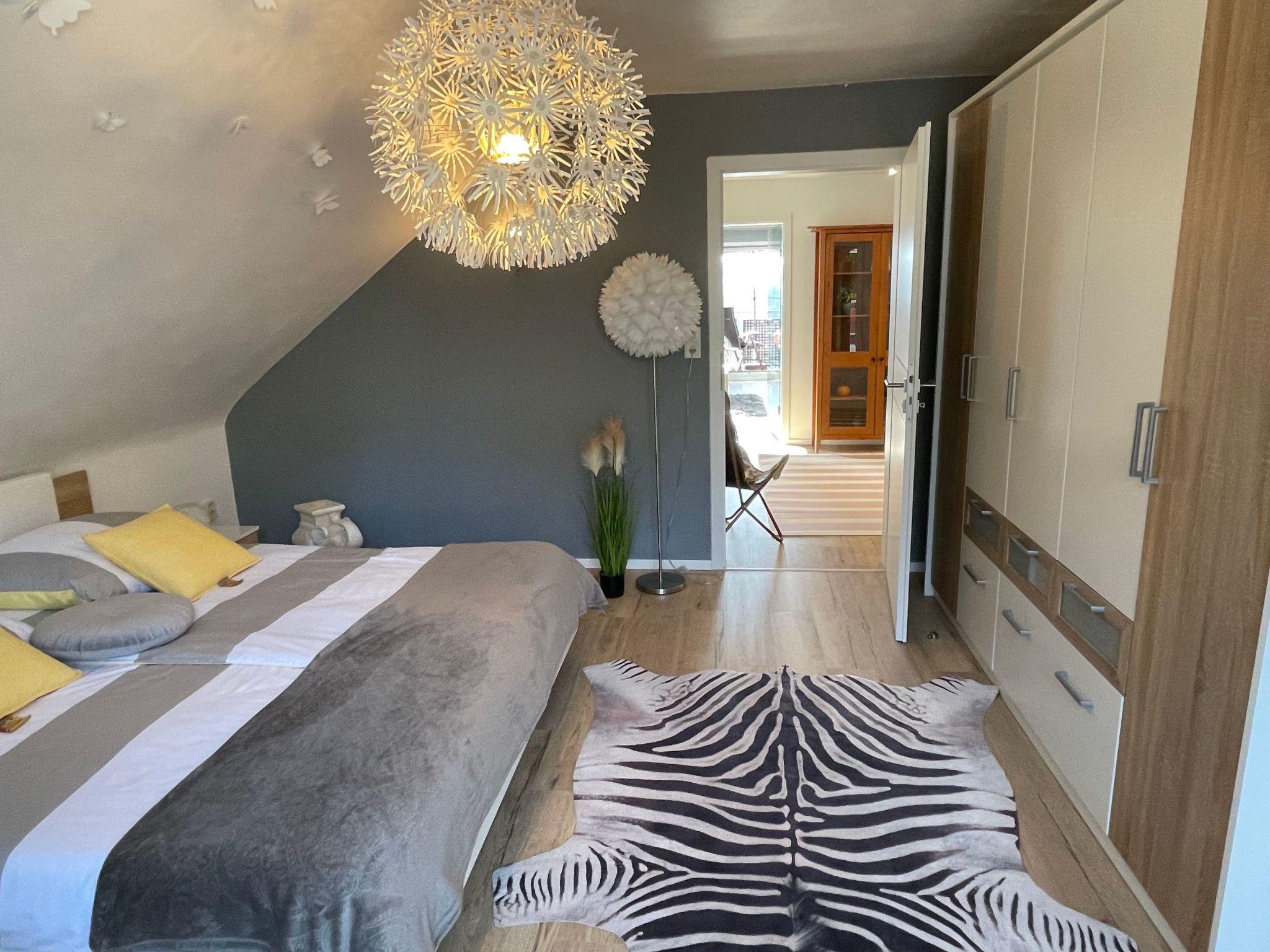 Holiday apartment**** in the Franconian Forest - FichtelgebirgeOur beautiful holiday flat, awarded with 4 stars, and a wonderful view, is located between the Franconian Forest and the Fichtelgebirge. Countless romantic hiking trails with rock labyrinths, water sources (e. g. Egerquelle) can be found here. If you want to get away from it all and are looking for peace, relaxation and wellness, then you've come to the right place. We offer a holiday flat with 2 bedrooms. 1 bedroom for 2 adults in a double bed (180x200cm). 2nd bedroom with a single bed (90x200cm). Further sleeping possibilities on request. This holiday flat is on the 1st floor with cosy sloping ceilings. Furthermore we can offer a new leather couch in the living room. minimum stay from high season: April-October 7 nightsNovember to March 4 nights minimum stay Whether you want to have breakfast on the balcony to the east side, or rather on the covered loggia (south-west), that is your decision. Since there is no terrace available in this holiday flat, you can use our 1200 square metre garden. 2 beautiful wooden deckchairs are available. Furthermore, a barbecue can be provided on request. A playground for children is about 100 metres away and 2 mountain bikes can be rented.