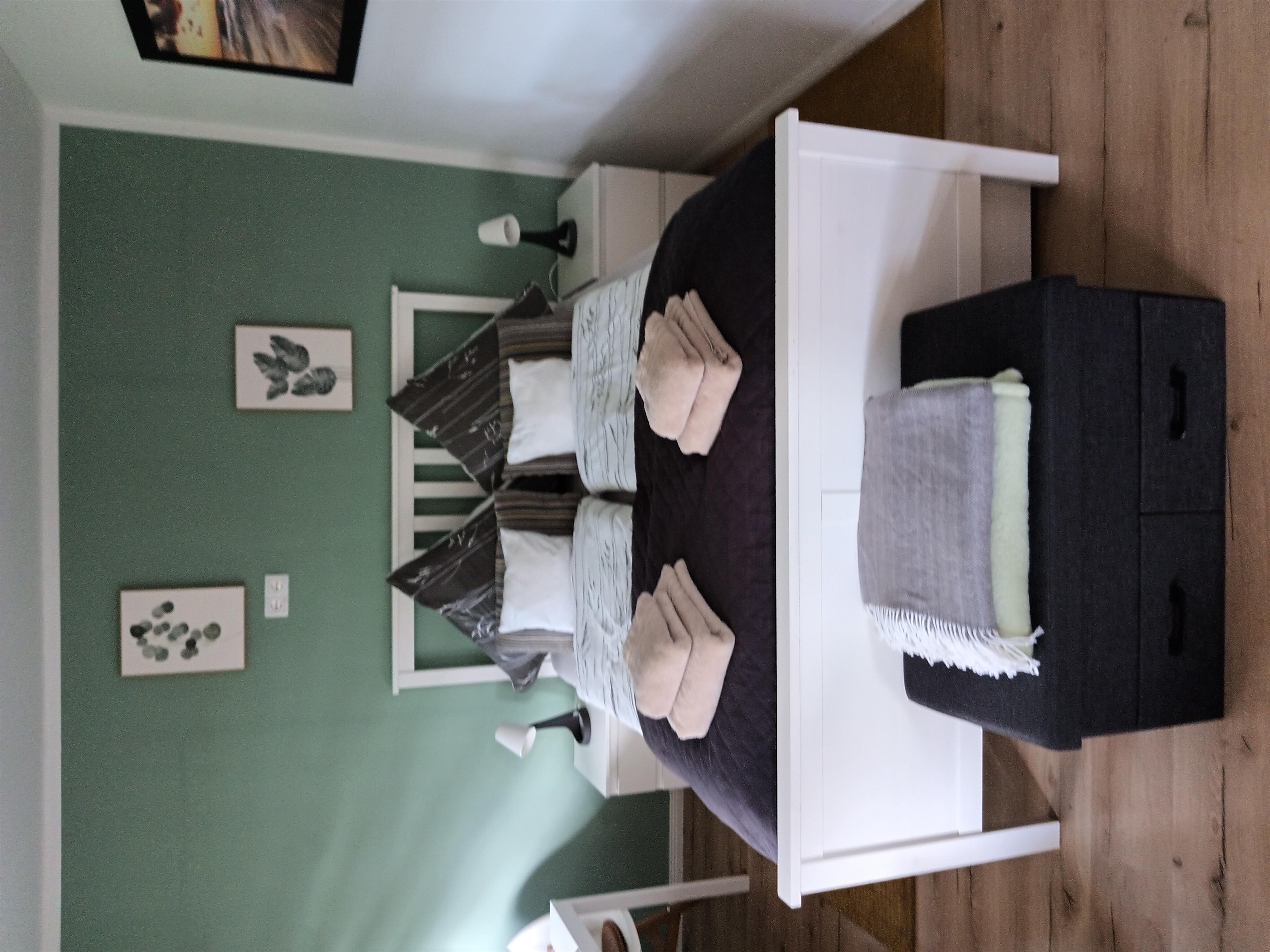 Die Ferienwohnung verfügt über einen kombinierten Wohn- und Schlafraum mit einem Doppelbett aus einem warmen Korbgeflecht. Die Couch ist ausziehbar, sodass hier ein weiterer Gast schlafen kann.
