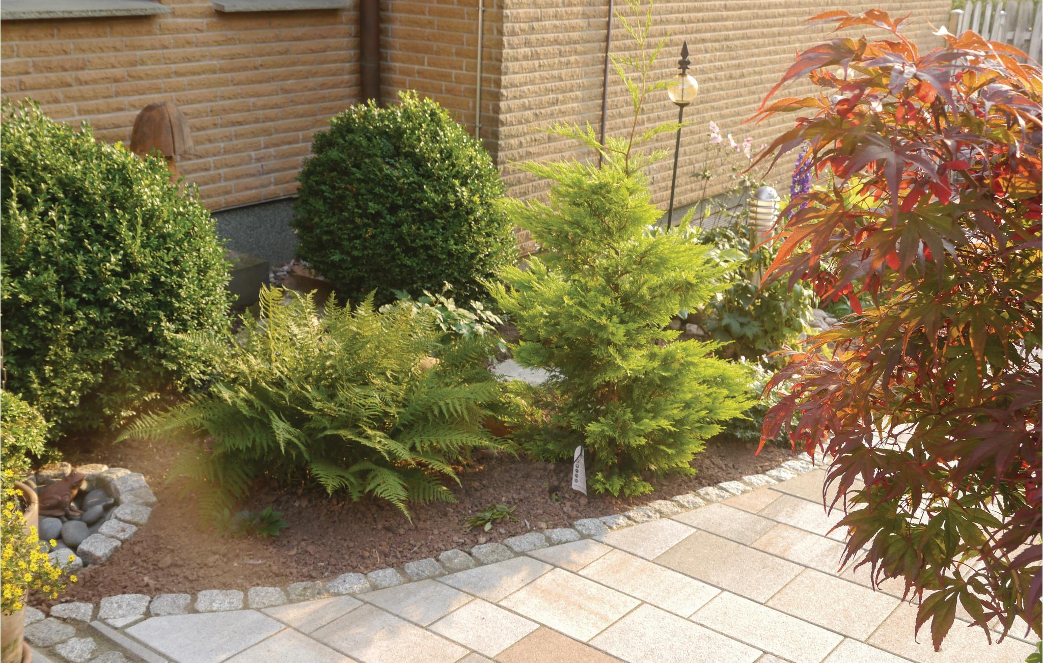 Det nybyggede indgangsområde udgør 25 m² med springvand, beplantninger, havemøbler og grill hvor I kan slappe af for jer selv og servere jeres måltider i det fri.