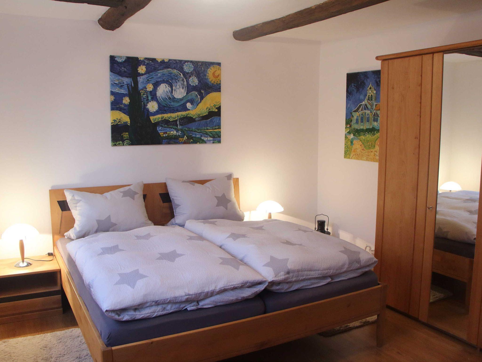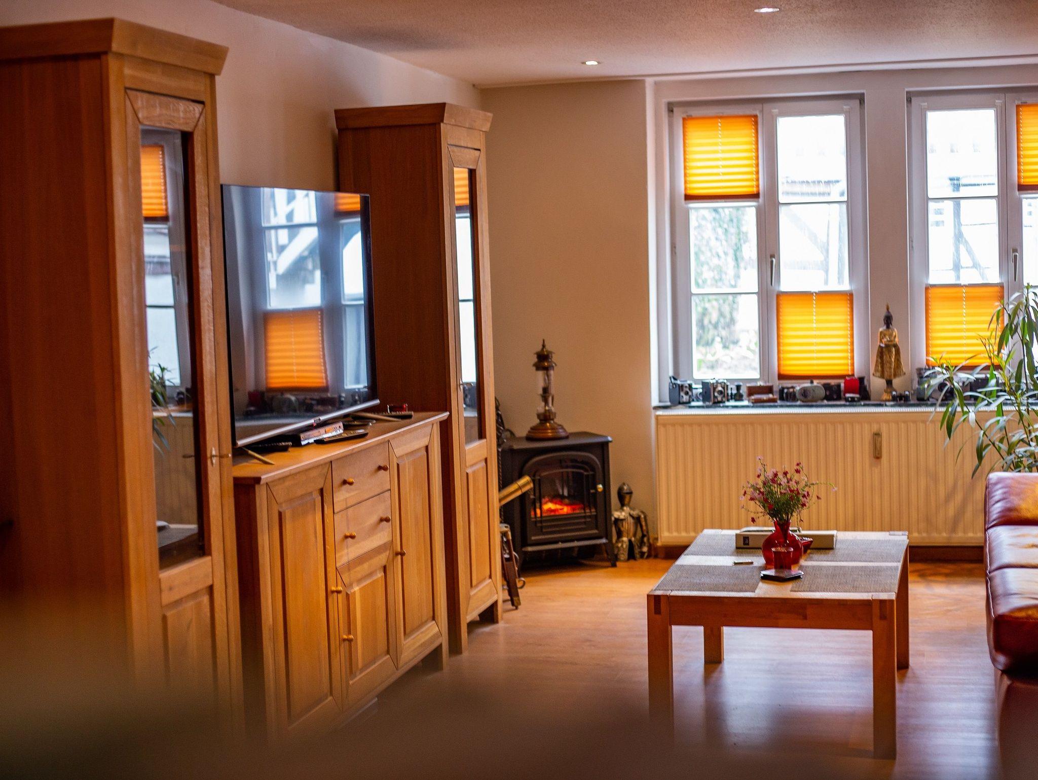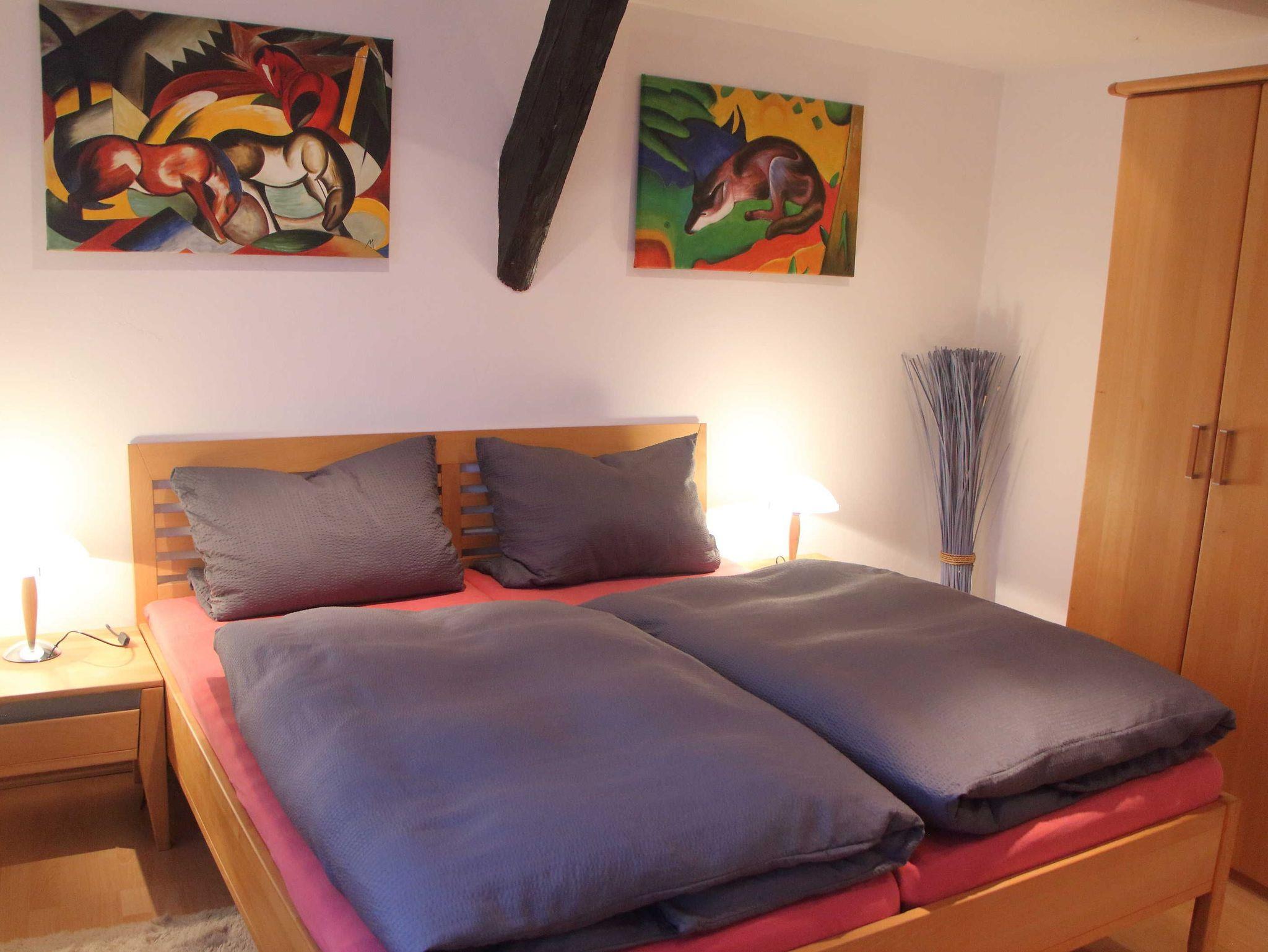 3-Zimmer-Wohnung mkit 100 m², im Erdgeschoss. Komfortabel und geschmackvoll eingerichtet: Wohn-/Esszimmer 40 m² mit Sat-TV (Flachbildschirm), CD und DVD. 2 Zimmer 18 ²2, jedes Zimmer mit 1 Doppelbett (180 cm, Länge 200 cm). Küche 12 m² (Backofen, Geschirrspüler, 4 Glaskeramikherd Platten, Mikrowelle, elektrische Kaffeemaschine) mit Esstisch. Bad/Dusche/WC. Terrasse 15 m², überdacht. Terrassenmöbel, Gartengrill. Zur Verfügung: Waschmaschine, Wäschetrockner. Internet (Wireless LAN, gratis). Bitte beachten: Nichtraucher-Unterkunft. Maximal 1 Haustier/Hund erlaubt. Rauchmelder. Elektrokamin im Wohnzimmer. Zusätzliche Pad-Kaffeemaschine (Pads extra). Wohn- und Essbereich sind durch offenes Fachwerk optisch getrennt. Modern gestaltete Wohnung mit künstlerischem Ambiente.