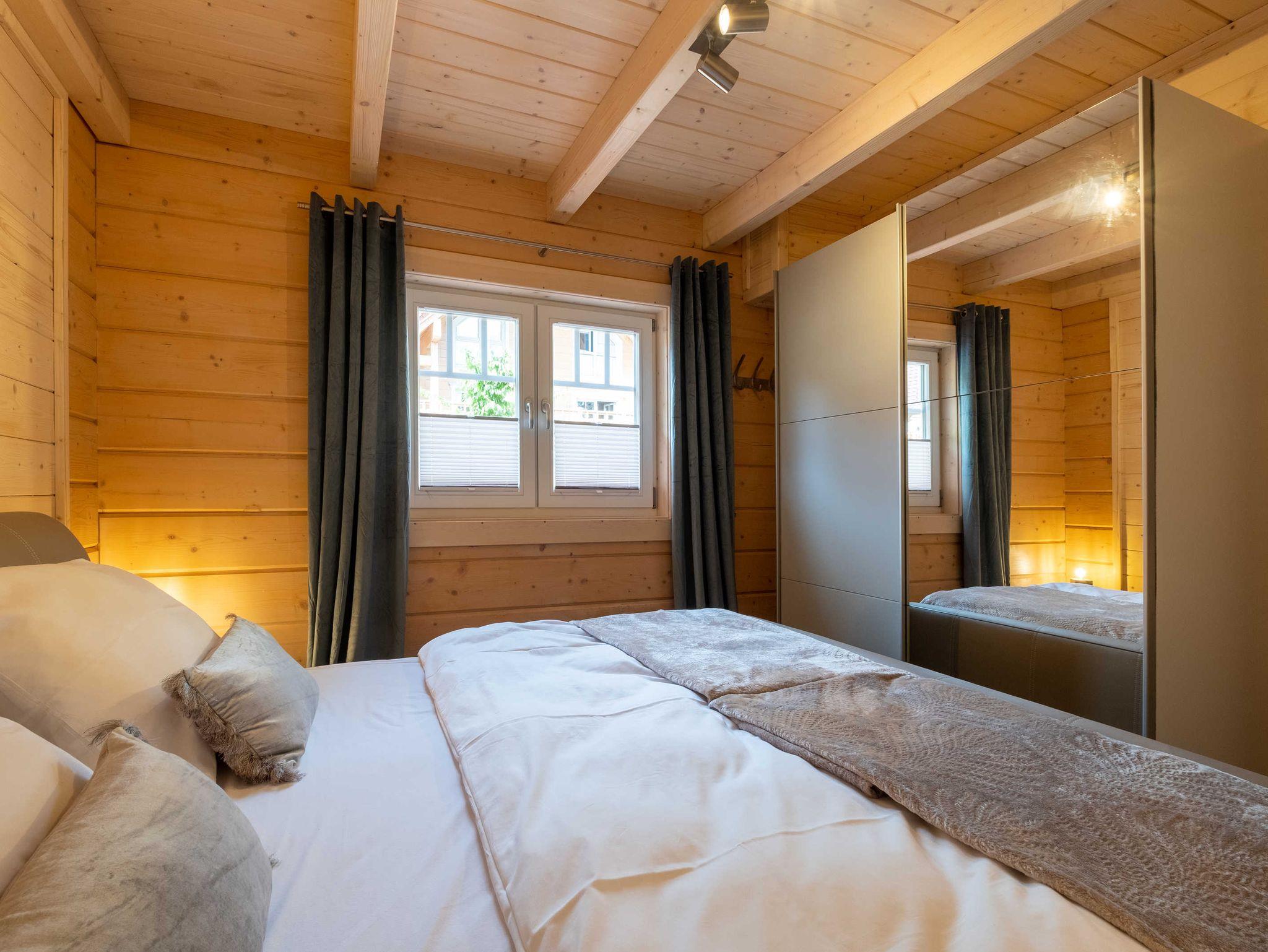 Hell und offen bis ins Dach präsentieren sich die 4 Suiten im Obergeschoss. Beim Betreten steigt der Holzduft in die Nase und vermittelt ein Gefühl von Wohnlichkeit. Das Ambiente ist im angesagten Stilmix gehalten. Alle Suiten verfügen über einen Wohn-/ Ess- /Schlafraum mit einer hochwertigen sehr gut ausgestatteten Lack-Einbauküche, ein Schlafzimmer mit Boxspringbett, geräumigem Schrank und einem Smart-TV sowie ein Badezimmer mit Glas- / Regendusche und Waschtisch. Die Fußbodenheizung in allen Räumen sorgt für wohlige Wärme. Über eine Stiege gelangen insbesondere die Kinder auf den geräumigen und gegen Absturz geschützten Spiel-/ und Schlafboden, denn dort befinden sich auch 2 Schlafgelegenheiten, entweder auf 1,40 m breite oder zwei mal 80 cm. Alle Suiten im Obergeschoss verfügen über einen großen Balkon, auf dem sich je nach Ausrichtung die Morgen-/ Mittags- oder Abendsonne genießen lässt. (Weitere Ausstattungsmerkmale weiter unten)