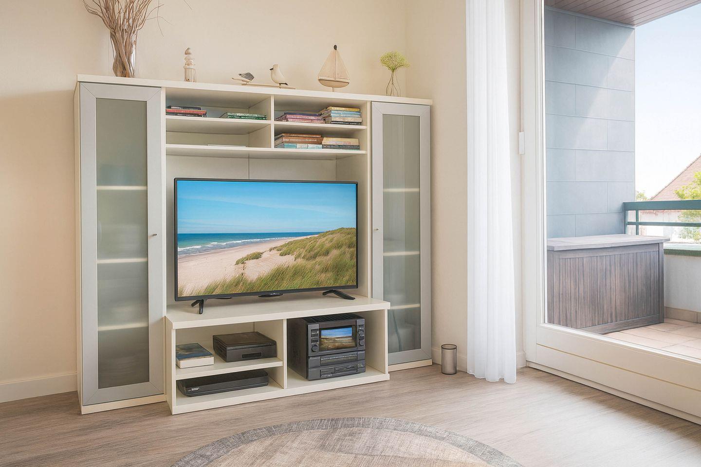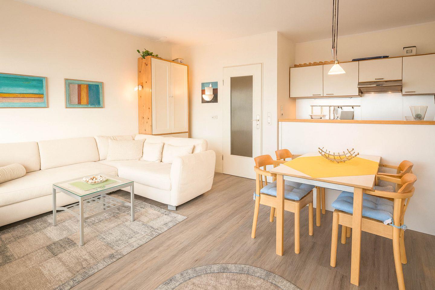 Auf rund 50 Quadratmetern Wohnfläche im ersten Obergeschoss eines gepflegten Reihenhauses erwartet Sie eine helle und freundliche Atmosphäre, die sofort Urlaubsstimmung aufkommen lässt. Ein separater Eingang sorgt für zusätzliche Privatsphäre und ein angenehmes Ankommen. Das Wohnzimmer ist geschmackvoll gestaltet und lädt mit seiner gemütlichen Einrichtung zum Verweilen ein. Ein moderner 43-Zoll-Sat-TV, Radio und CD-Player sorgen für Unterhaltung, während eine kleine Auswahl an Strandlektüre und Gesellschaftsspielen für abwechslungsreiche und entspannte Stunden bereitliegt.