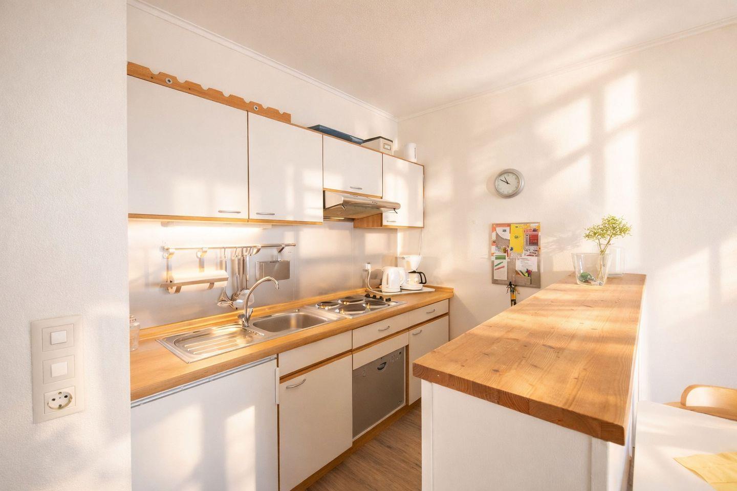 Die im Wohnbereich integrierte, optisch durch einen Tresen abgetrennte Küchenzeile ist kompakt und zugleich vollständig ausgestattet. Backofen, Geschirrspülmaschine, Kaffeemaschine, Toaster, Wasserkocher, ein 4-Platten-Herd sowie eine Kühl-Gefrierkombination stehen Ihnen zur Verfügung und ermöglichen eine komfortable Selbstversorgung. Der angrenzende Essbereich bietet den idealen Platz für gemeinsame Mahlzeiten oder ein gemütliches Frühstück vor einem erlebnisreichen Tag am Meer.