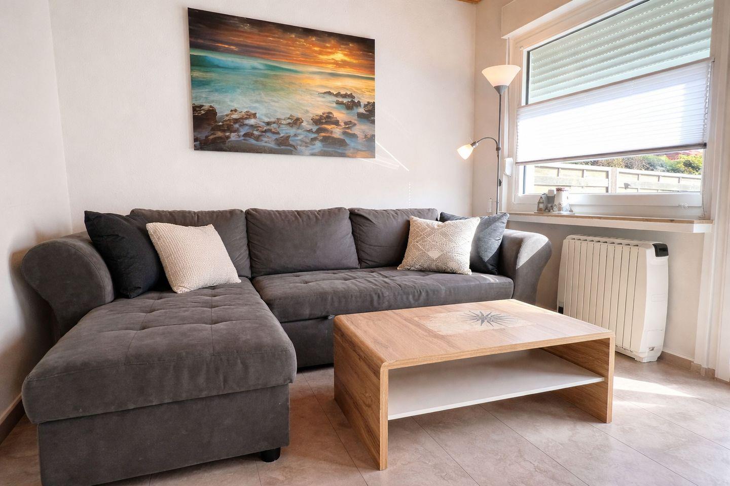 Schillig Reede: gemütliches 47 m² Ferienhaus mit 3 Zimmern, 2 Schlafzimmern und 1 Bad mit bodengleicher Dusche. Offene Küche zum Wohnzimmer mit Cerankochfeld, Backofen, Spülmaschine, Mikrowelle und Gefrierfach. Terrasse, Gartenmöbel und Sonnenschirm, WLAN, Waschmaschine, 2 kostenlose Privatparkplätze. Nichtraucher, Kinder willkommen, max. 1 Haustier. Sandstrand ca. 400 m, Restaurant 500 m.