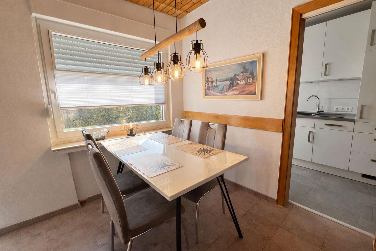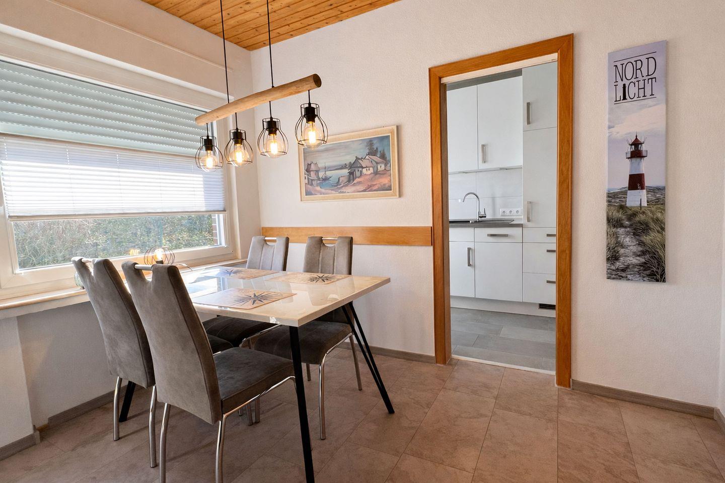 Der helle Wohn- und Essbereich bildet das Herzstück des Hauses und lädt mit seiner freundlichen Atmosphäre zum Verweilen ein. Ein Smart-TV sorgt für Unterhaltung an entspannten Abenden, während Sie vom Wohnbereich aus direkt auf die einladende Terrasse mit angrenzendem Garten gelangen. Hier können Sie den Tag mit einem Frühstück an der frischen Luft beginnen, die Sonne genießen oder den Abend ganz entspannt ausklingen lassen. Die moderne, separate Küchenzeile schließt sich direkt an den Essbereich an und ist bestens ausgestattet. Backofen, Ceranfeld, Kühlschrank mit Gefrierfach, Mikrowelle, Wasserkocher, Kaffeemaschine und Toaster stehen Ihnen zur Verfügung, sodass Sie Ihre Mahlzeiten ganz bequem selbst zubereiten können.