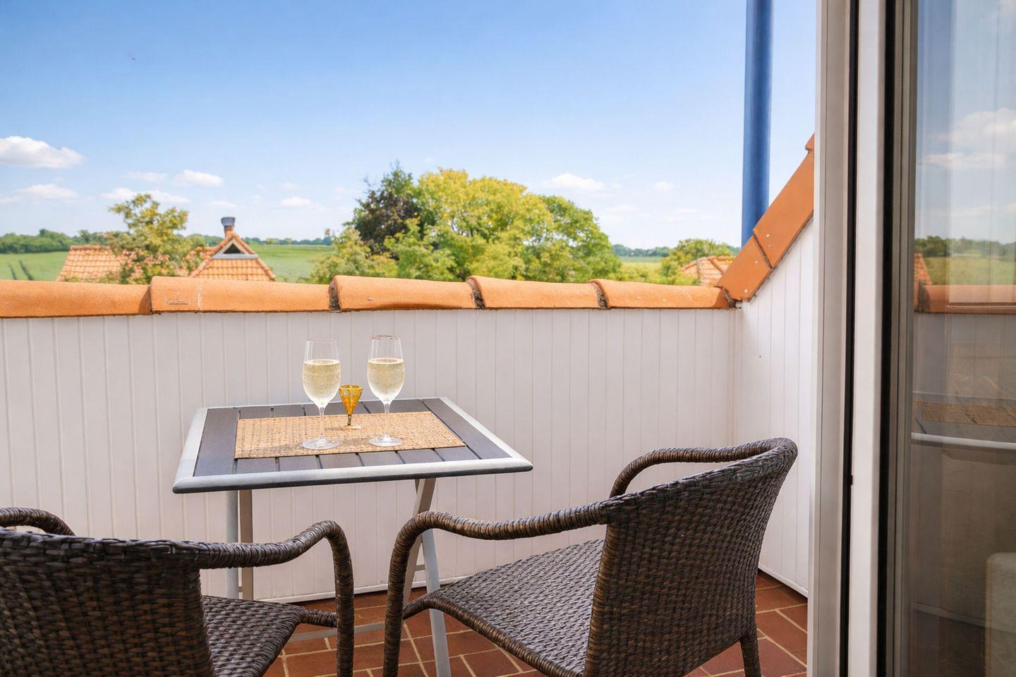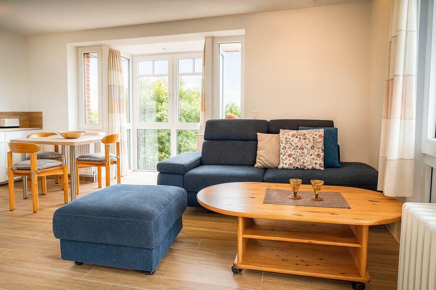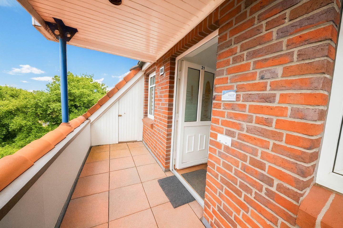 Die lichtdurchflutete, liebevoll eingerichtete Maisonettewohnung bietet auf zwei Ebenen perfekten Wohnkomfort für zwei Personen und verbindet zentrale Lage mit wohltuender Ruhe – nur etwa 250 Meter vom großen Sandstrand entfernt. Das Apartment befindet sich im zweiten Obergeschoss am Ende eines Laubengangs und empfängt Sie im unteren Bereich mit einem großzügigen Wohnraum, der durch ein gemütliches Sofa und eine moderne, vollständig ausgestattete Küche besticht. Hier stehen Ihnen ein Cerankochfeld, Backofen, Geschirrspüler, Kühlschrank mit Gefrierfach, Toaster, Wasserkocher und Kaffeemaschine zur Verfügung. Der angrenzende Essbereich lädt zu entspannten Mahlzeiten ein, während der Balkon direkt vom Wohnbereich aus erreichbar ist und den idealen Platz bietet, um den Tag in angenehmer Atmosphäre ausklingen zu lassen. Ein helles Tageslichtbad mit Dusche und WC rundet das Angebot auf dieser Ebene ab. Über eine Treppe gelangen Sie in den separaten Schlafbereich der oberen Etage, wo ein komfortables Doppelbett für erholsame Nächte sorgt. Ein eigener PKW-Stellplatz am Haus steht Ihnen ebenfalls zur Verfügung.