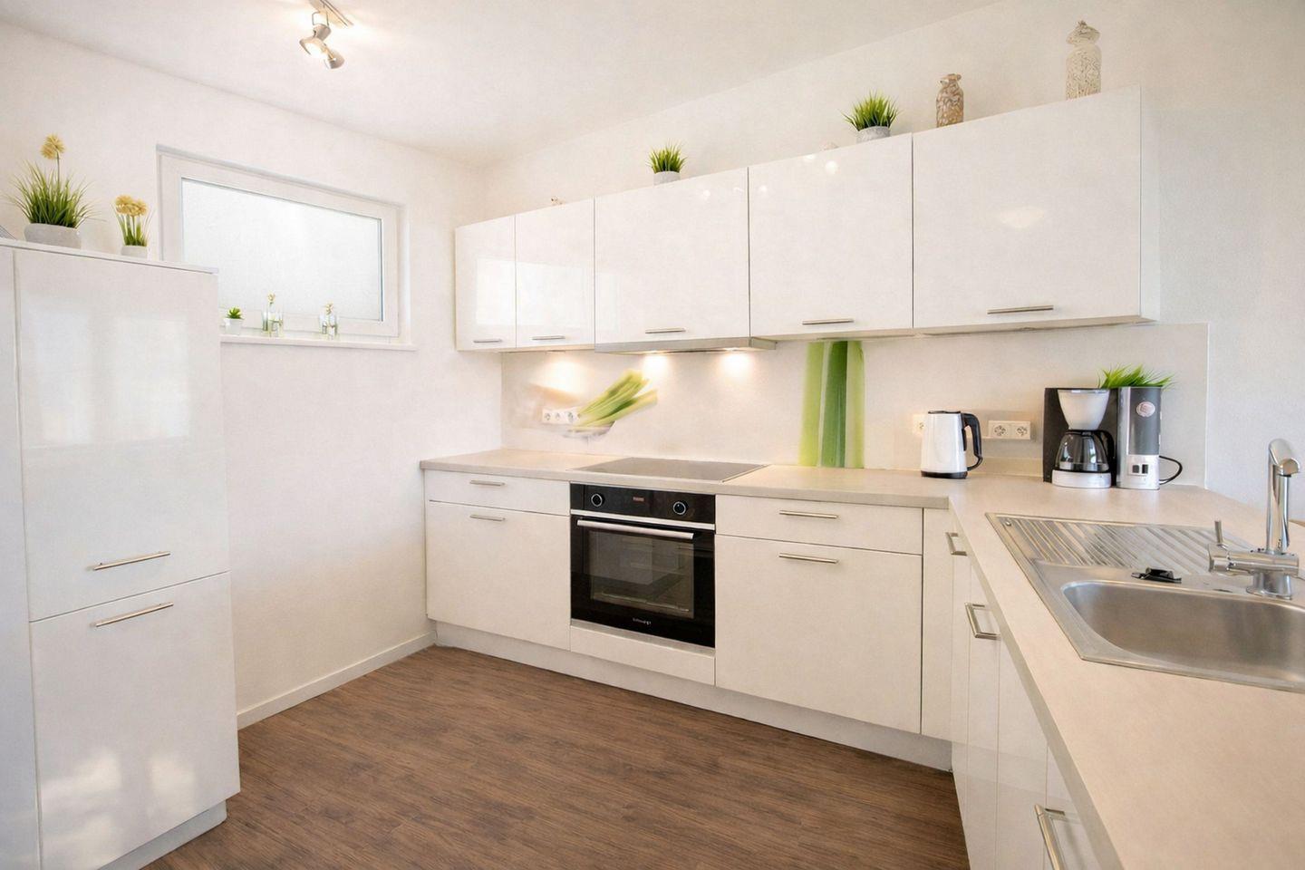 Der modern gestaltete Küchenbereich ist offen in den Wohn- und Essbereich integriert und mit einer hochwertigen Einbauküche ausgestattet, die keine Wünsche offenlässt. Geschirr, Besteck, Gläser sowie Töpfe und Pfannen stehen selbstverständlich zur Verfügung, sodass Sie sich im Urlaub ganz flexibel selbst versorgen können. Bitte beachten Sie, dass Gebrauchs- und Verbrauchsmittel wie Spülmaschinentabs oder Toilettenpapier lediglich als Starterpaket bereitgestellt werden und während Ihres Aufenthalts von Ihnen selbst ergänzt werden müssen. Das separate Schlafzimmer überzeugt mit einem modernen Doppelbett, stilvollen Nachtkonsolen und einem geräumigen Kleiderschrank. Die hochwertige Einrichtung und gezielt gesetzte Lichtquellen schaffen hier eine besonders angenehme Wohlfühlatmosphäre. Ein weiterer Fernseher im Schlafzimmer sorgt für zusätzlichen Komfort und Rückzugsmöglichkeiten.