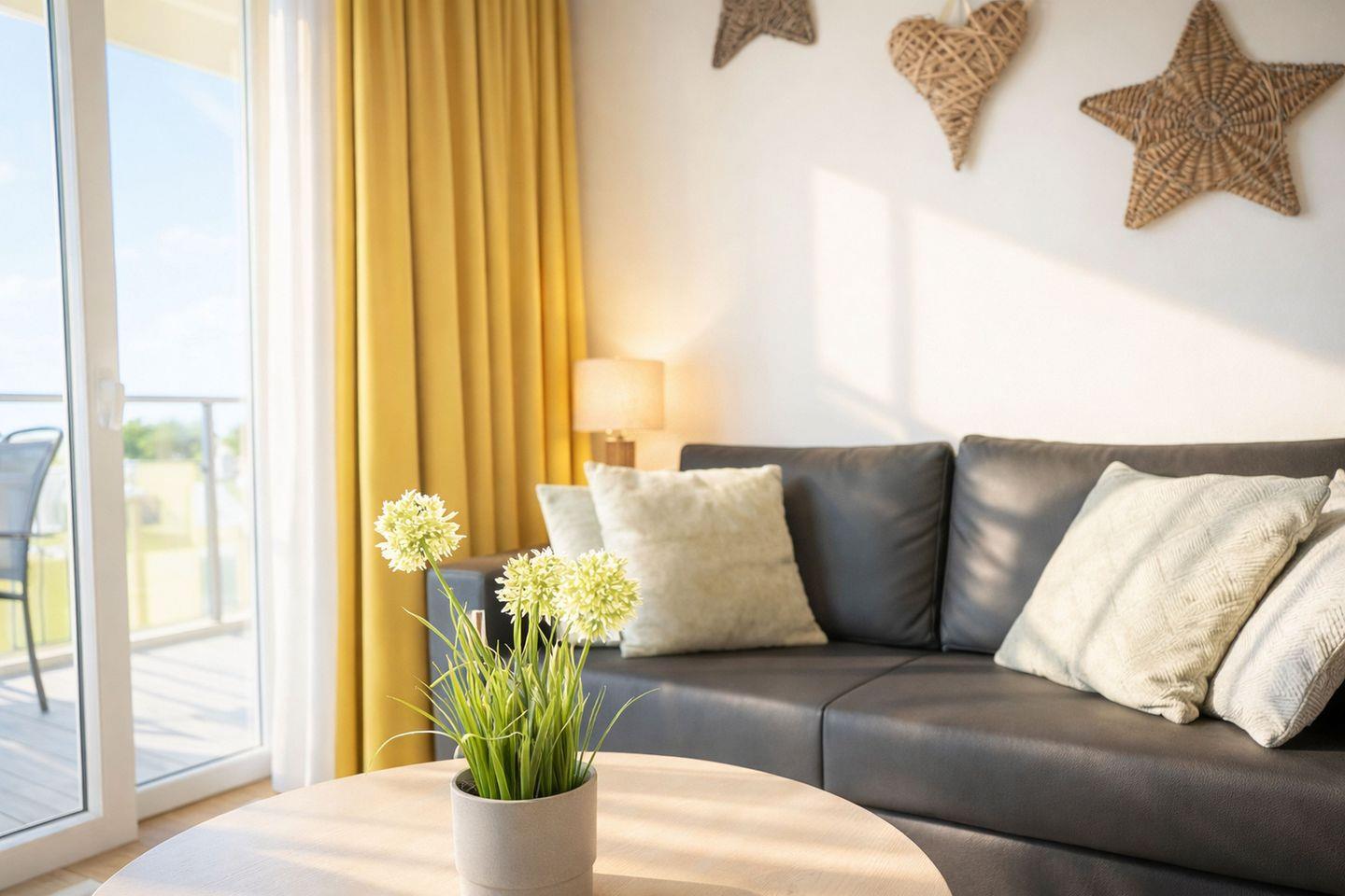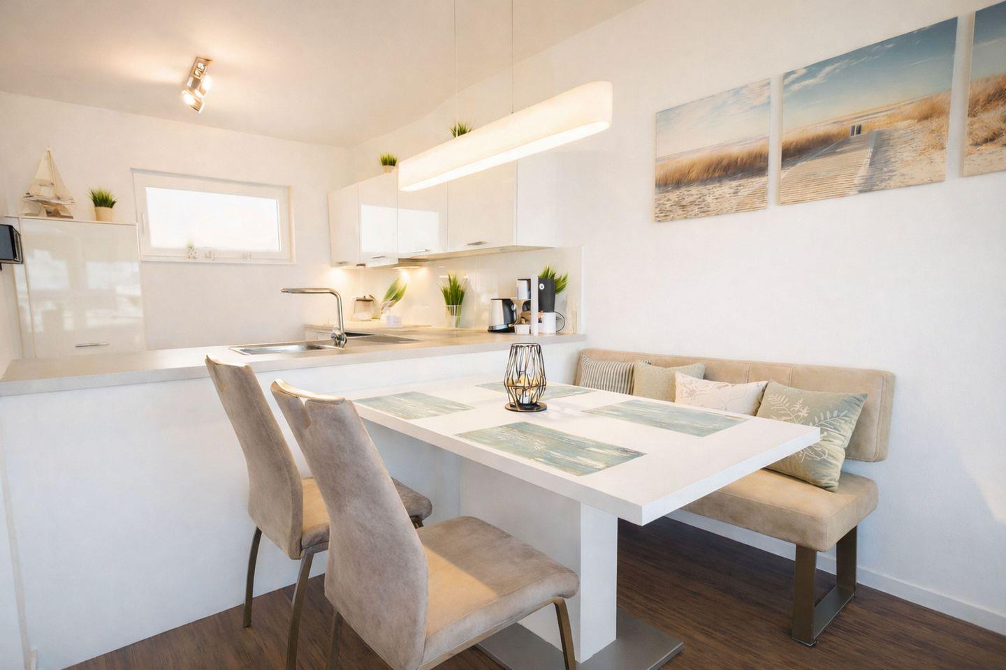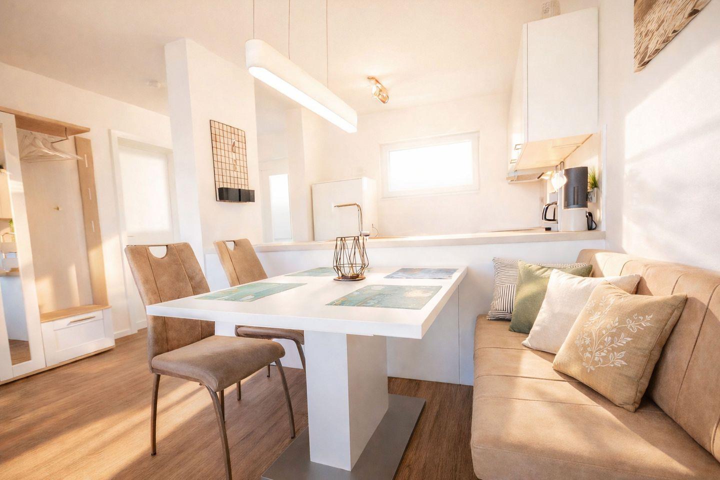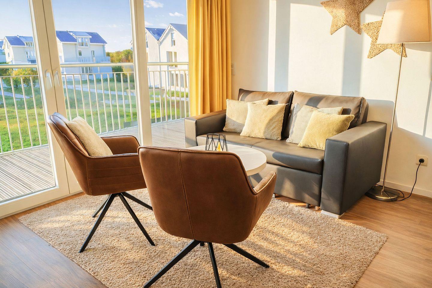 In dieser modernen und großzügig geschnittenen Ferienwohnung erwartet Sie ein stilvolles Zuhause auf Zeit, das Gemütlichkeit und hohen Anspruch harmonisch miteinander verbindet. Schon beim Betreten spüren Sie die helle, freundliche Atmosphäre des offen gestalteten Wohnbereichs, der mit einem komfortablen Schlafsofa, einem Couchtisch und zwei bequemen Sesseln zum Entspannen einlädt. Dank des Schlafsofas eignet sich die Wohnung ideal für einen Aufenthalt mit bis zu vier Personen und bietet ausreichend Platz für gemeinsame Urlaubstage. Ein Fernseher mit Satellitenempfang sorgt für Unterhaltung und gemütliche Abende, ganz gleich, ob nach einem erlebnisreichen Tag oder bei nordischem Schietwetter.
