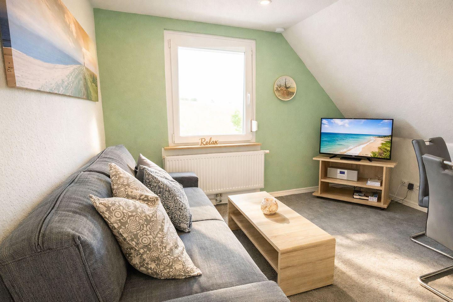 Das Ferienappartement Baltrum bietet auf rund 40 Quadratmetern alles, was Sie für einen entspannten Aufenthalt benötigen. Die Wohnung befindet sich im Obergeschoss eines gepflegten Mehrfamilienhauses, dem charmanten Alten Fischerhaus, und ist mit viel Liebe zum Detail eingerichtet. Sie eignet sich ideal für bis zu drei Personen und überzeugt durch ihre gemütliche, helle Atmosphäre. Die bequeme Couch lädt tagsüber zum Lesen, Entspannen oder Träumen ein und lässt sich am Abend mit wenigen Handgriffen in ein komfortables Bett mit einer Liegefläche von 140 x 200 Zentimetern verwandeln, auf dem man auch problemlos mehrere Nächte angenehm schlafen kann. Die kompakte, aber durchdacht ausgestattete Küchenzeile verfügt über ein modernes 2er-Induktions-Ceranfeld, einen Geschirrspüler, eine Kaffeemaschine, einen Wasserkocher sowie einen freistehenden Kühlschrank mit Gefrierfach, sodass Sie sich jederzeit bequem selbst versorgen können. Für Unterhaltung sorgen ein 32-Zoll-Flachbildfernseher mit integriertem SAT-Receiver und DVD-Player, ein kleines Radio sowie kostenfreies WLAN, damit Sie auch im Urlaub bestens vernetzt bist.