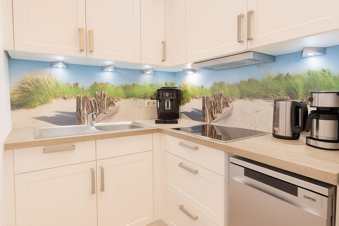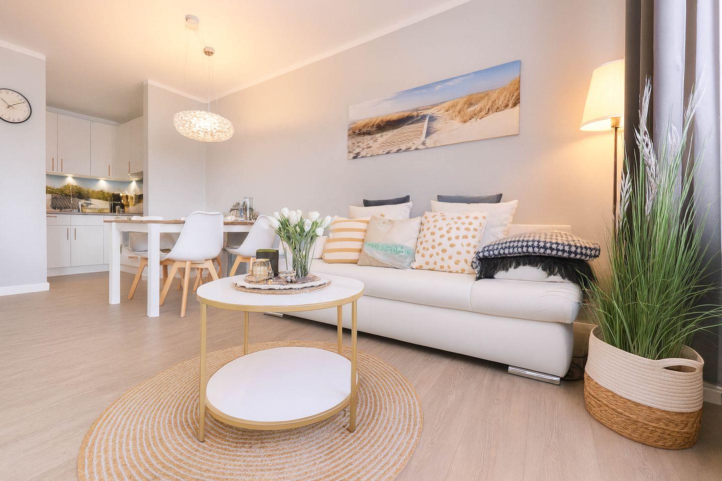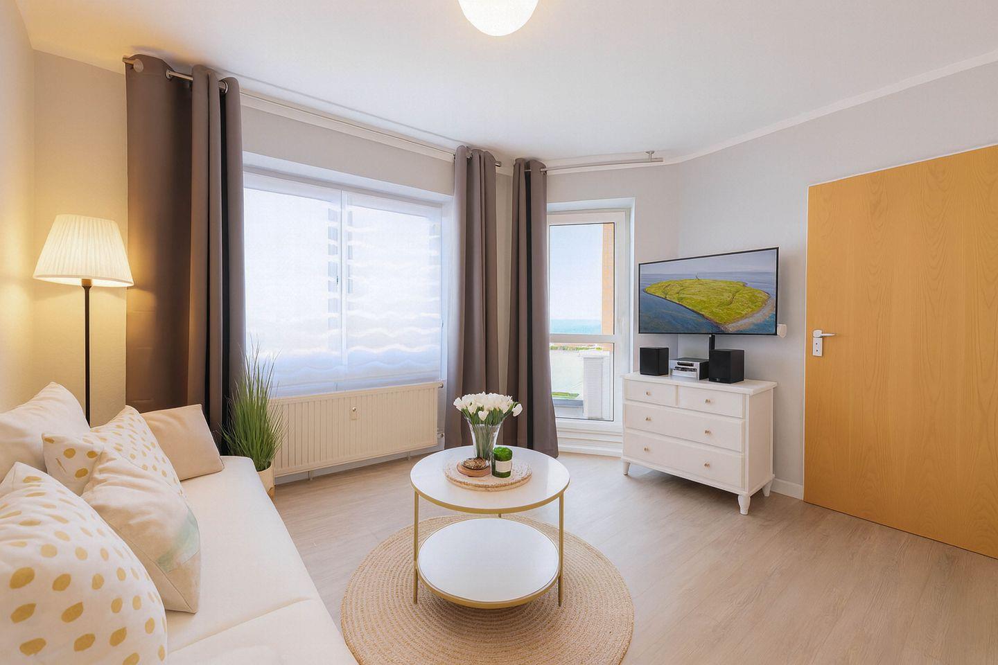 Die moderne Küchenzeile ist vollständig ausgestattet und lässt keine Wünsche offen. Sie verfügt über eine Geschirrspülmaschine, eine Mikrowelle, einen Herd, einen Kühlschrank mit Gefrierfach sowie einen Wasserkocher und einen Toaster. Ein hochwertiger Kaffeevollautomat der Marke De’Longhi sorgt für genussvolle Kaffeemomente zu jeder Tageszeit. Der helle Wohnbereich lädt zum Entspannen ein und bietet einen direkten Zugang zum Balkon, auf dem Sie morgens bei frischer Meeresluft entspannt frühstücken oder den Tag ausklingen lassen können.