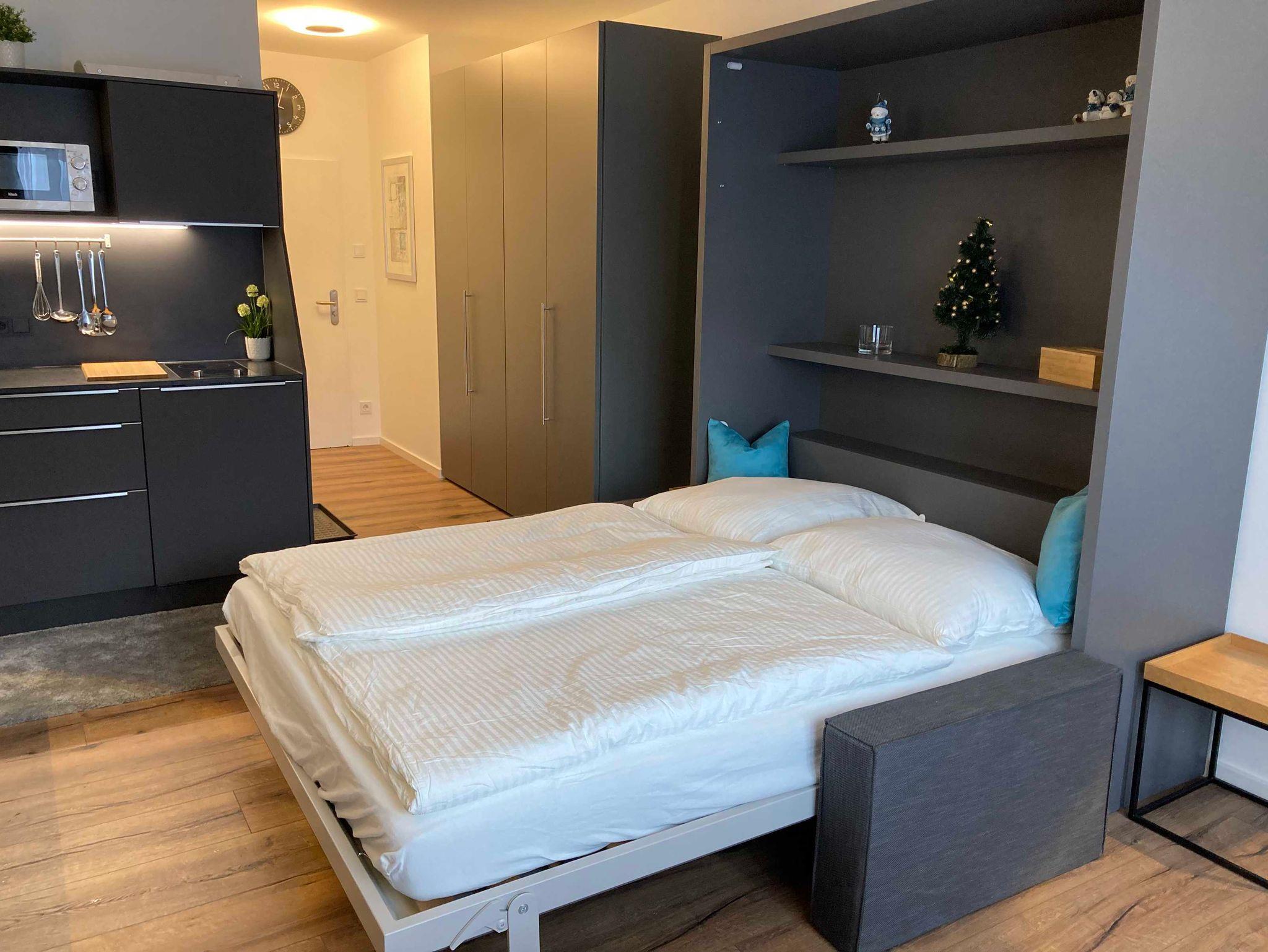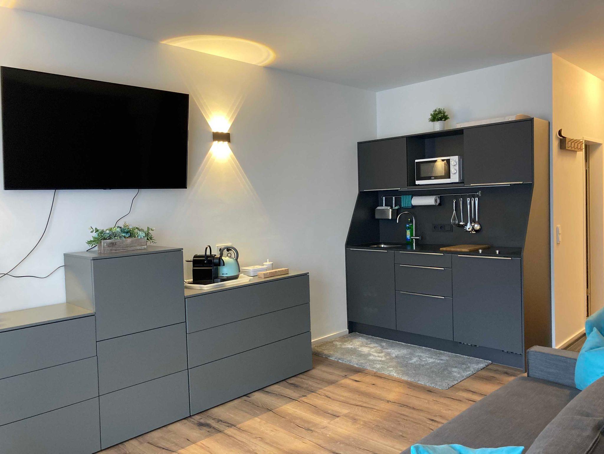 sehr schöne Einraum - Ferienwohnung (ca. 30 m2) mit vollausgestatteter Küche, kleinem Bad mit Walk-in-Dusche, Doppelbett (160 x 200), Essplatz und Südwestterrasse im EG mit Weber-Gasgrill,
