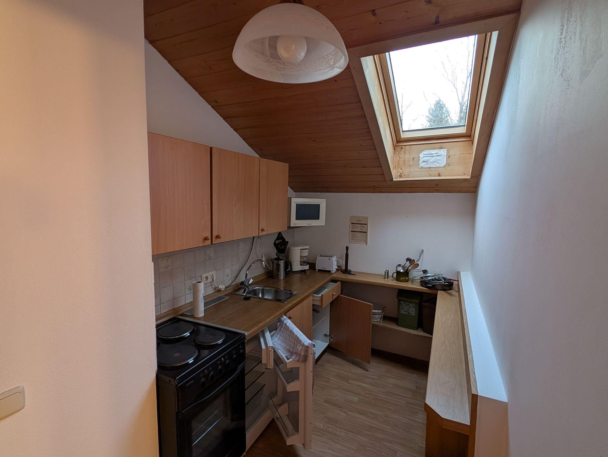 Gute neue Ausstattung. Küchenzeile mit Kühlschrank, Herd und Mikrowelle.