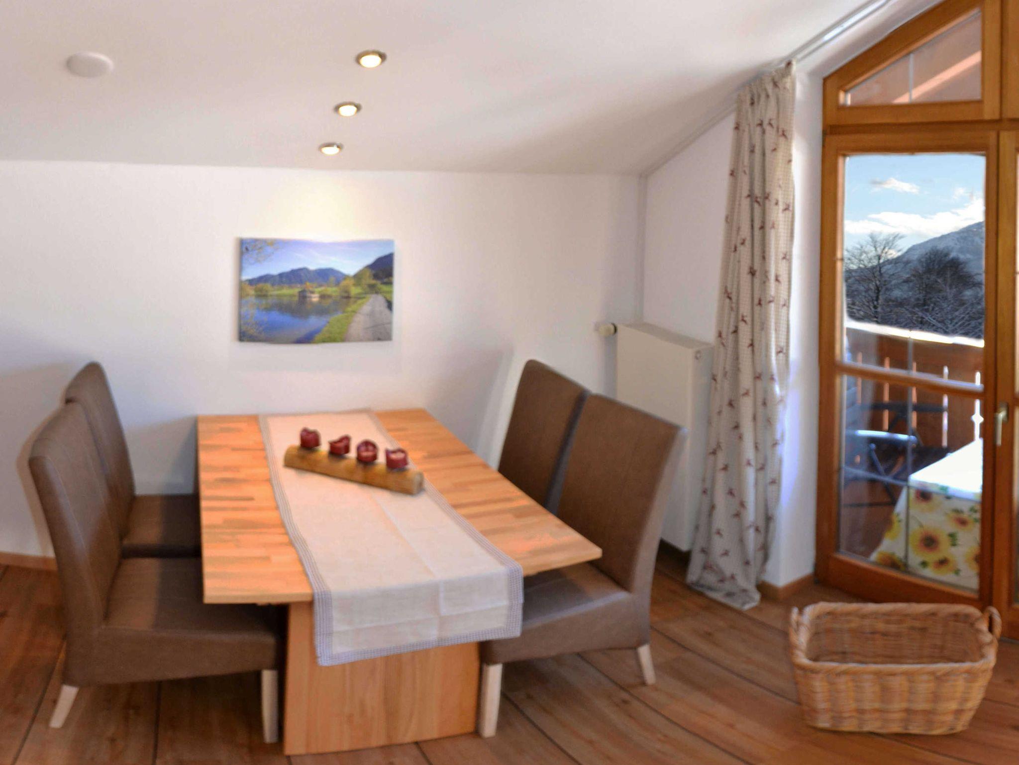 Der wind-und wettergeschützte Südbalkon mit herrlicher Aussicht auf die Schlierseer Berge ist mit Tisch und Stühlen bestückt.