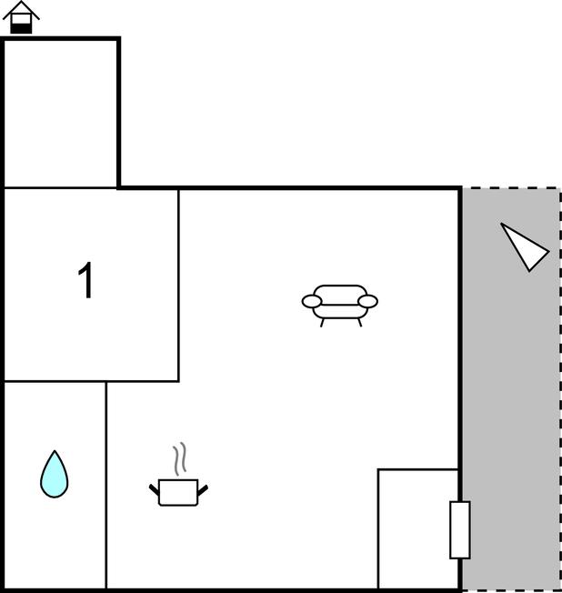 Dette feriehus' indretning er praktisk og meget hyggelig. Ud over soveværelset er der sovepladser i opholdsstuen. Der hører desuden en skøn terrasse til huset hvor der er god plads til at servere dagens måltider.