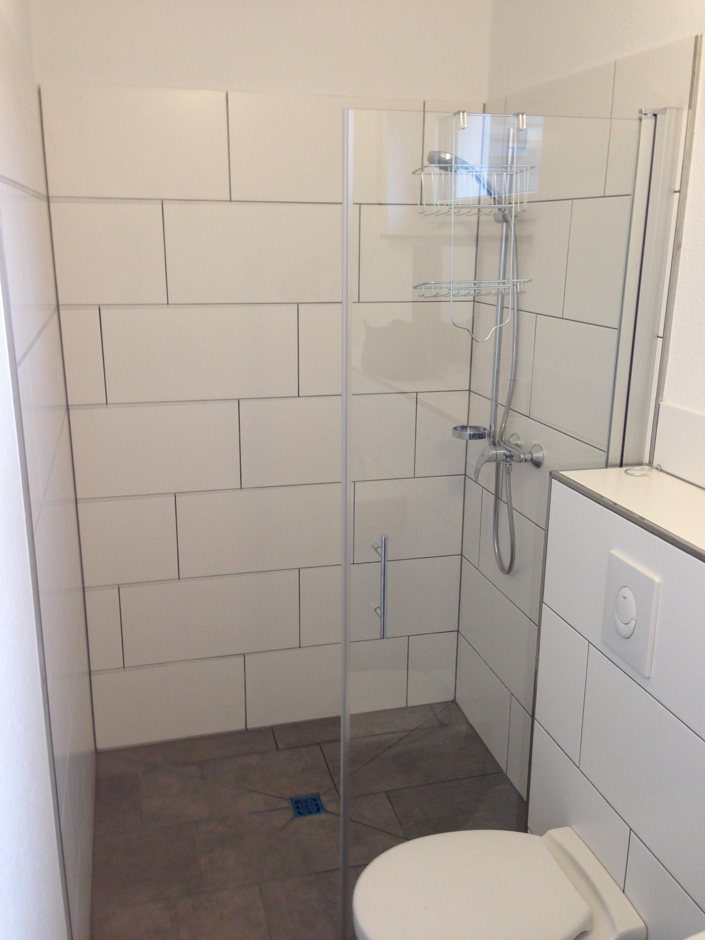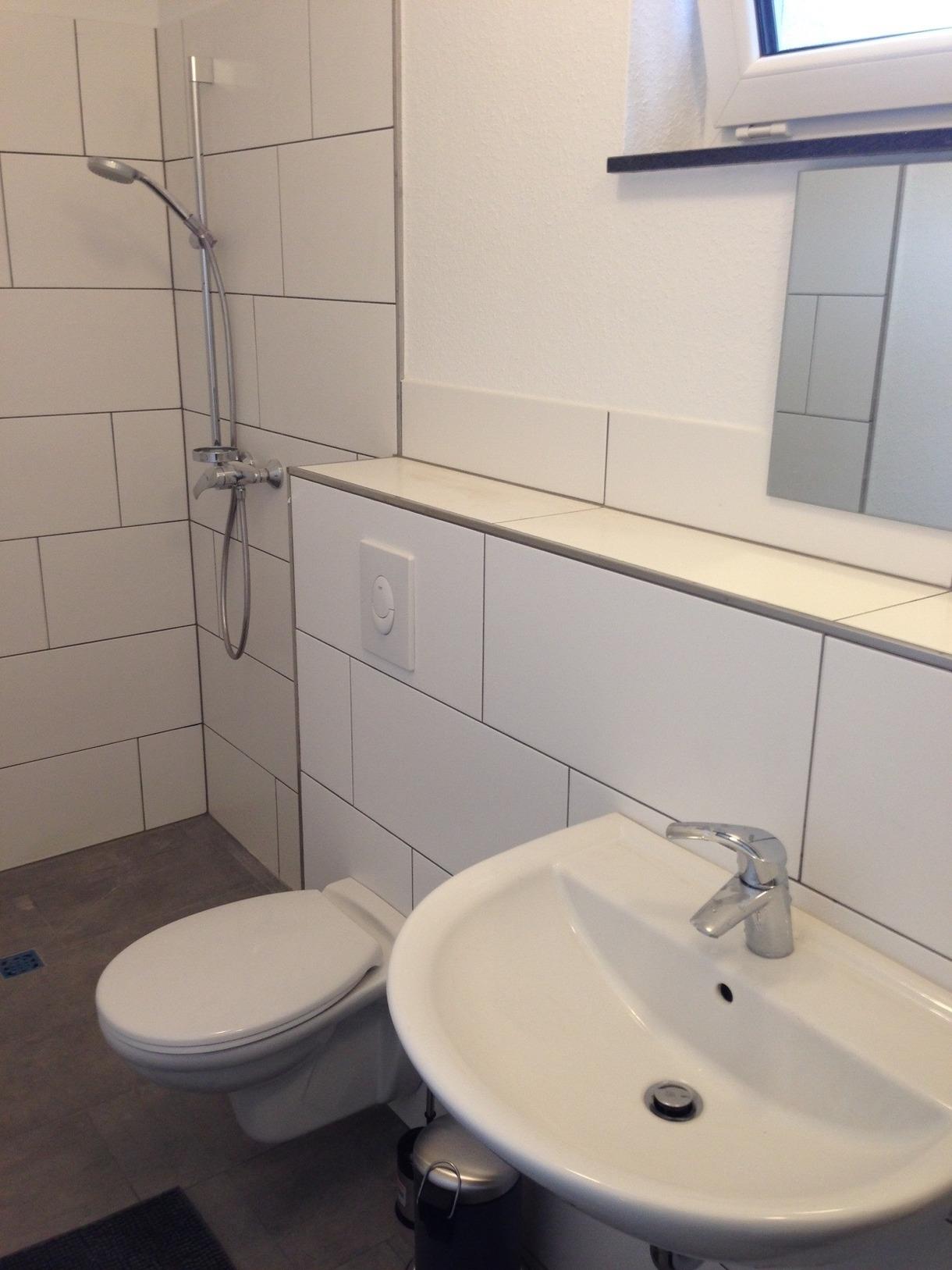 Ausstattung Bad: WC, Waschbecken und Dusche.