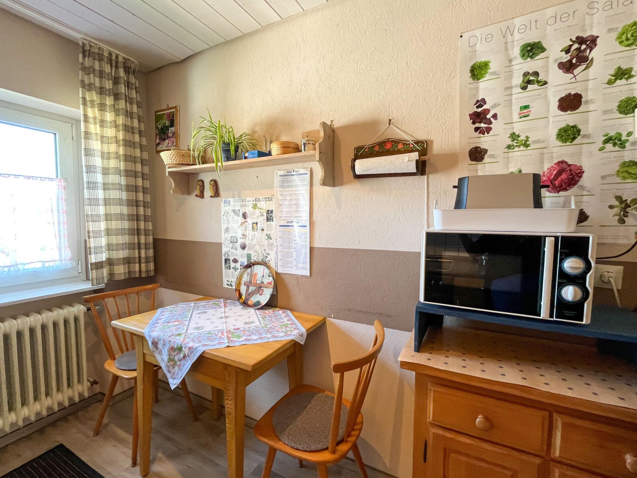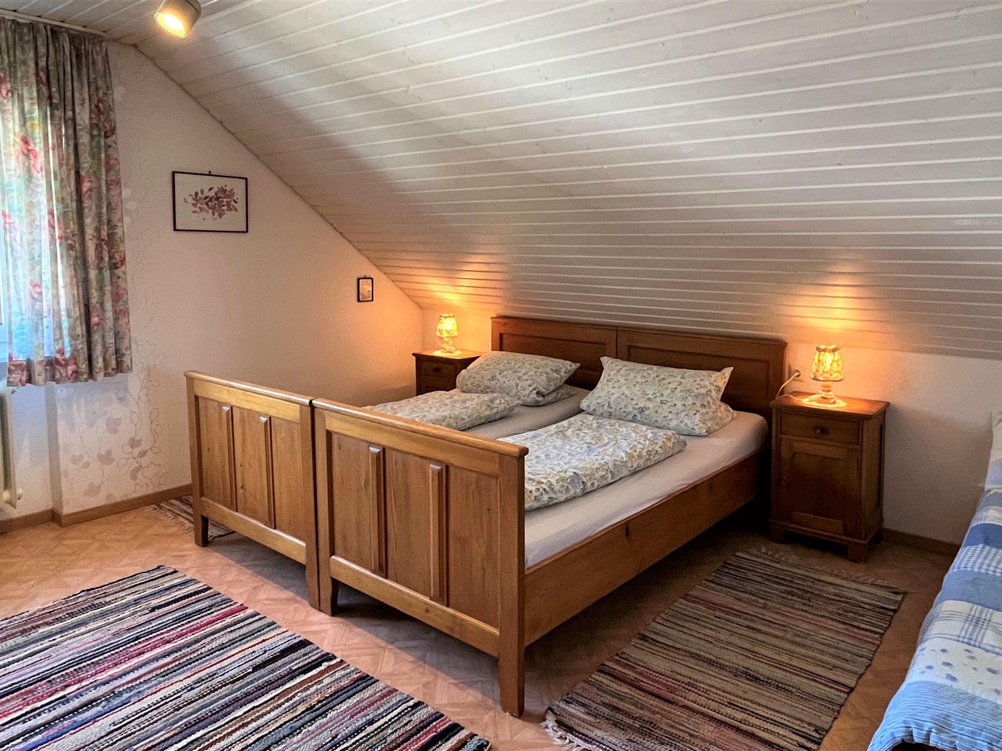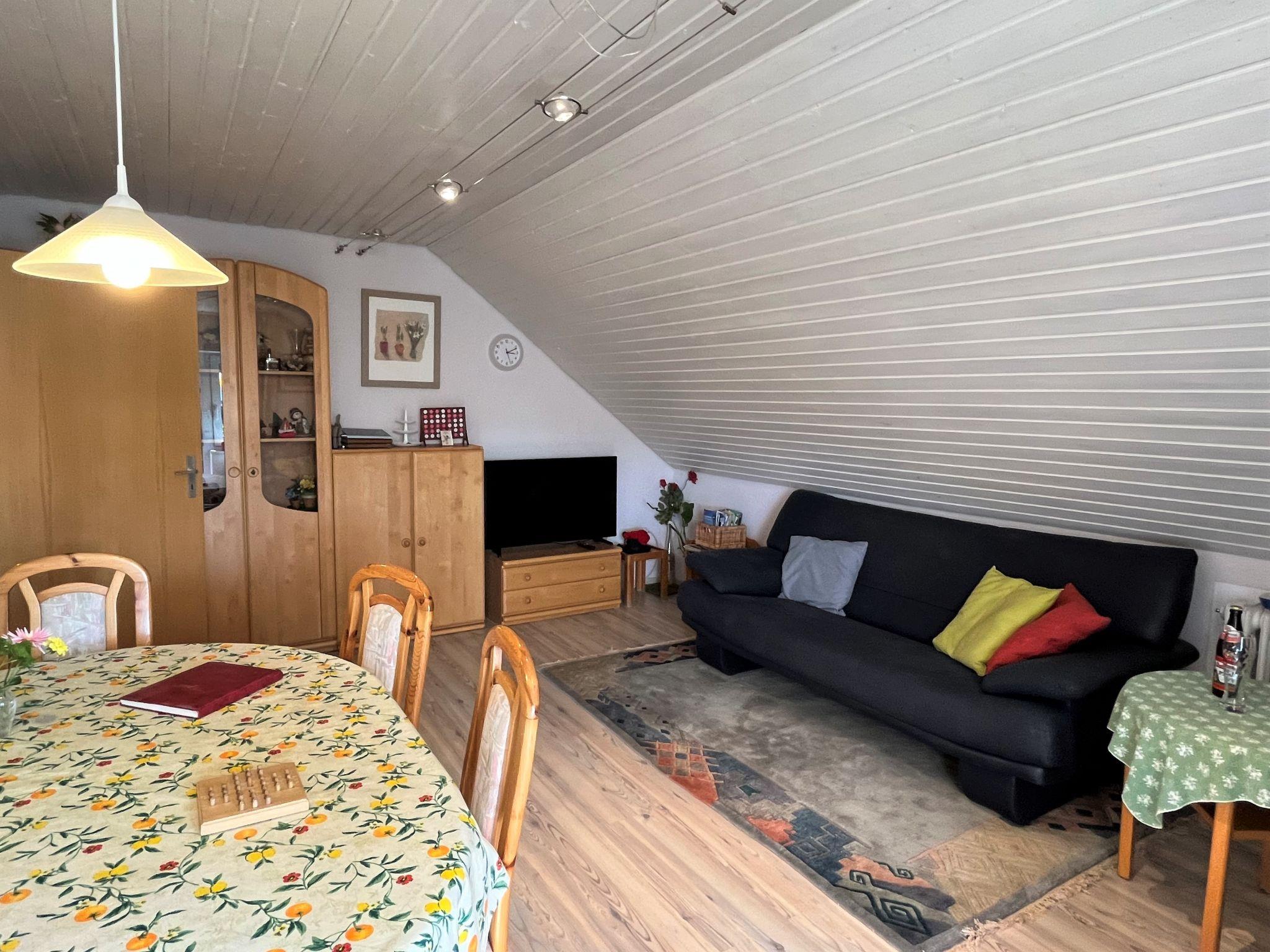 "Schleuniger", 3-room apartment 55 m2 on 1st floor. Simple and cosy furnishings: living/dining room with satellite TV. Exit to the balcony. 1 double bedroom. 1 room with 1 double sofabed (140 cm, length 190 cm). Exit to the balcony. Kitchen (oven, dishwasher, 4 ceramic glass hob hotplates, toaster, kettle, microwave, electric coffee machine) with dining table. Shower/WC. Oil heating. Balcony. Balcony furniture. View of the garden. Facilities: children's high chair, baby cot. Internet (WiFi). Please note: non-smokers only.