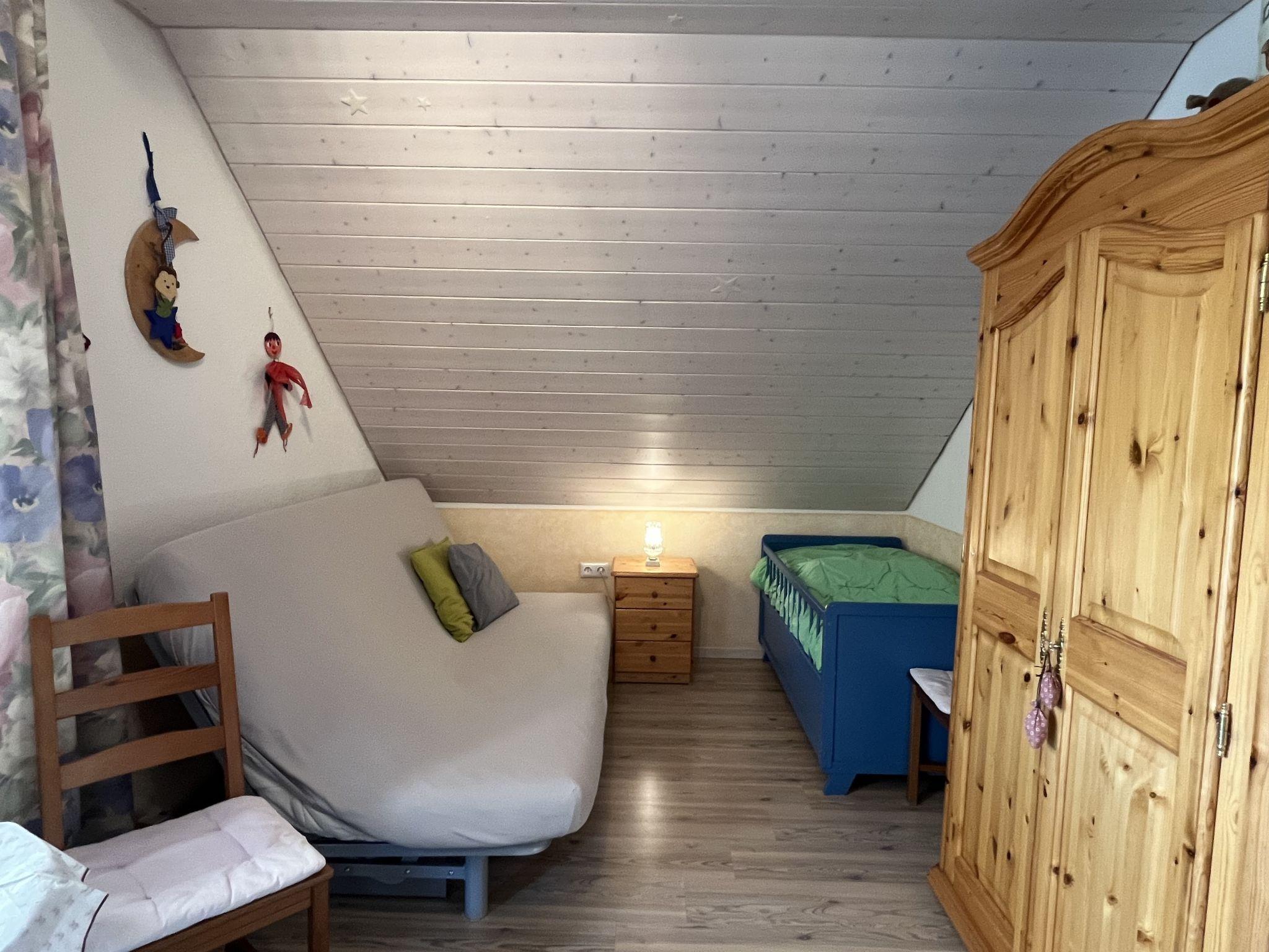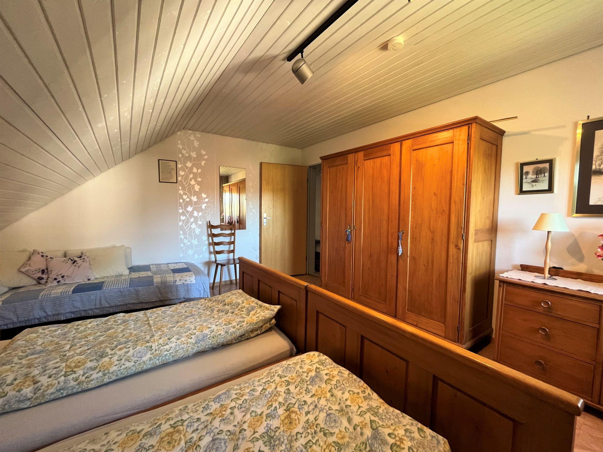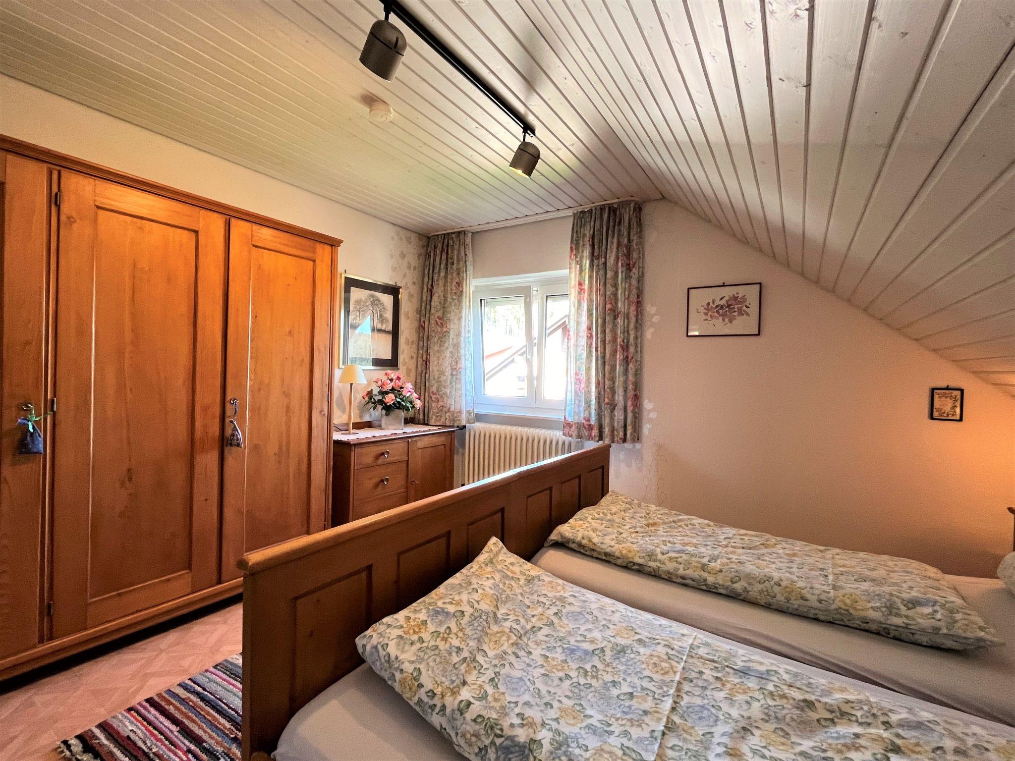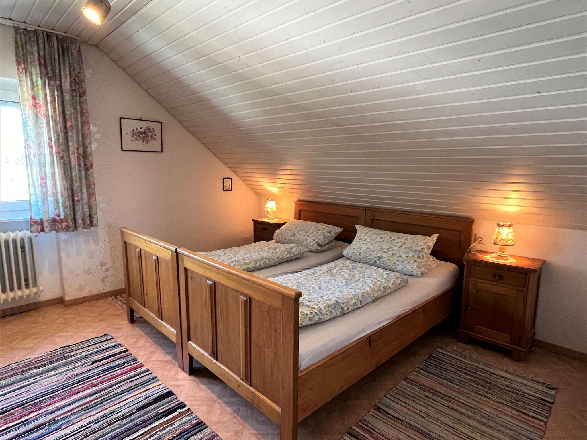 "Schleuniger", 3-room apartment 55 m2 on 1st floor. Simple and cosy furnishings: living/dining room with satellite TV. Exit to the balcony. 1 double bedroom. 1 room with 1 double sofabed (140 cm, length 190 cm). Exit to the balcony. Kitchen (oven, dishwasher, 4 ceramic glass hob hotplates, toaster, kettle, microwave, electric coffee machine) with dining table. Shower/WC. Oil heating. Balcony. Balcony furniture. View of the garden. Facilities: children's high chair, baby cot. Internet (WiFi). Please note: non-smokers only.