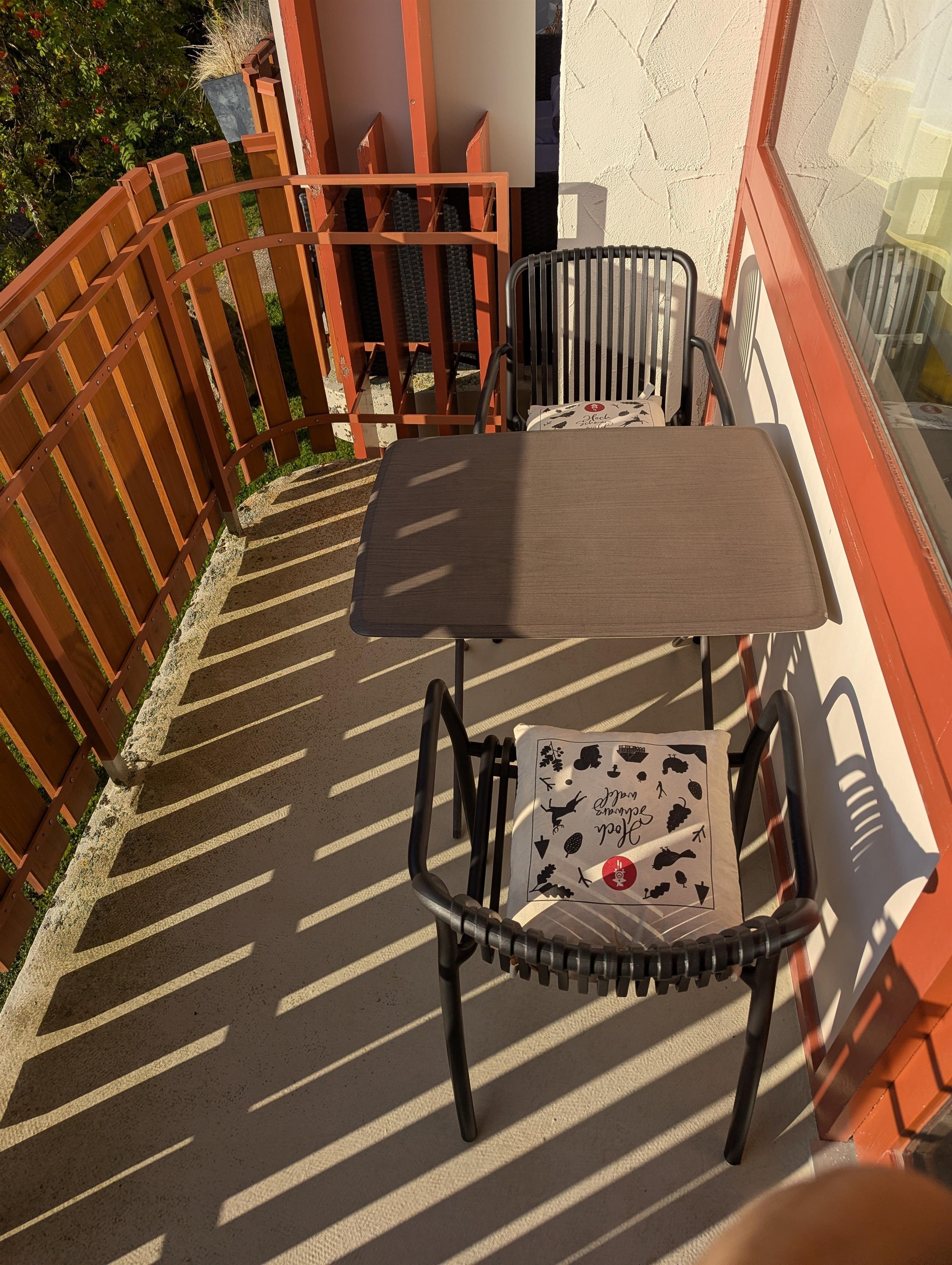 - ein gemütlicher überdachter Balkon mit Sitzmöglichkeiten und