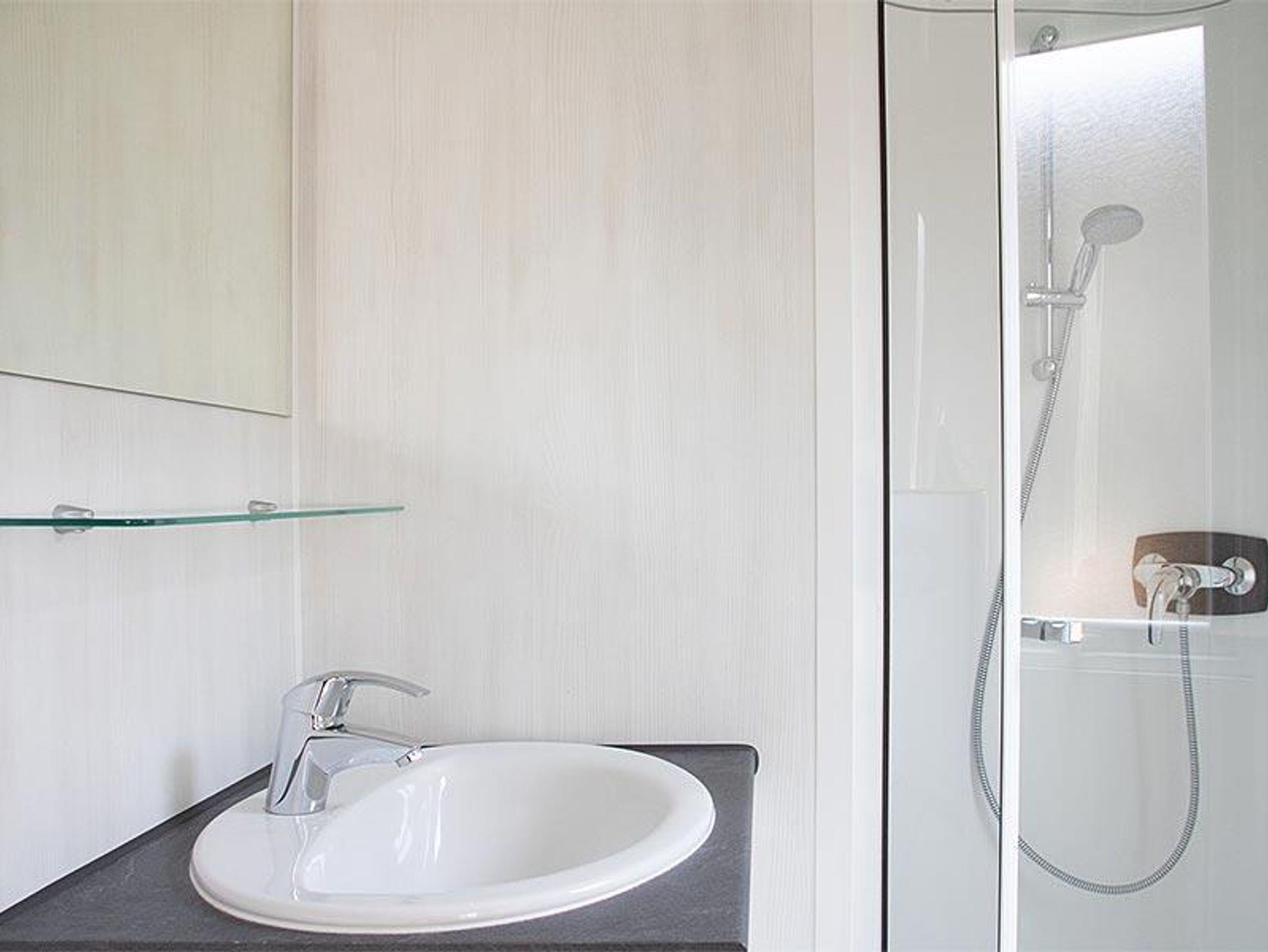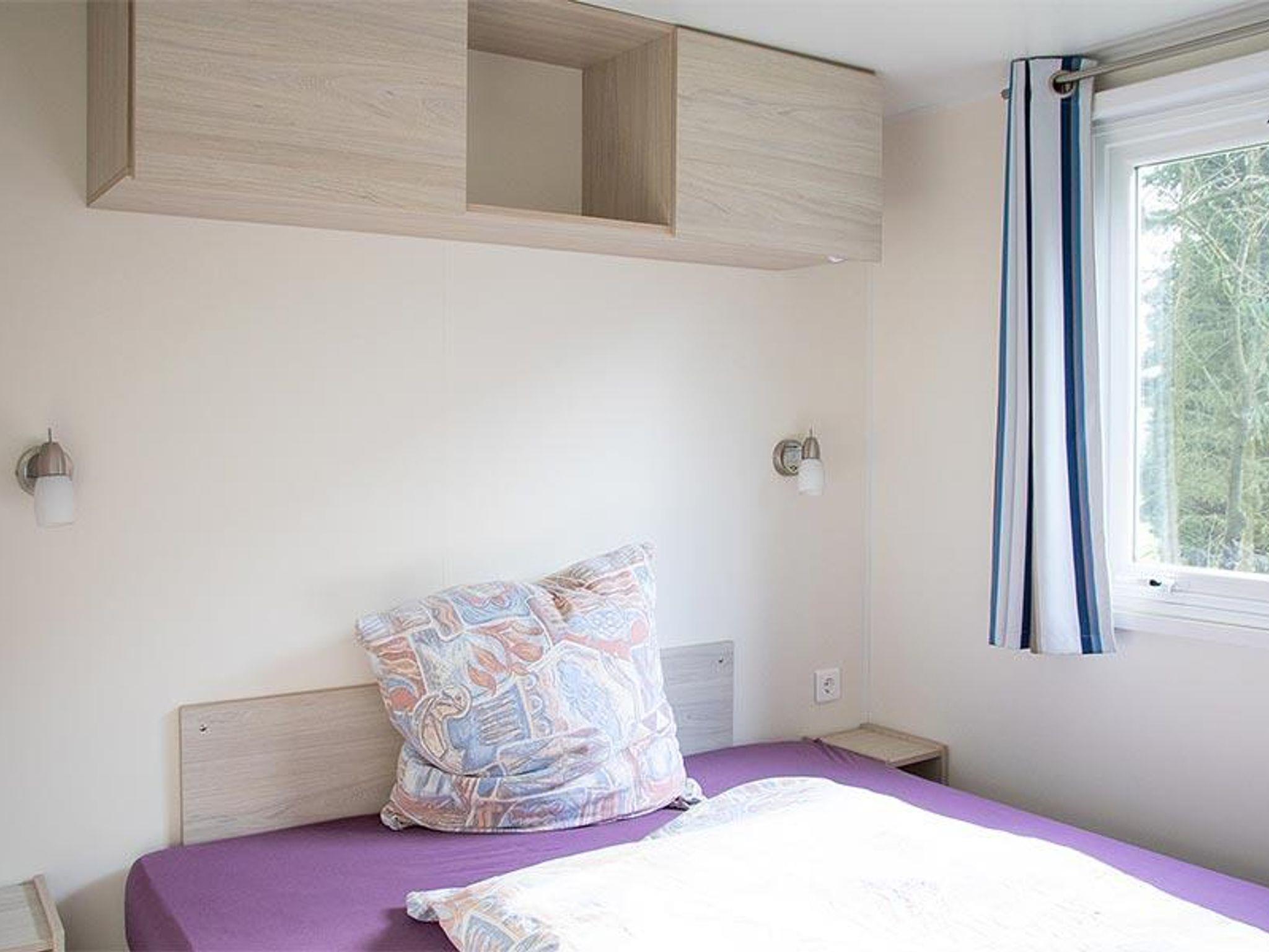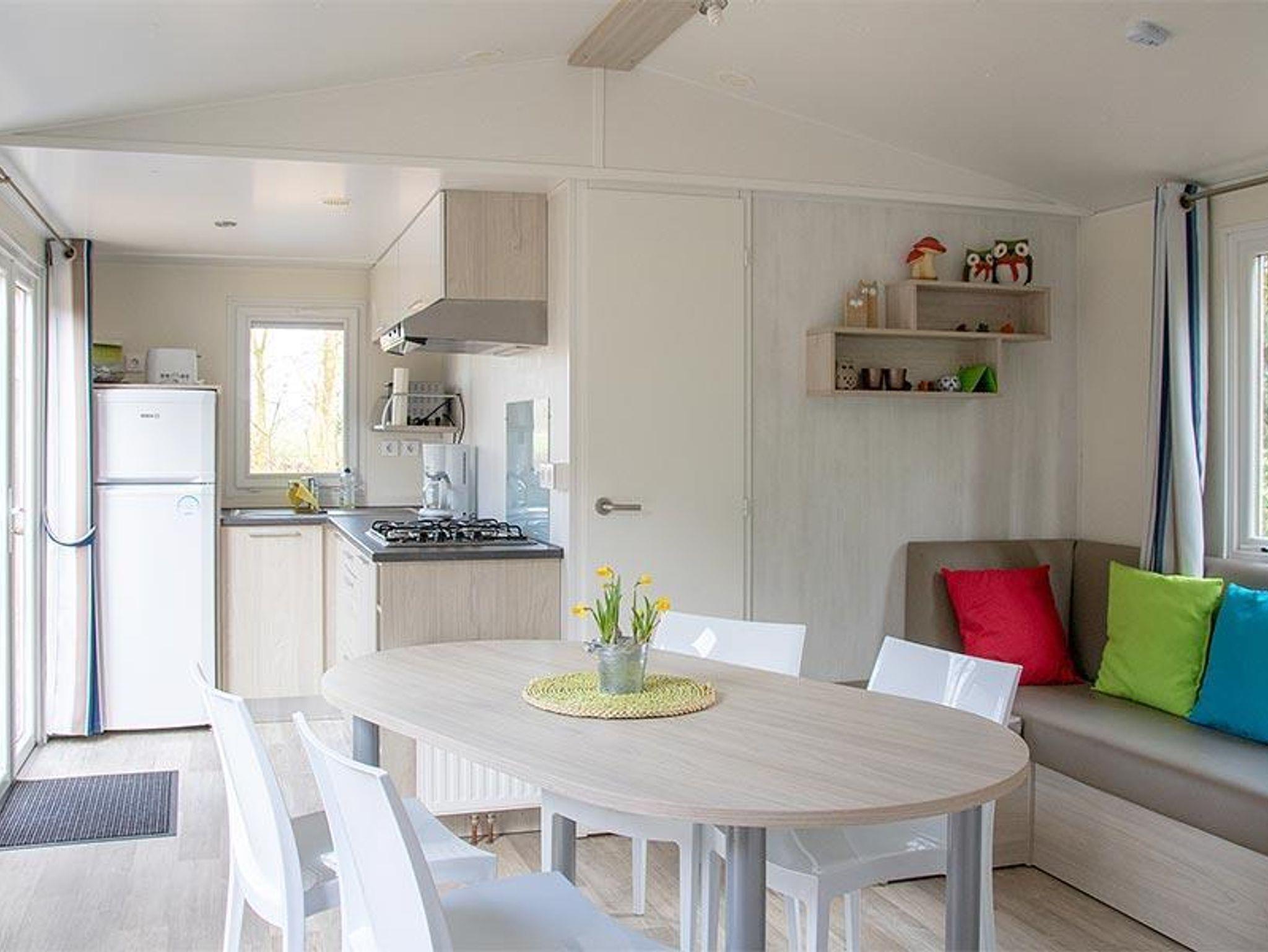 Gemütliches, kleines Mobilheim mit einem Wohnzimmer und integrierter Küchenzeile, einem Schlafzimmer mit Doppelbett, einem Schlafzimmer mit zwei Einzelbetten, separatem WC sowie einer Dusche.